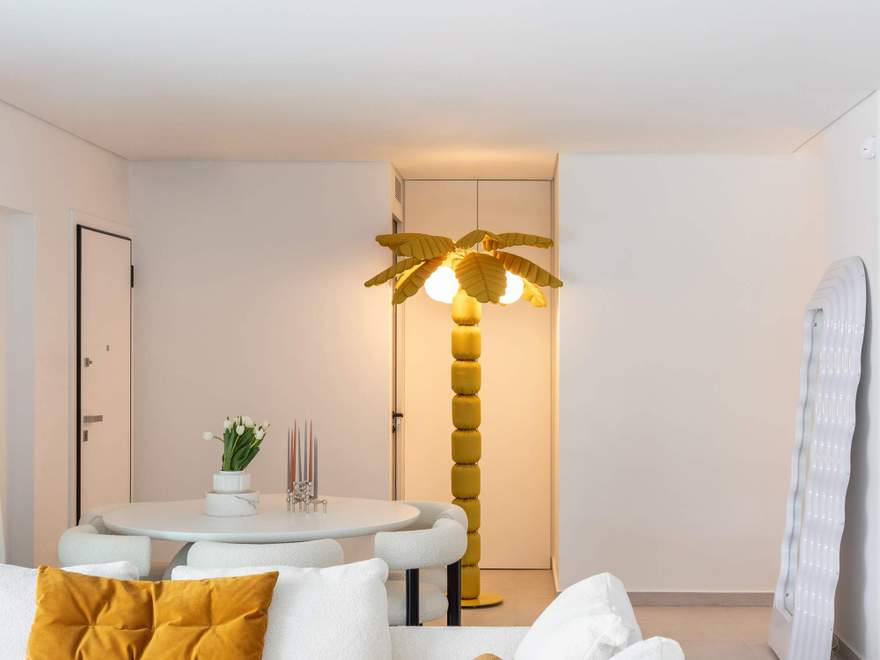Η επιλογή έγινε με βάση το λευκό και την αντίθεση των χρωμάτων, σε ένα εκλεκτό mix διαχρονικών σχεδίων με πρωταγωνιστή τον καναπέ Pixel και χρωματικές πινελιές απο τον καθρέφτη Ultrafragola, το φωτιστικό Melt και την σειρά Bold.