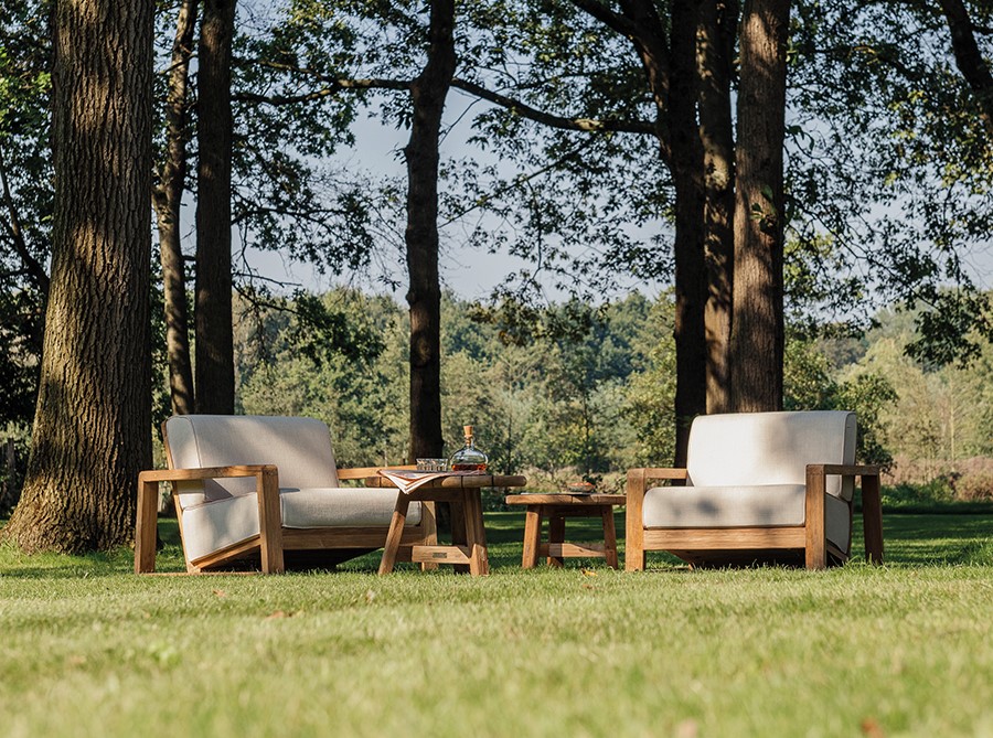 Η συλλογή London περιλαμβάνει καναπέ, πολυθρόνα και τραπεζάκι, με σκελετό σε ξύλο ανακυκλωμένου τικ, ύφασμα Sunbrella και εσωτερικό αφρό quick dry.