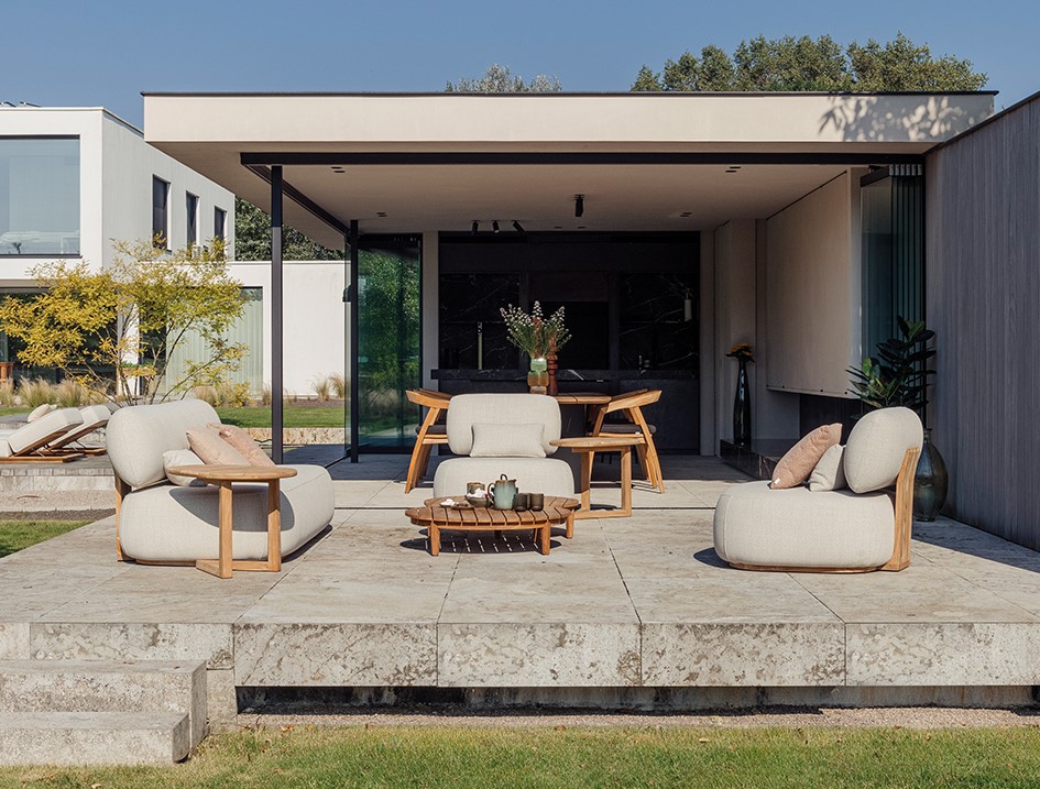 Η συλλογή Ruby περιλαμβάνει καναπέ και πολυθρόνα, με σκελετό σε ξύλο ανακυκλωμένου τικ, ύφασμα Mario Siesta Ecru και εσωτερικό αφρό quick dry.