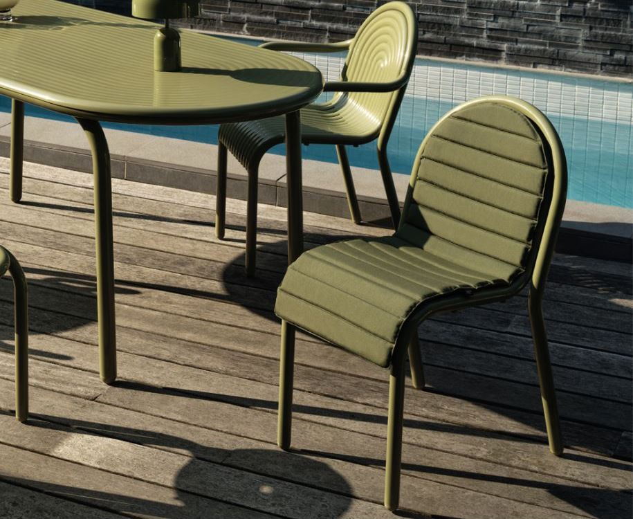 Διατίθεται με έξτρα χρέωση αντιολισθητικό μαξιλαράκι που εξασφαλίζει ότι παραμένει στην καρέκλα και είναι επενδεδυμένο με αδιάβροχο πολυεστερικό ύφασμα που εξασφαλίζει την καταλληλότητά του για εξωτερική χρήση. Είναι ανθεκτικό στην υπεριώδη ακτινοβολία και είναι κατασκευασμένο για να διατηρεί τη σταθερότητα των χρωμάτων του.