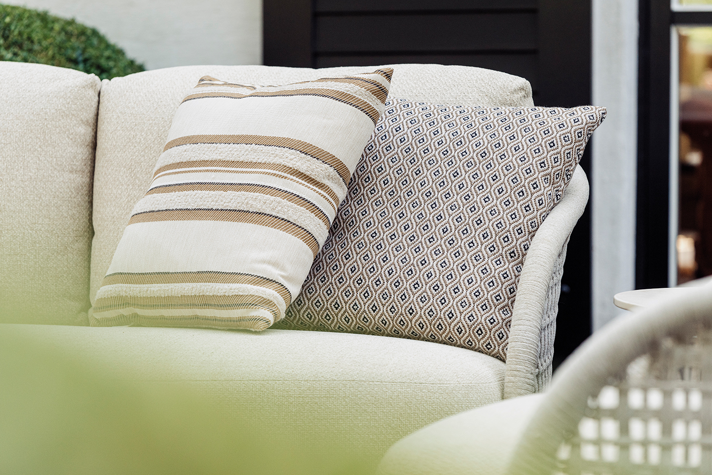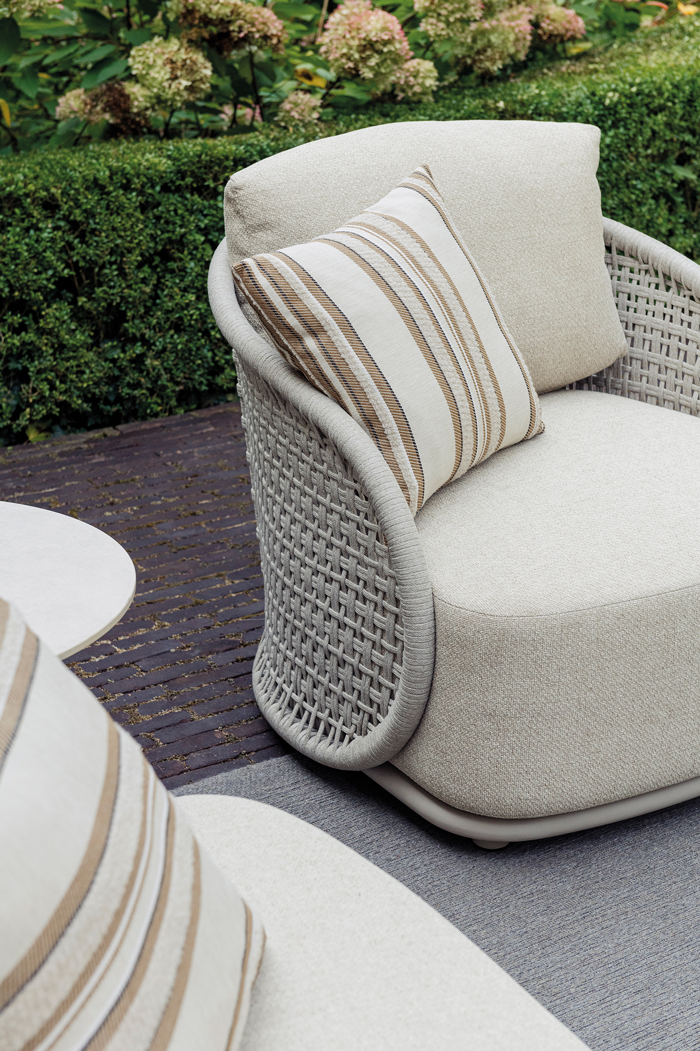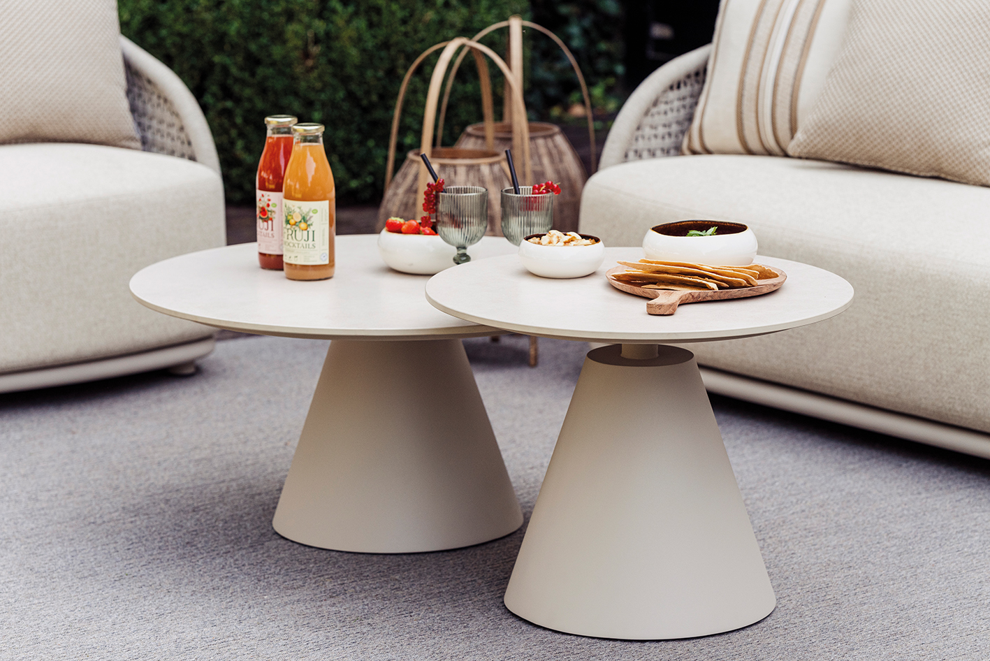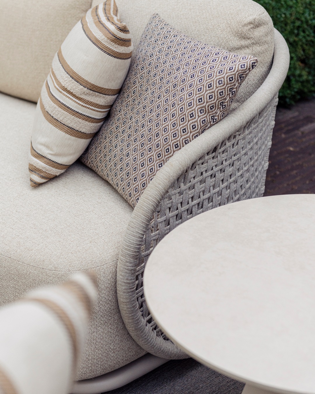 Γνωρίστε την συλλογή Amora, που περιλαμβάνει καναπέ και πολυθρόνα με σκελετό αλουμινίου linnen, σχοινί ανοιχτό γκρί, ύφασμα ανθεκτικό στην ηλιακή ακτινοβολία, εσωτερικό αφρό quick dry και δύο coffee tables με βάση αλουμινίου linnen και λευκή κεραμική επιφάνεια.