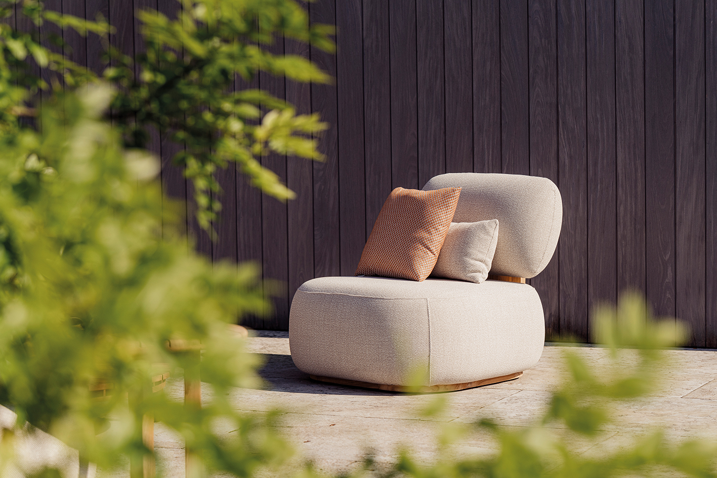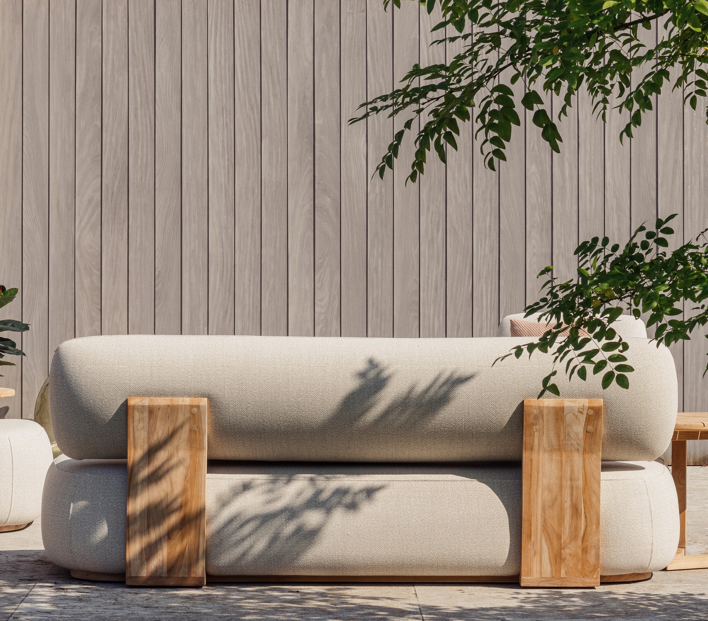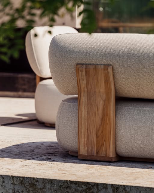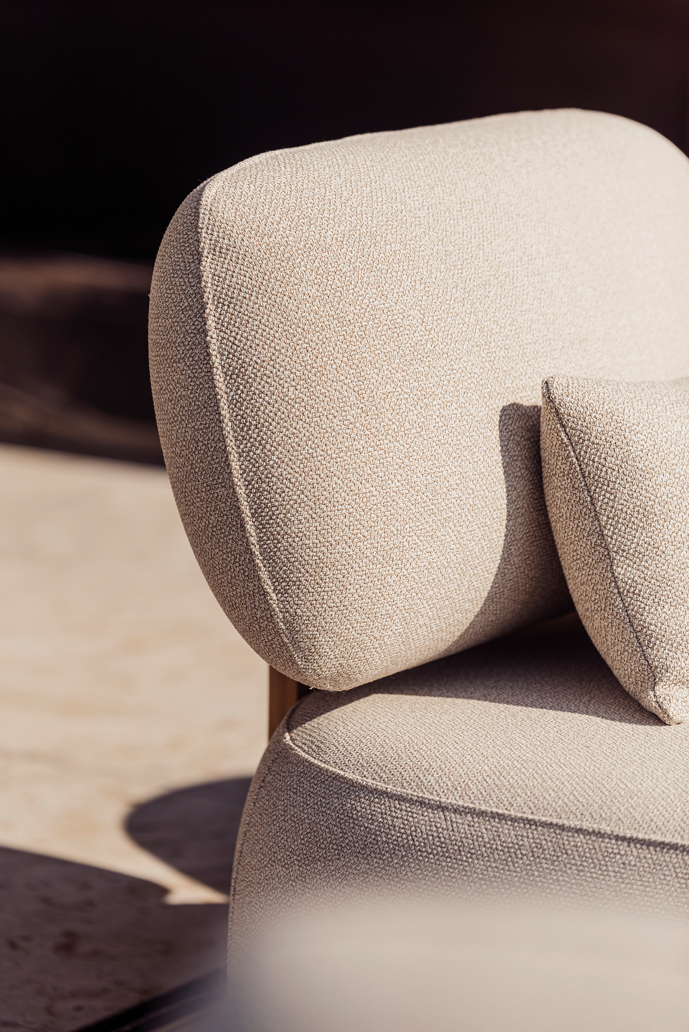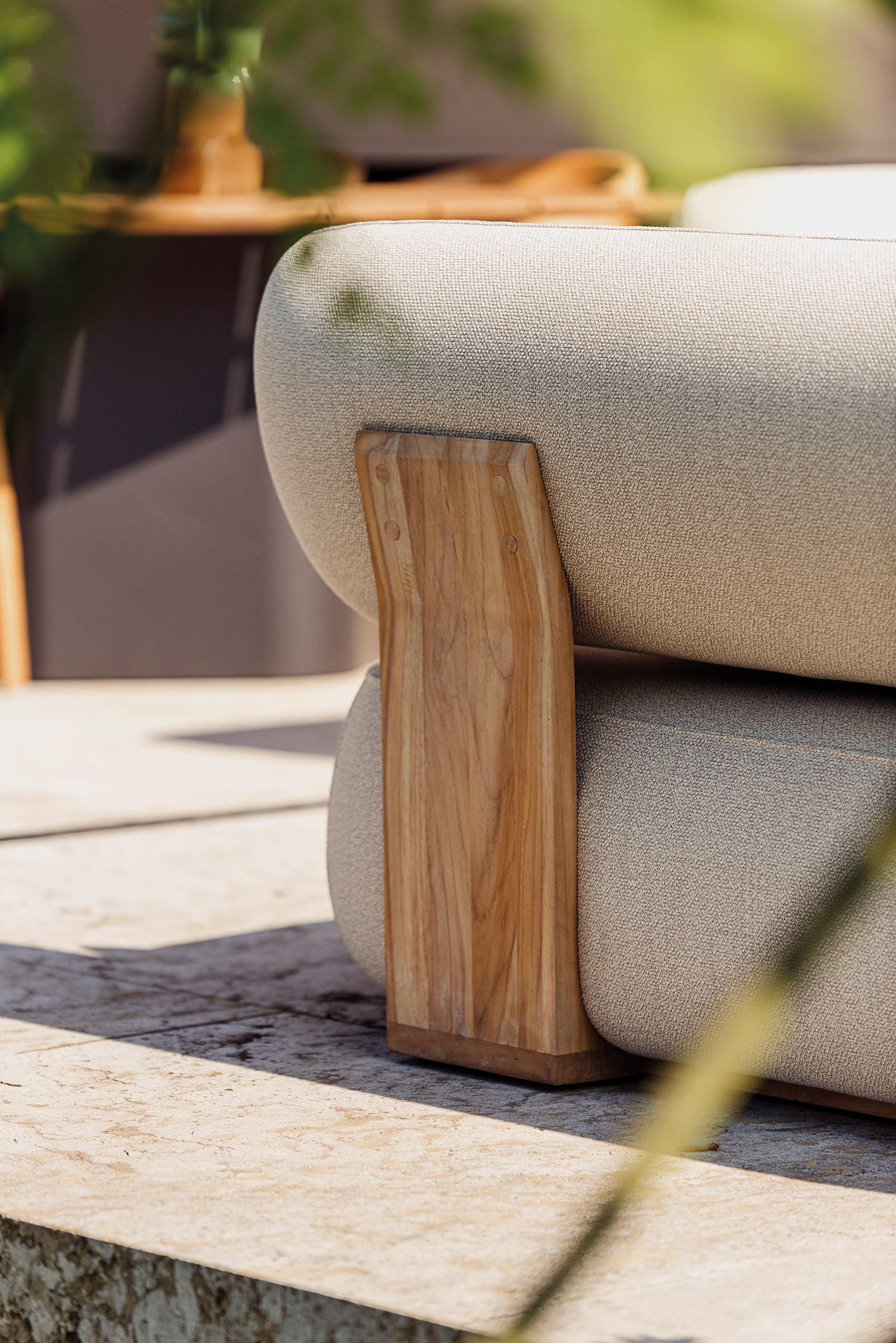 Η συλλογή Ruby περιλαμβάνει καναπέ και πολυθρόνα, με σκελετό σε ξύλο ανακυκλωμένου τικ, ύφασμα Mario Siesta Ecru και εσωτερικό αφρό quick dry.