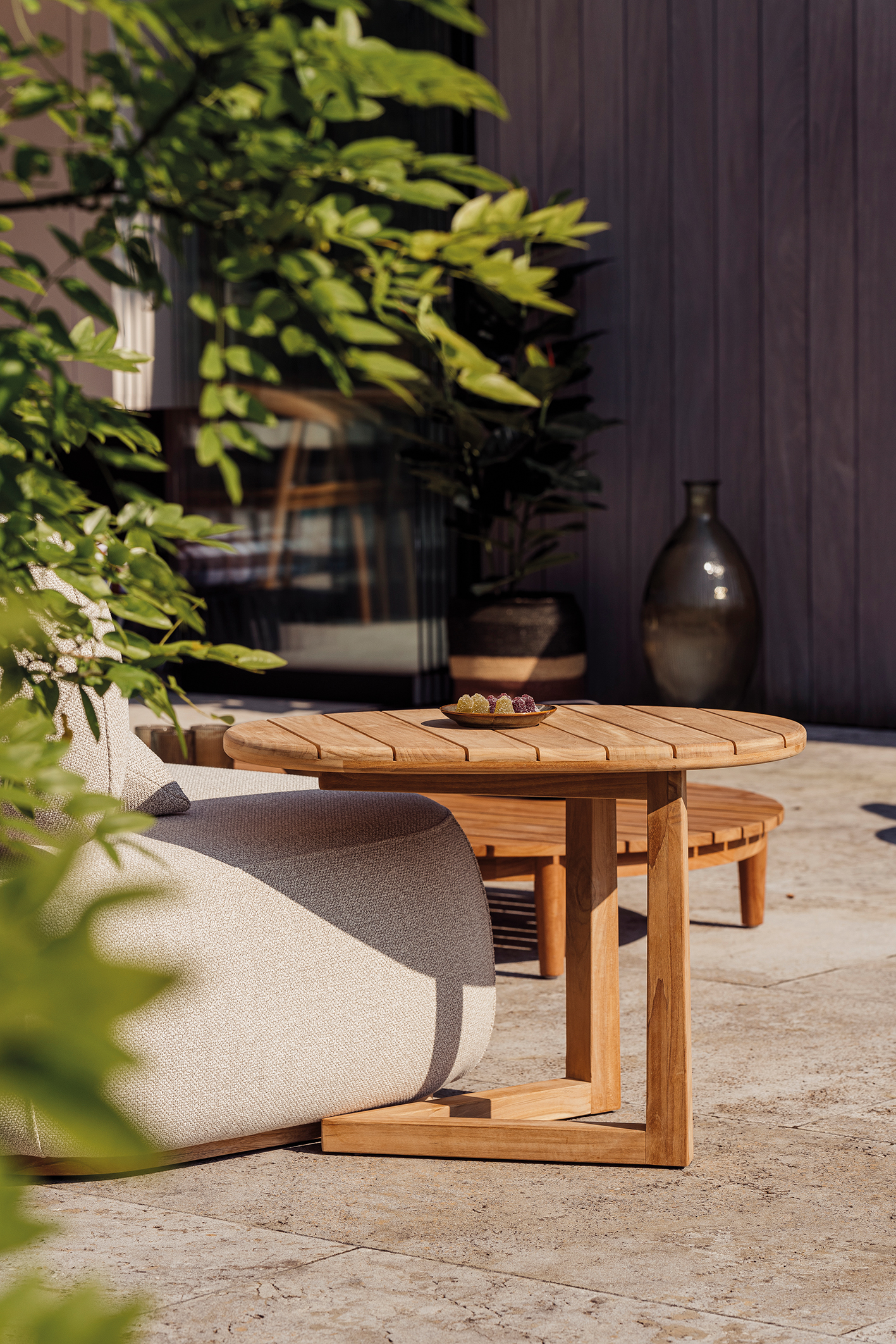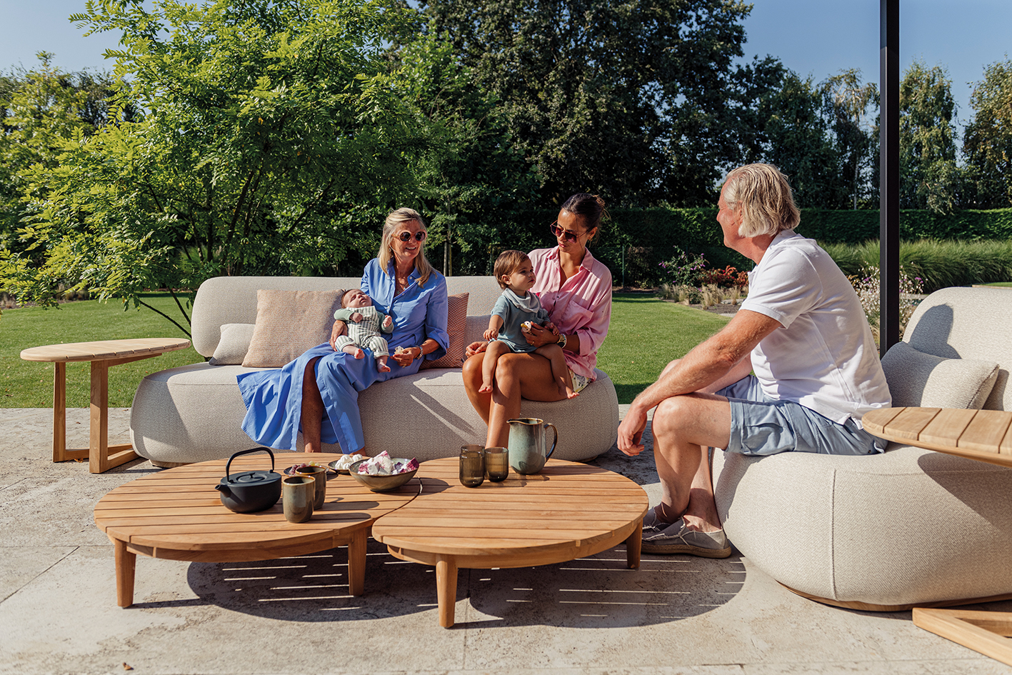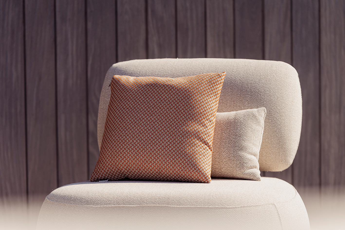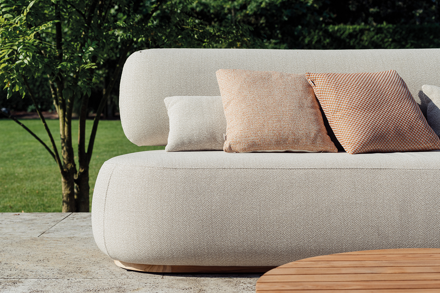Η συλλογή Ruby περιλαμβάνει καναπέ και πολυθρόνα, με σκελετό σε ξύλο ανακυκλωμένου τικ, ύφασμα Mario Siesta Ecru και εσωτερικό αφρό quick dry.