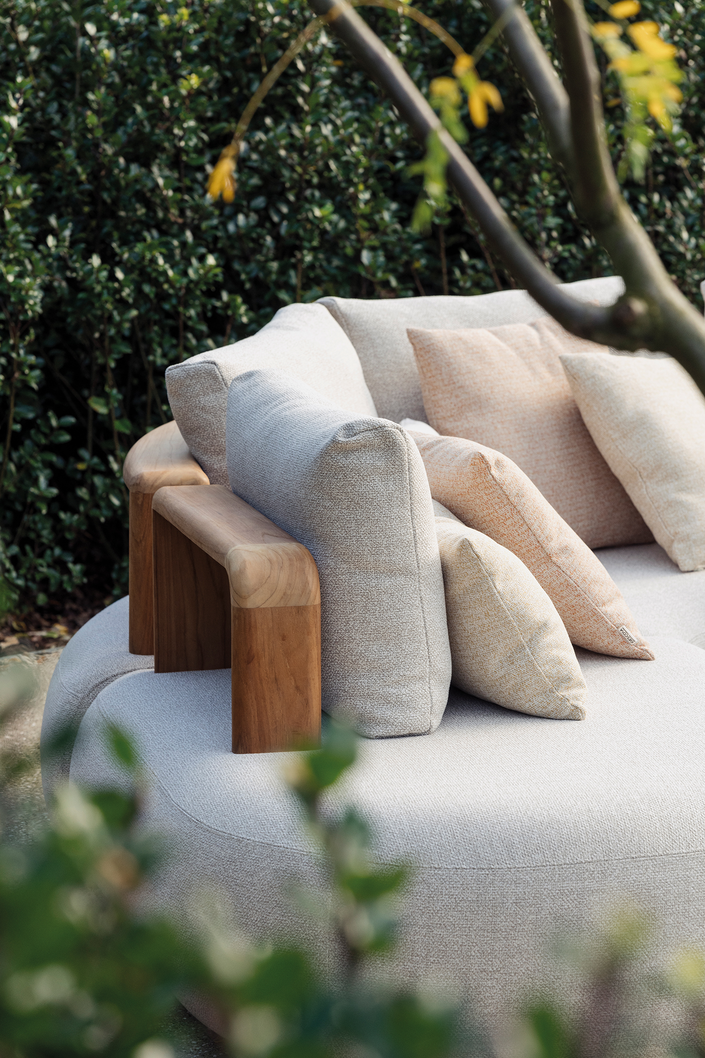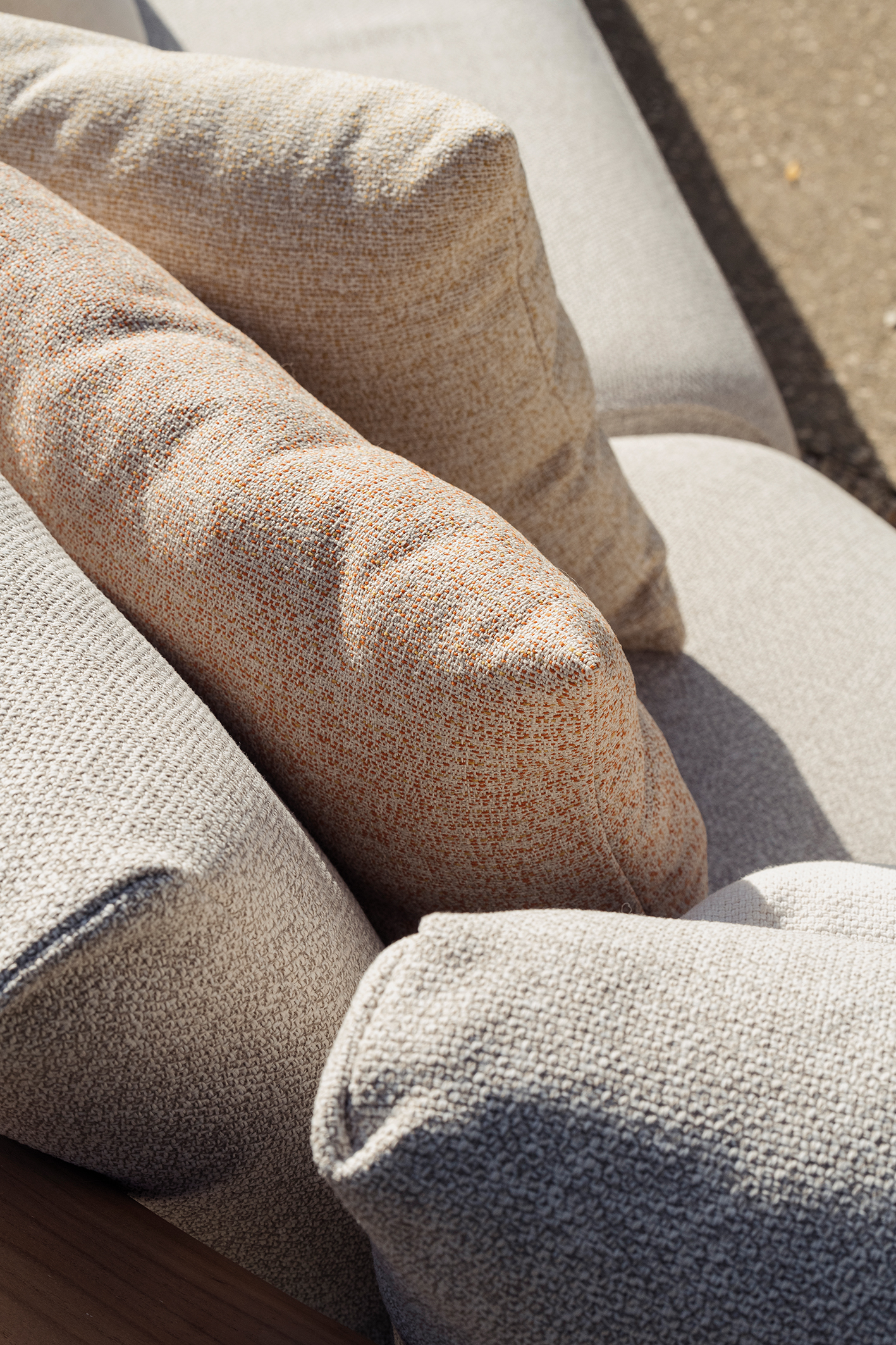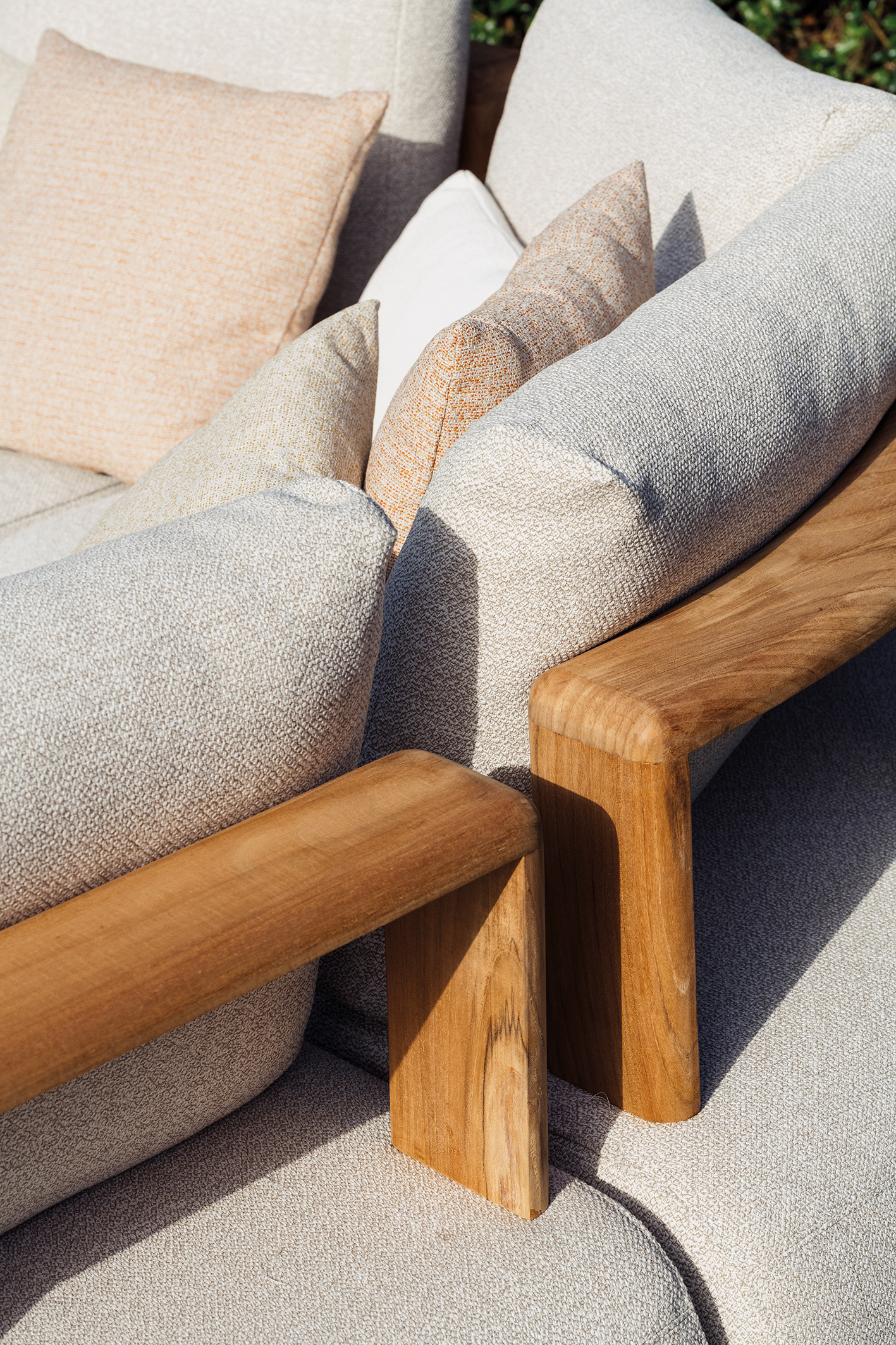 Η συλλογή Mila περιλαμβάνει καναπέ, πολυθρόνα και γωνιακή πολυθρόνα, με σκελετό σε ξύλο ανακυκλωμένου τικ, ύφασμα Mario Siesta Ecru και εσωτερικό αφρό quick dry.