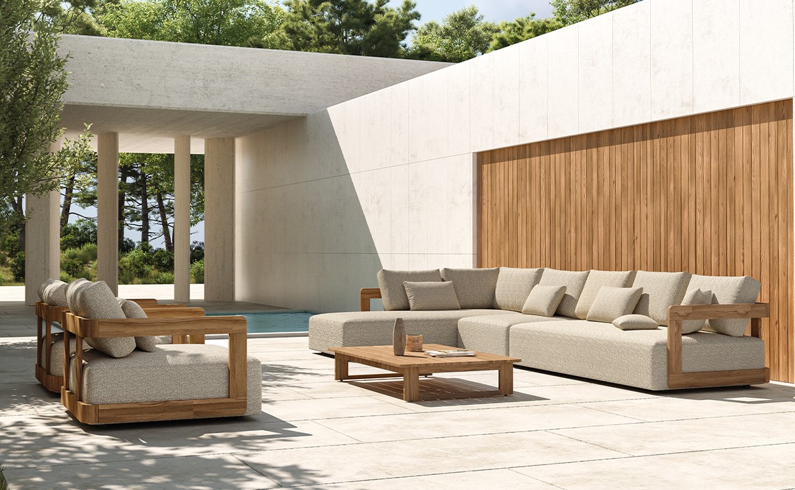 Η συλλογή συνοδεύεται από coffee table σε ξύλο τικ ή σε λευκό αλουμίνιο με κεραμική επιφάνεια.
