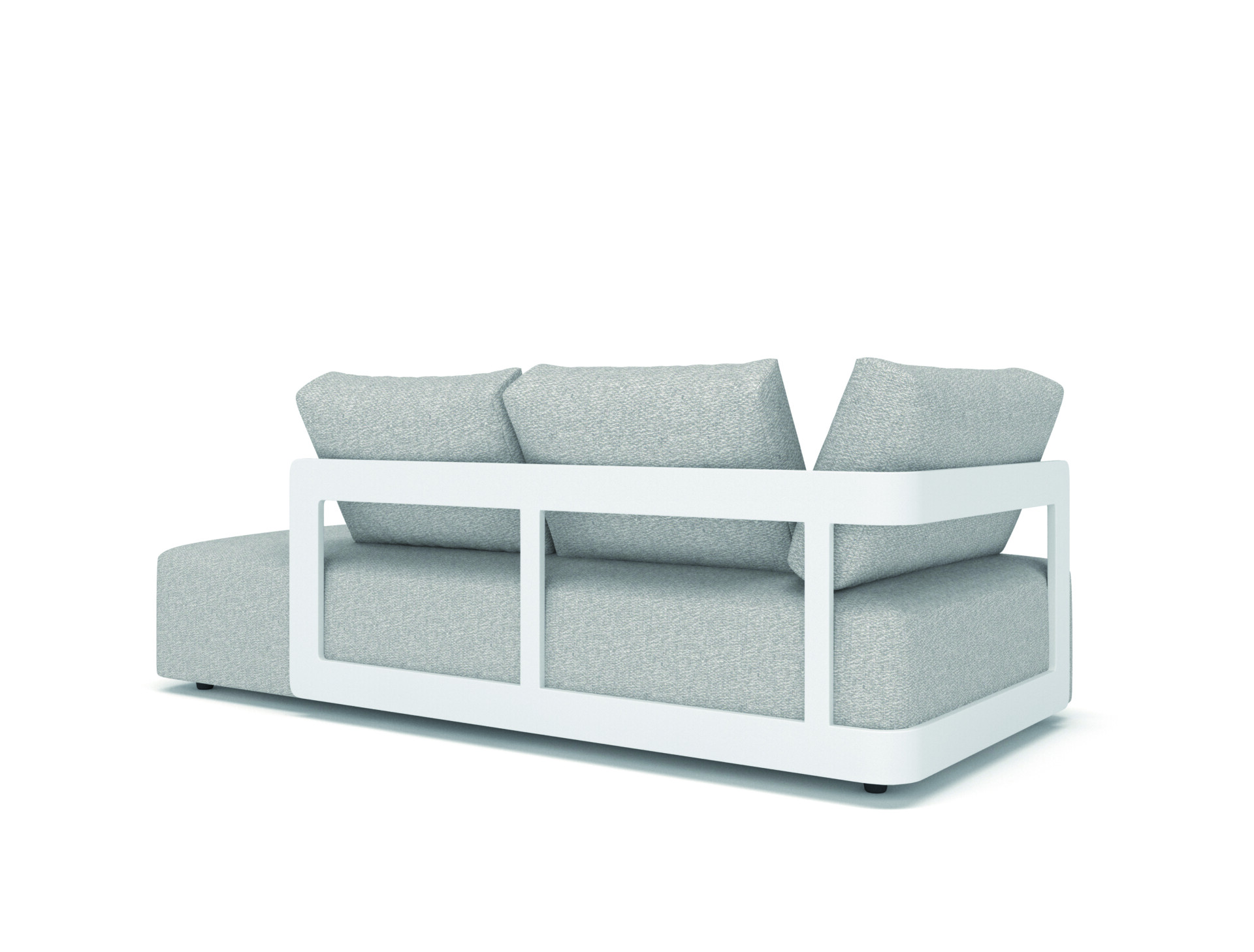 Στην έκδοση με σκελετό αλουμινίου σε λευκό φινίρισμα, τα μαξιλάρια είναι σε ύφασμα Bruma Niebla.