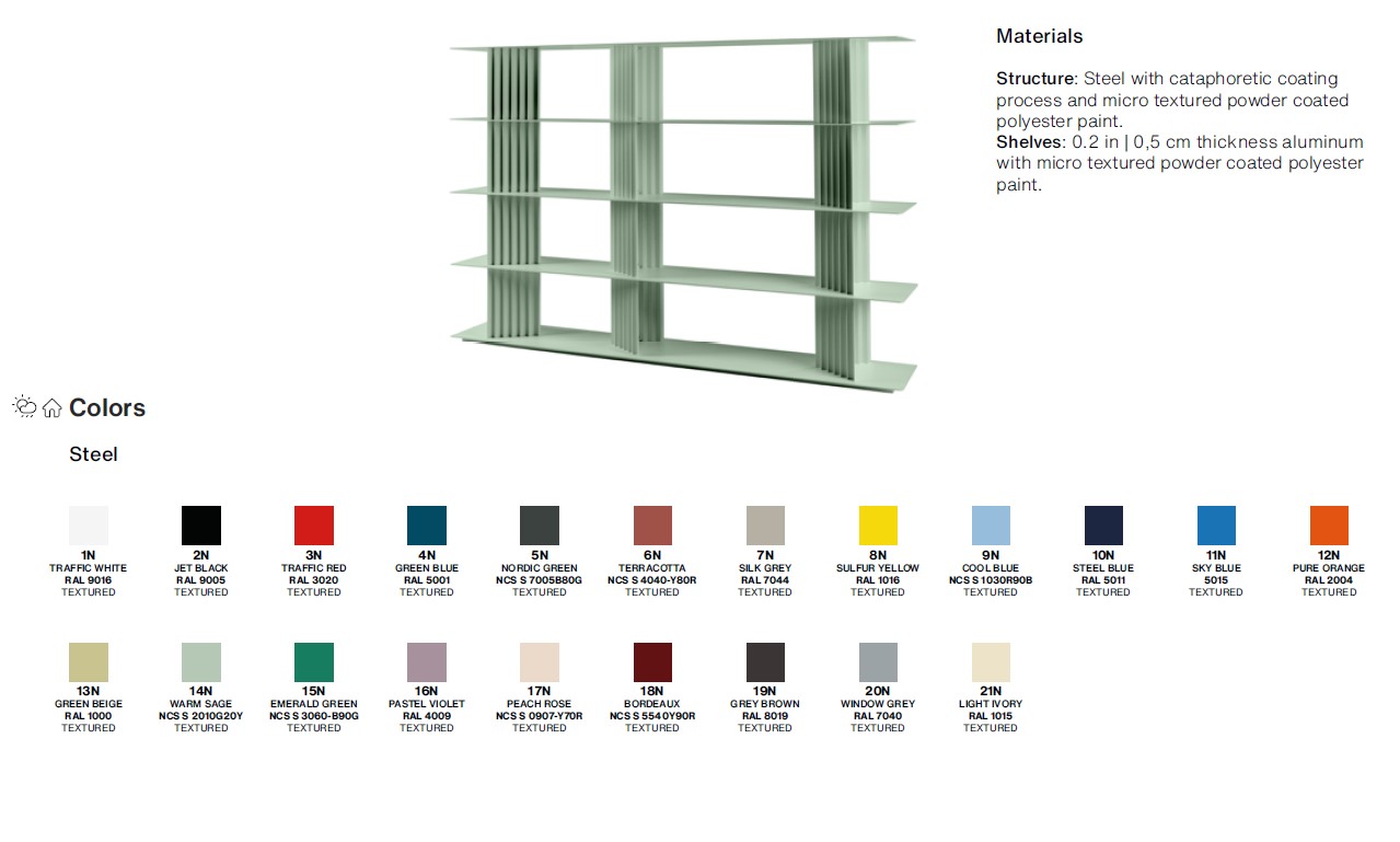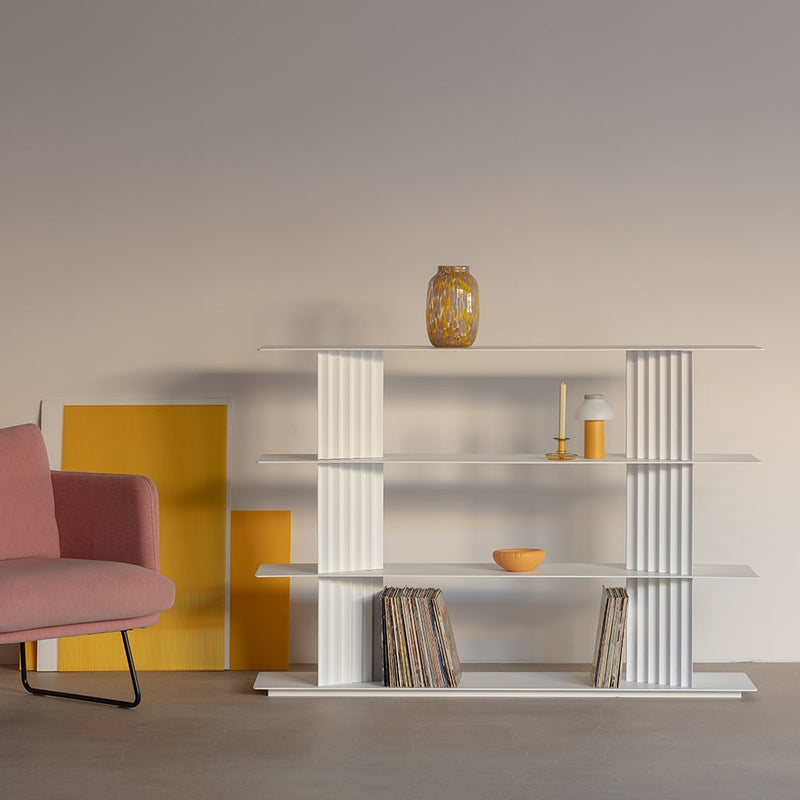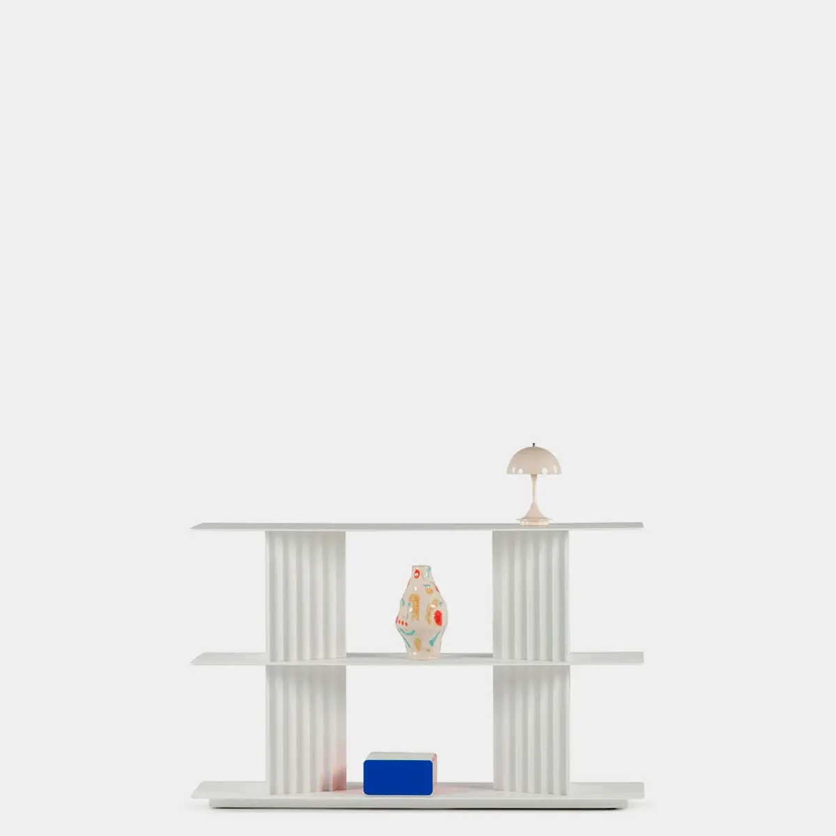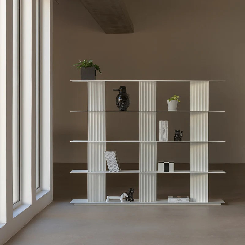Το Plec Shelving είναι ένα σύστημα αποθήκευσης που διατηρεί τον γλυπτικό χαρακτήρα και τον ιδιαίτερο αρχιτεκτονικό σχεδιασμό της συλλογής Plec. Είναι διαθέσιμο σε τέσσερα μήκη και τρία διαφορετικά ύψη που επιτρέπουν την δημιουργία της ιδανικής για τις ανάγκες σας σύνθεσης, που προσαρμόζεται άψογα σε κάθε χώρο. Από μια γοητευτική κονσόλα που προσδίδει προσωπικότητα σε μια φιλόξενη γωνιά, μέχρι μια εντυπωσιακή βιβλιοθήκη που γεμίζει μεγάλους χώρους. Ο σκελετός του είναι κατασκευασμένος από ατσάλι υψηλής ποιότητας, εξασφαλίζοντας στιβαρότητα και σταθερότητα, ενώ τα ράφια αλουμινίου επιτυγχάνουν την ιδανική ισορροπία μεταξύ ελαφρότητας και αντοχής.