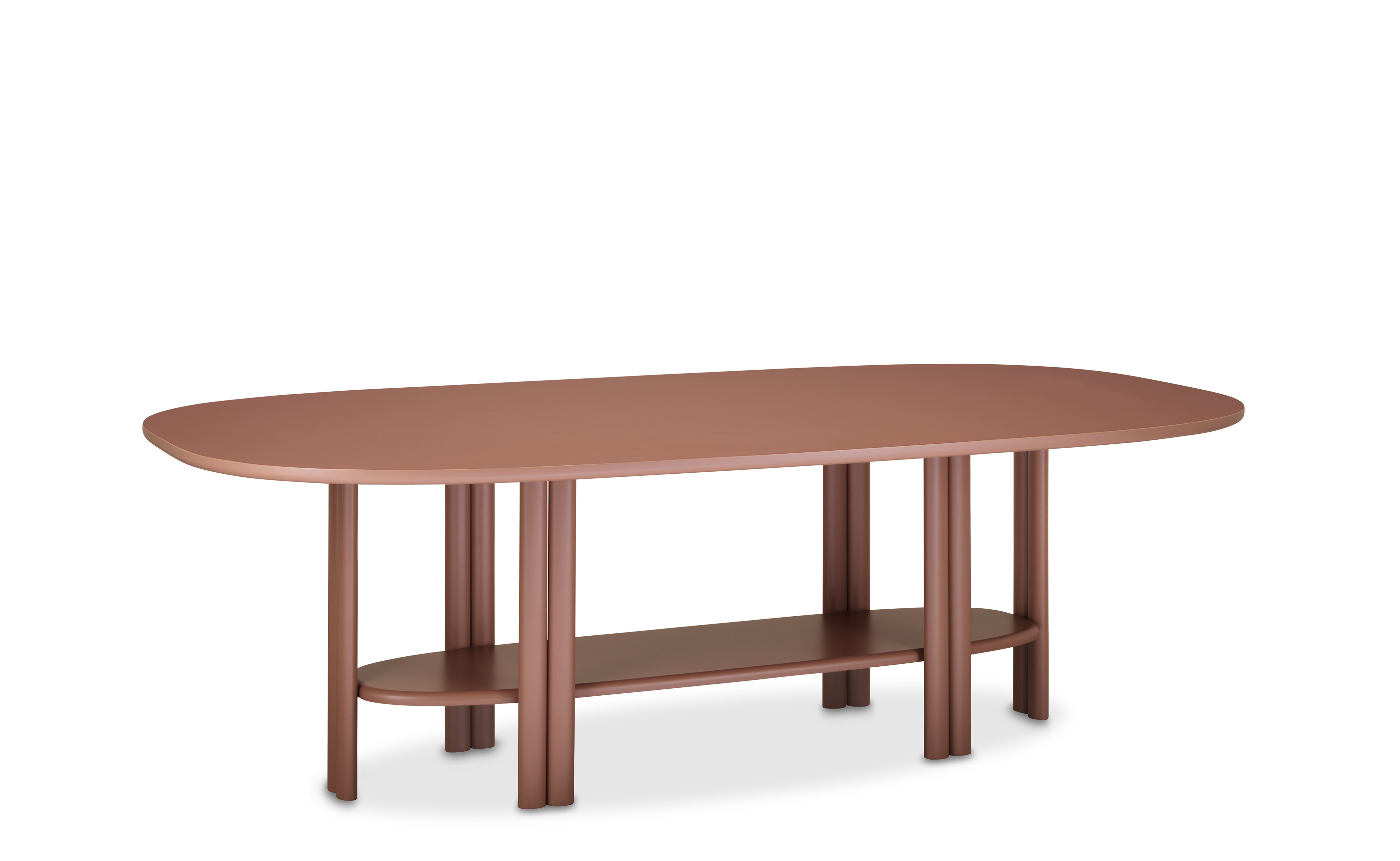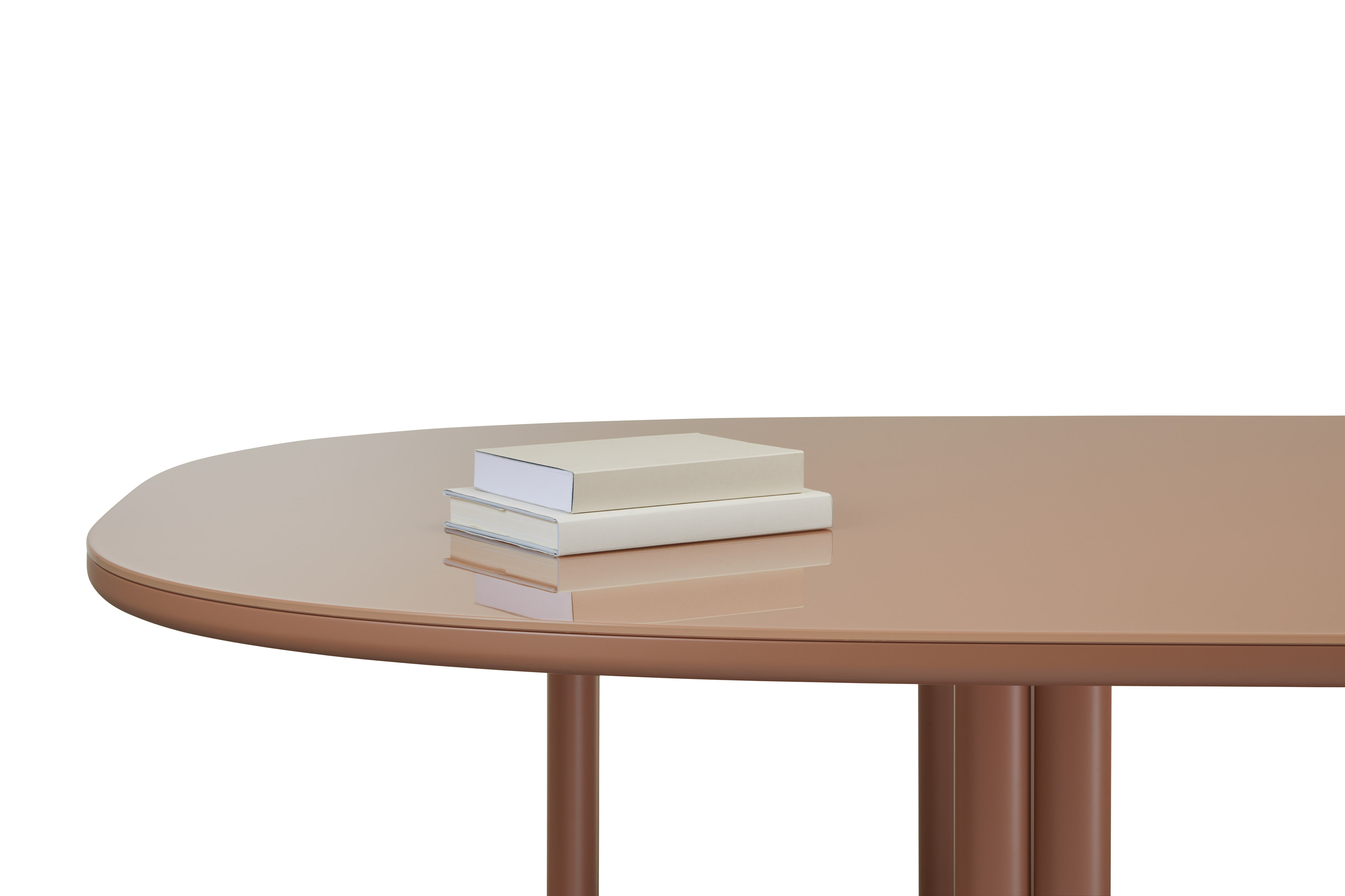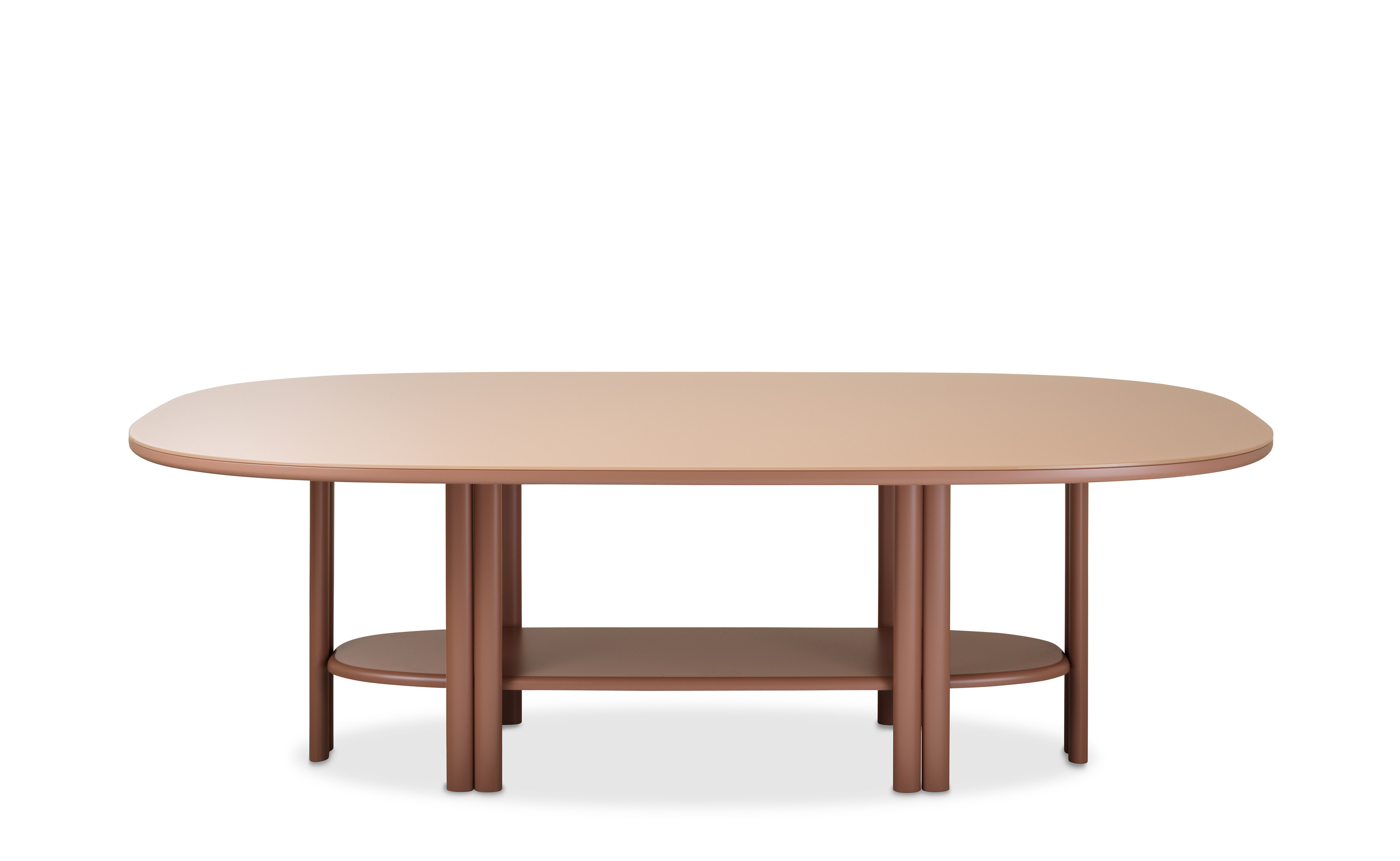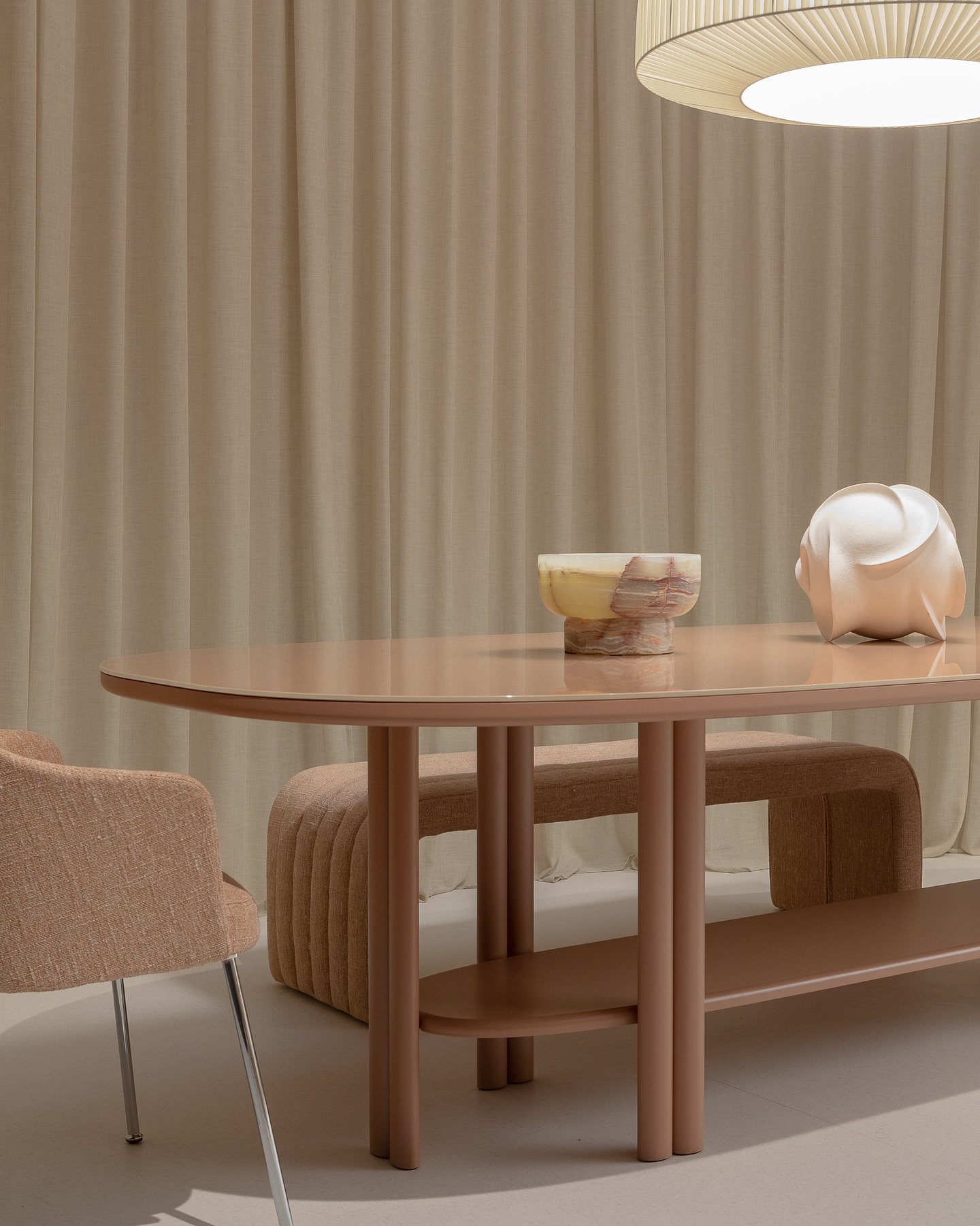 Το τραπέζι Anam διατίθεται κατόπιν παραγγελίας με βάση σε λακαριστό ατσάλι και επιφάνεια σε λακαριστό γυαλί ή λακαριστό ξύλο, σε ματ φινίρισμα Velvet Rose, Eucalyptus ή Sand.