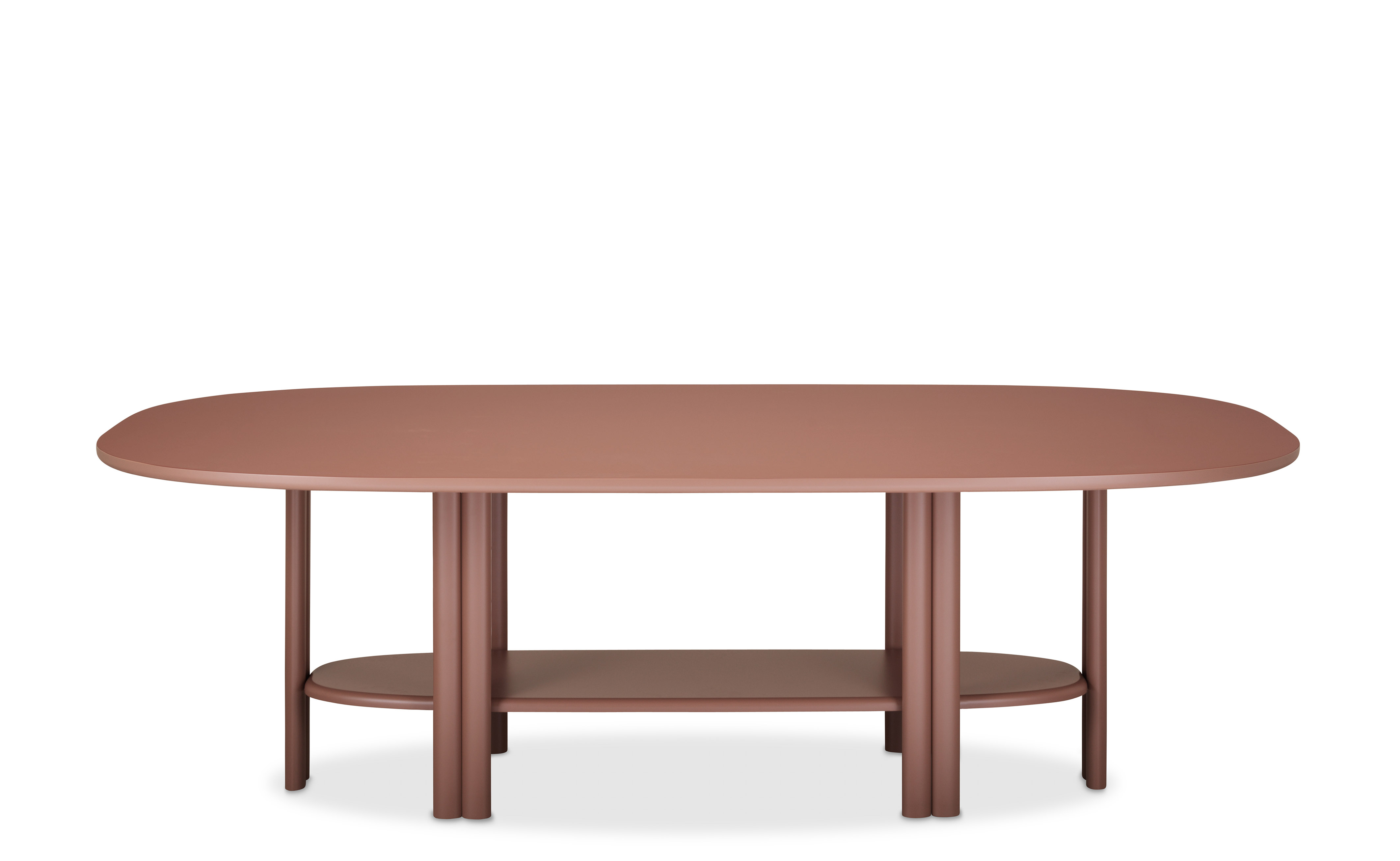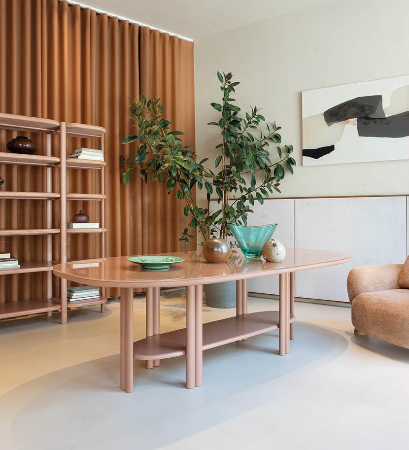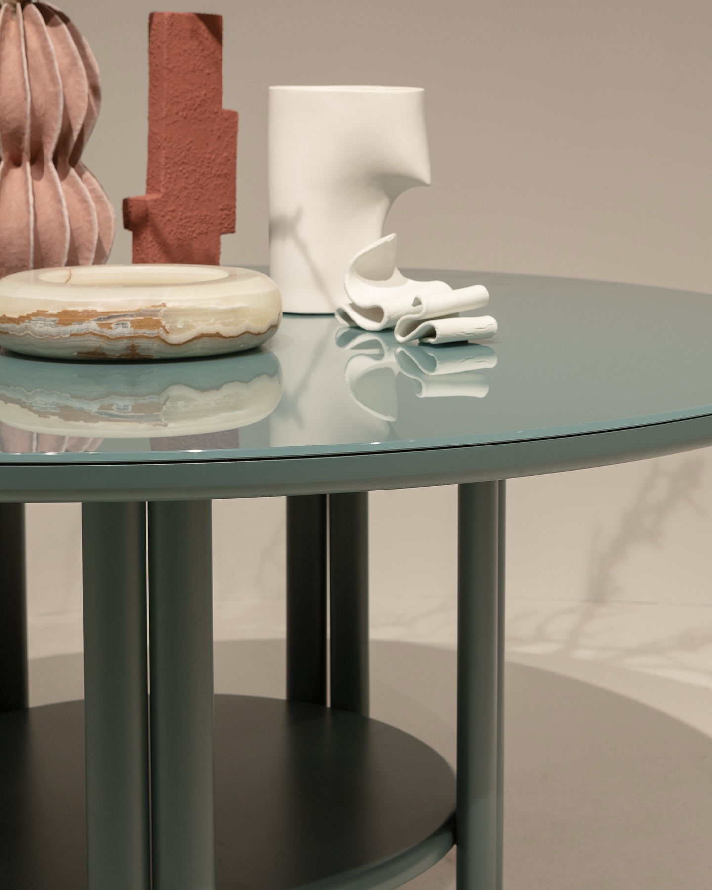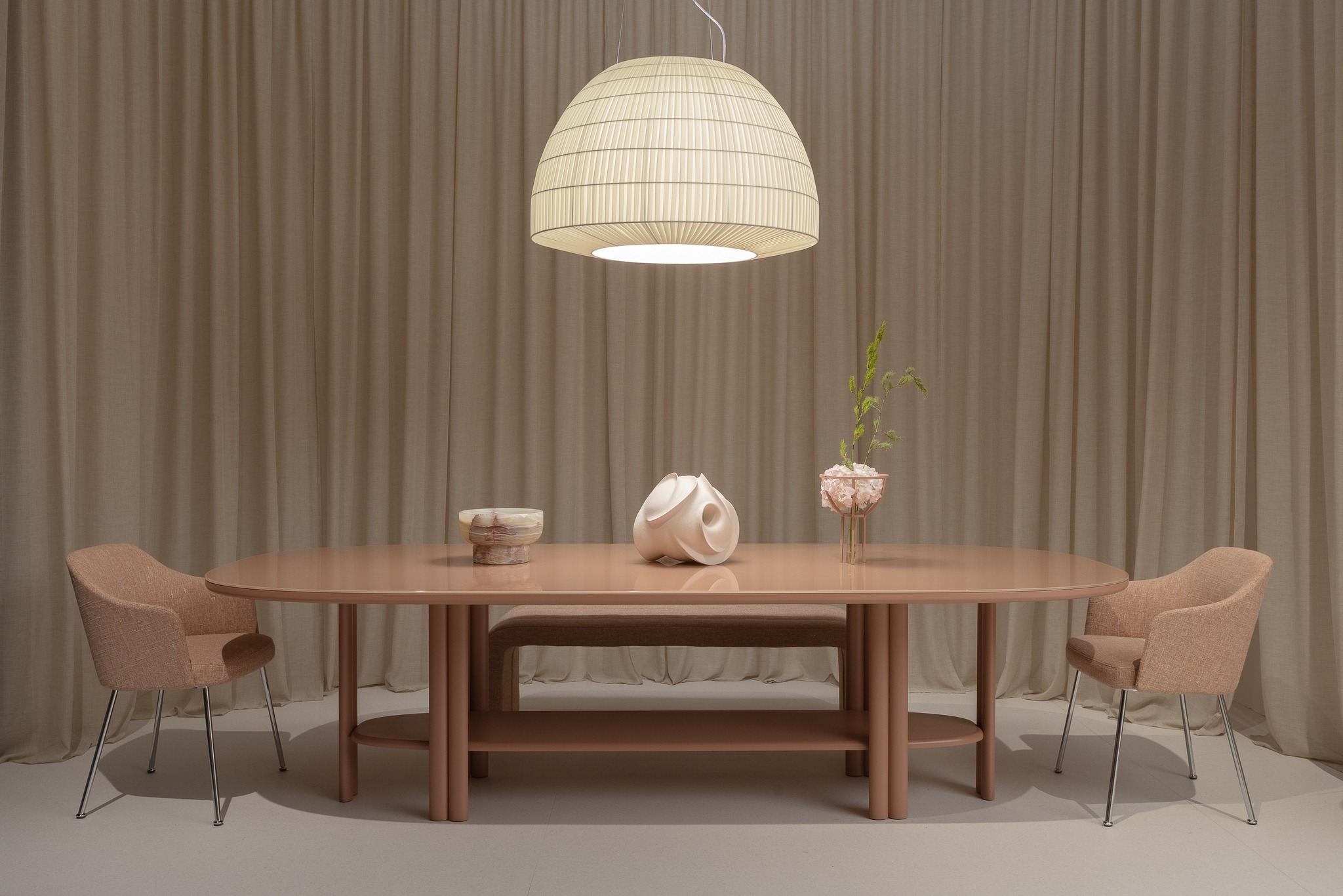 Το τραπέζι Anam διατίθεται κατόπιν παραγγελίας με βάση σε λακαριστό ατσάλι και επιφάνεια σε λακαριστό γυαλί ή λακαριστό ξύλο, σε ματ φινίρισμα Velvet Rose, Eucalyptus ή Sand.
