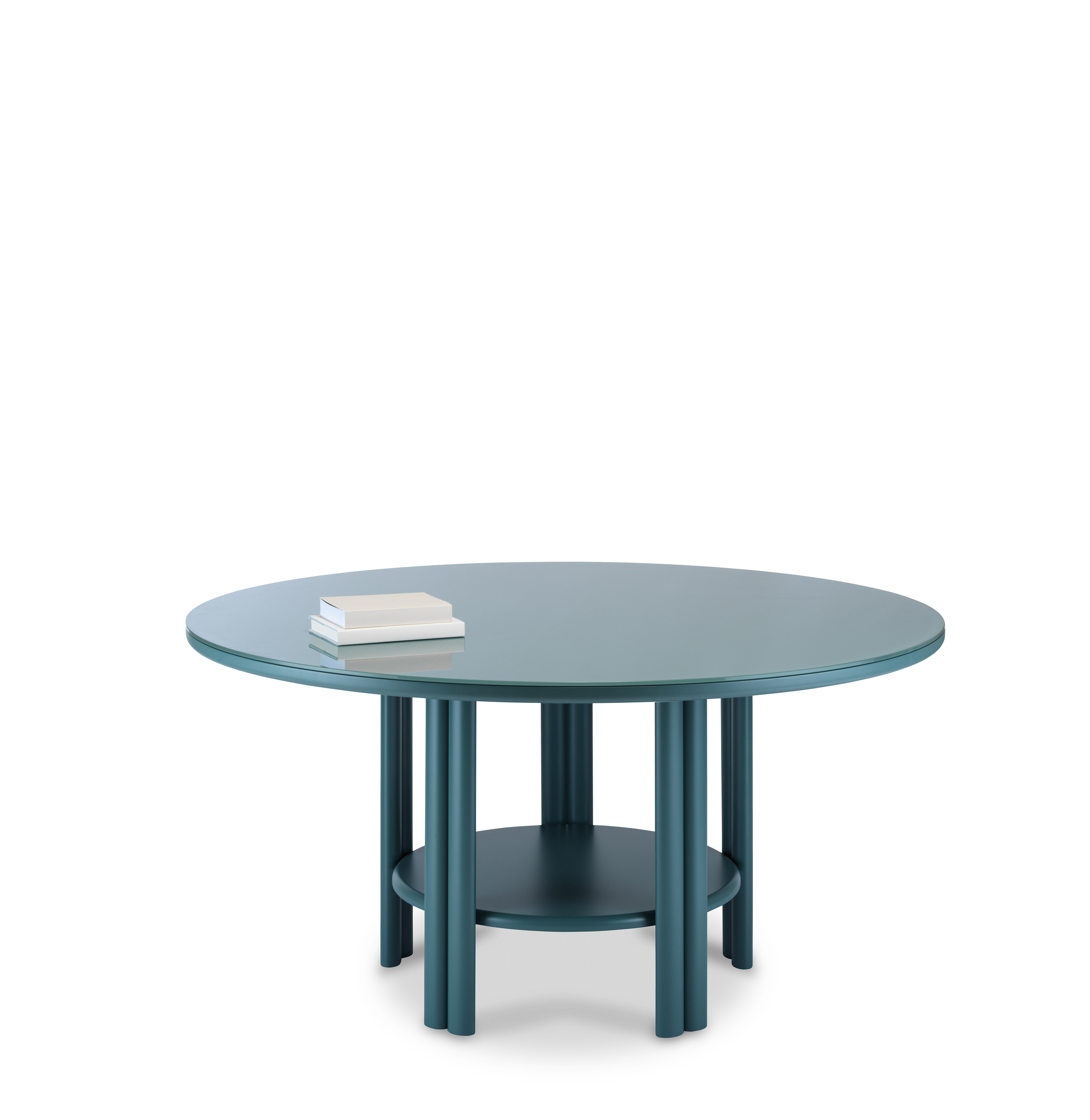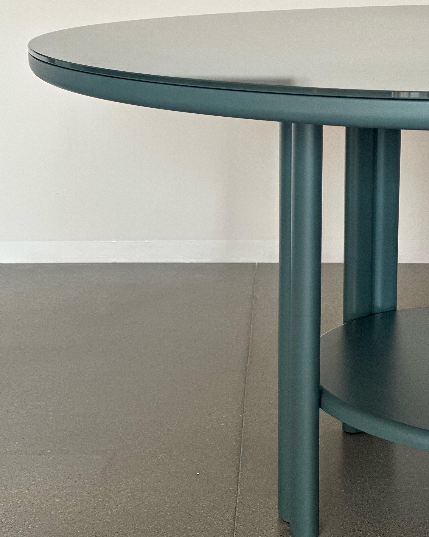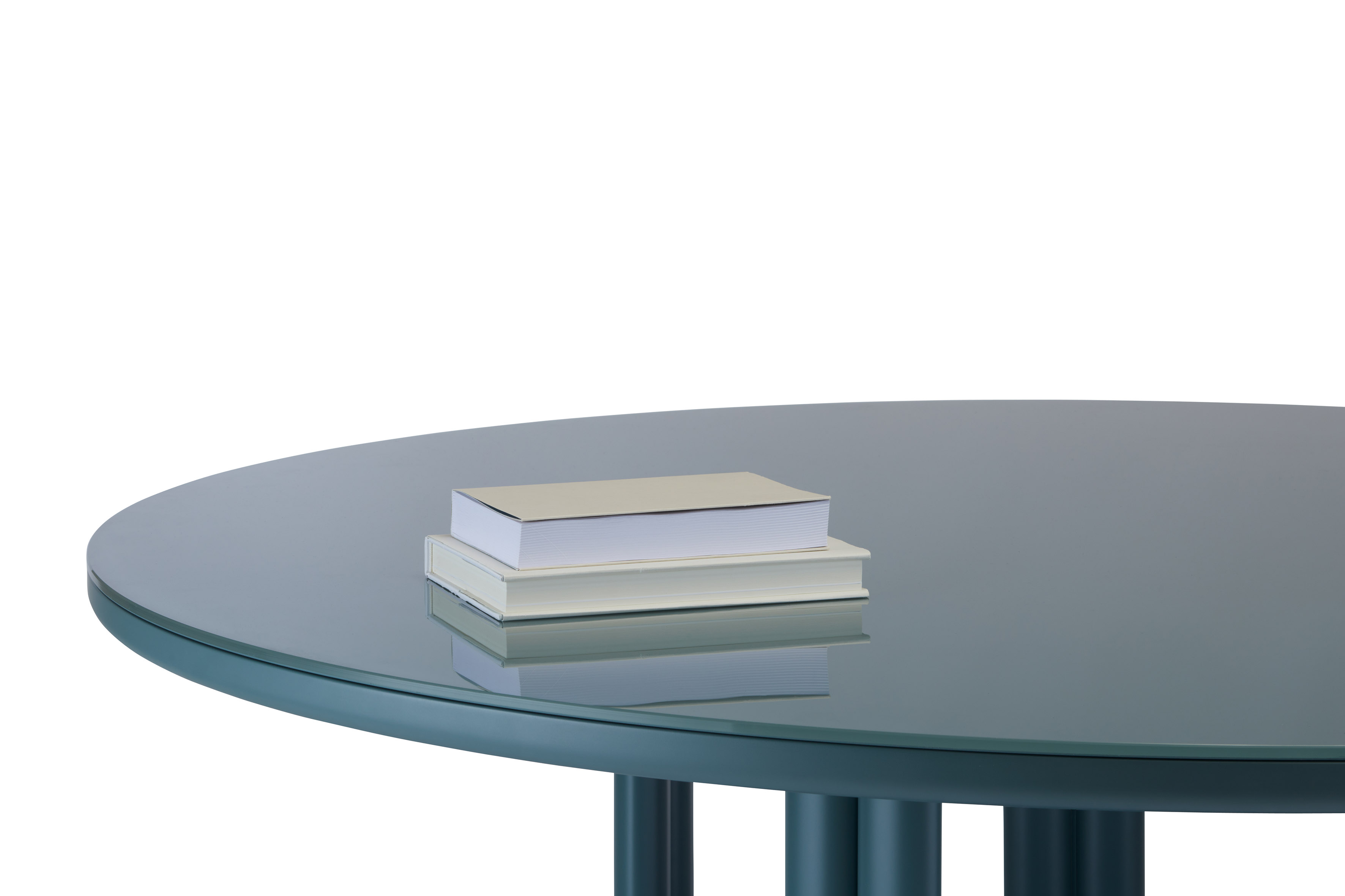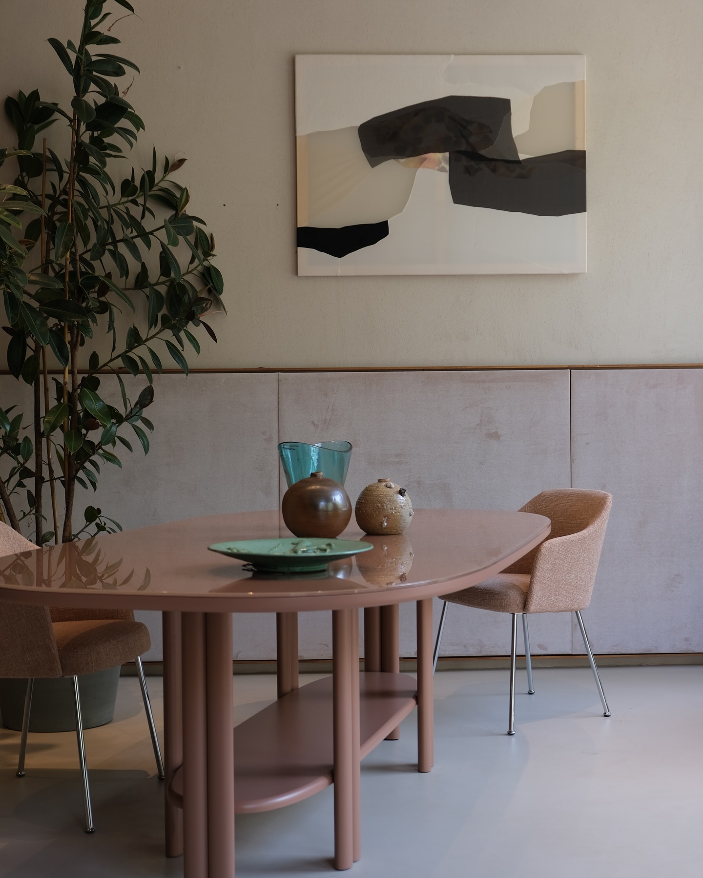 Το τραπέζι Anam διατίθεται κατόπιν παραγγελίας με βάση σε λακαριστό ατσάλι και επιφάνεια σε λακαριστό γυαλί ή λακαριστό ξύλο, σε ματ φινίρισμα Velvet Rose, Eucalyptus ή Sand.