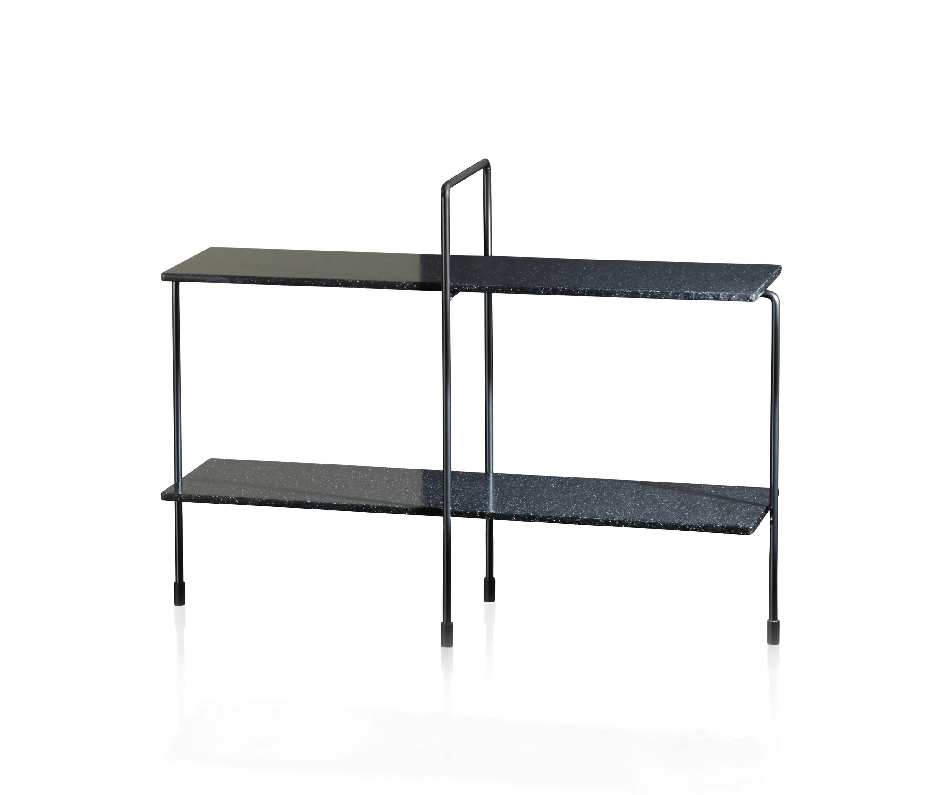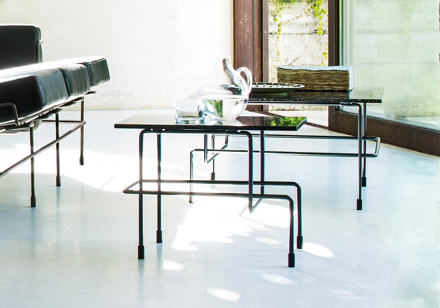 Η εμβληματική συλλογή καθισμάτων Traffic του Konstantin Grcic, πλαισιώνεται με τρία 3 χαμηλά τραπεζάκια που διατηρούν την γεωμετρική κομψότητα της συλλογής . Έχουν τις ίδιες μεταλλικές ράβδους σε μαύρο φινίρισμα, αλλά με επιφάνεια από ακρυλική, γκρι ανθρακί πέτρα ή δρύ σε μαύρο φινίρισμα.