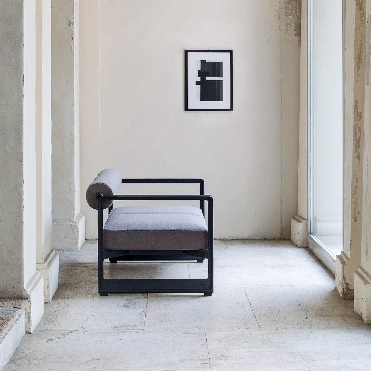 Η πολυθρόνα Brut είναι κατασκευασμένη από συμπαγές χυτοσίδηρο και συνδυάζεται με μαλακή ταπετσαρία σε επιλεγμένα υφάσματα.