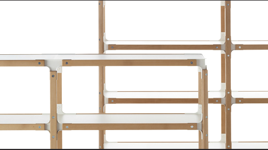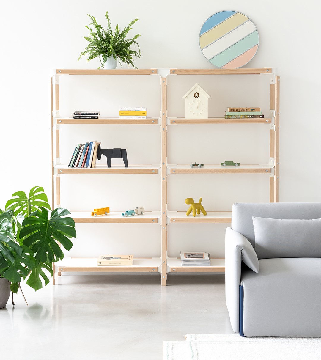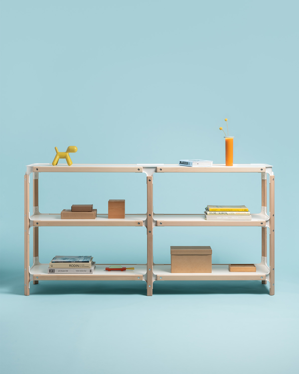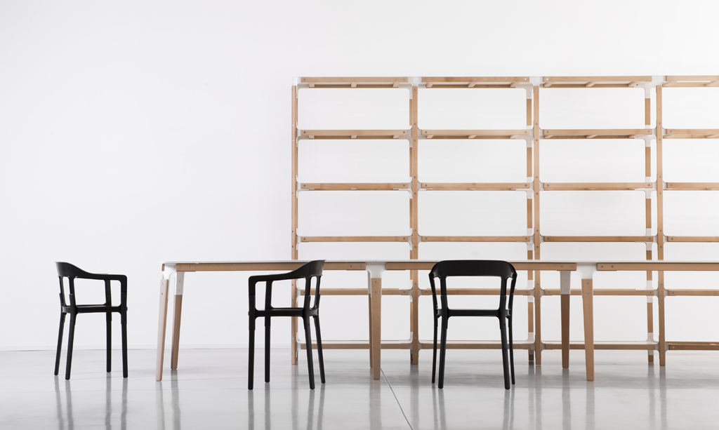 Η συλλογή περιλαμβάνει μια καρέκλα, σκαμπό, τραπέζι, μια modular βιβλιοθήκη και ένα καλόγερο.