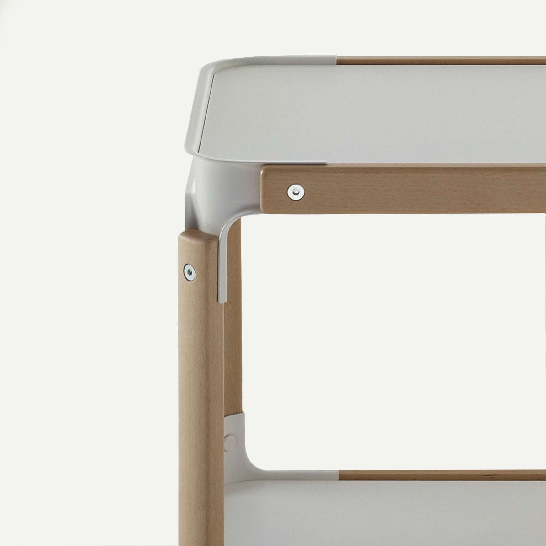Ο σκελετός είναι σε μασίφ ξύλο φυσικό ή βαμμένο μαύρο και τα ράφια σε λευκό ή μαύρο MDF.