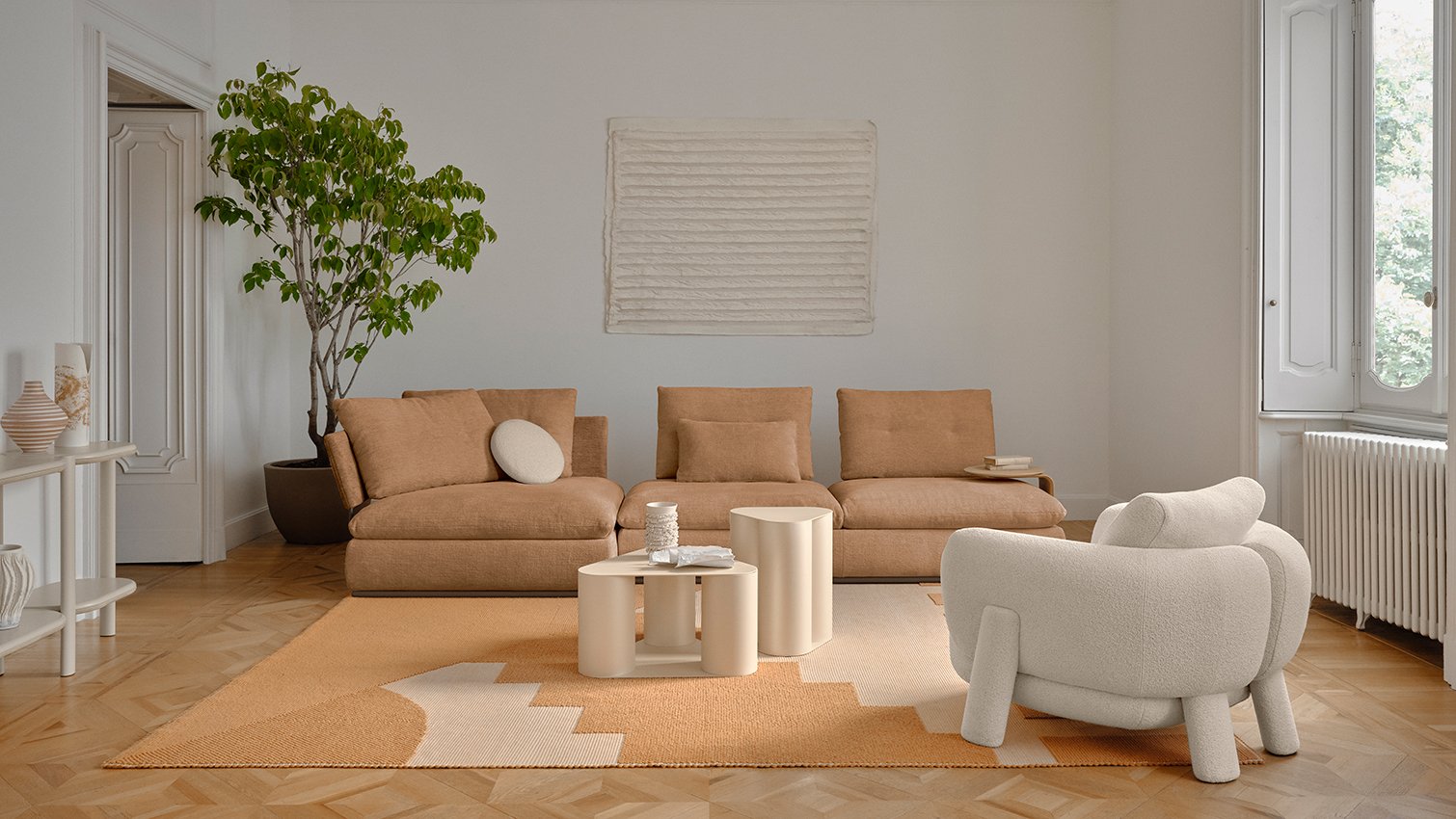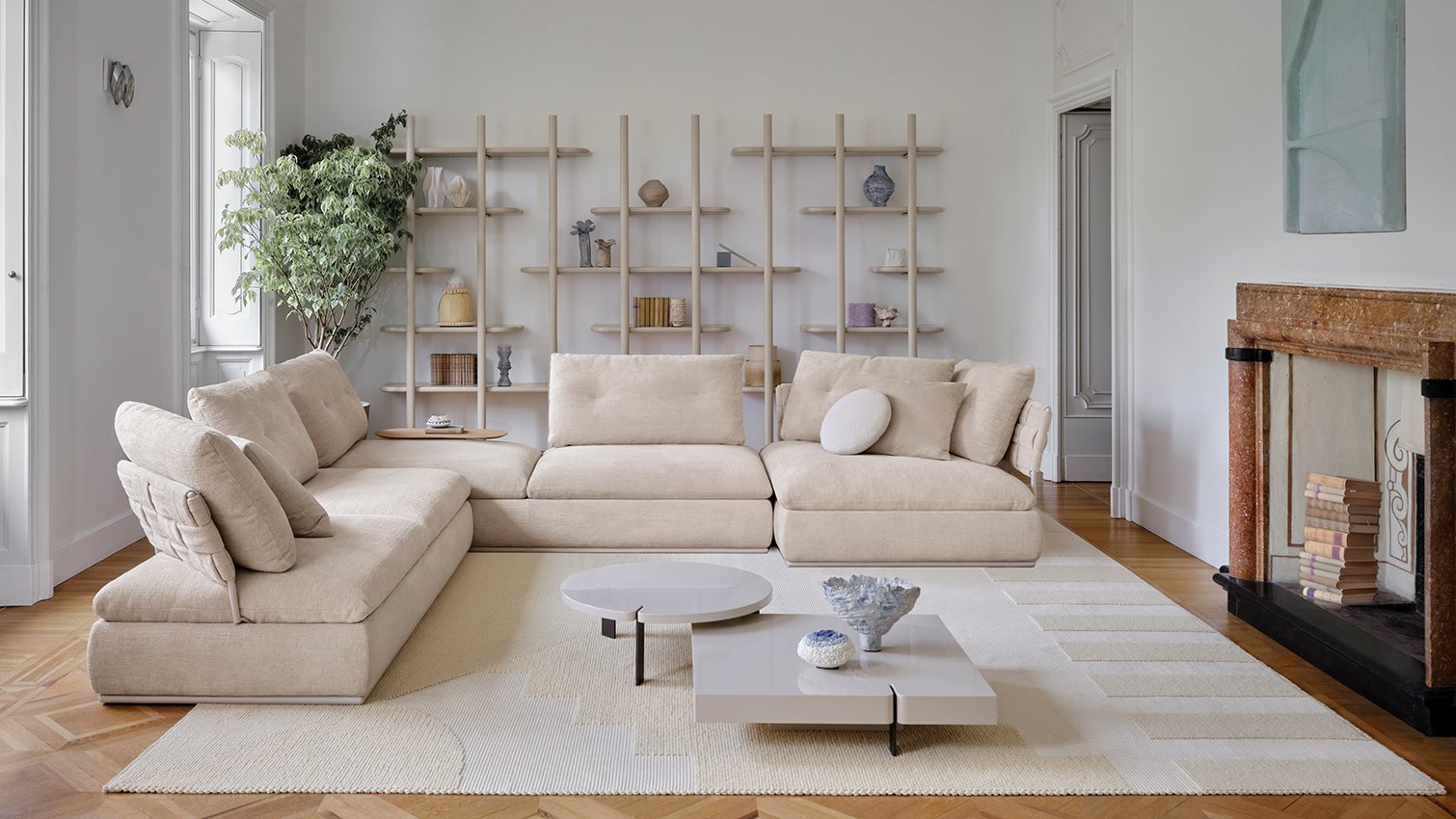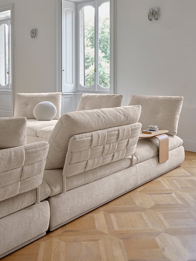 Reclaiming the floor and feeling welcomed in volumes that offer a sense of protection was the inspiration that guided the creation of Land.The stylistic code can be noted in the padded base that rests on a metal frame and evolves in the design of the back panels, now intertwined with a strong sartorial touch.Land retains its nomadic nature thanks to the flexibility offered by the backrest panel attachment system, which allows an easily changeable seating position.Its strong personality makes it a protagonist both as a single element as well as a modular system.The individual back panels can be intuitively rearranged to easily adapt to the needs of the moment, reinventing the geography of the space in a personal and creative way.To complete the project, the removable side surfaces are useful supports near the seat, which can be inserted on all four sides.