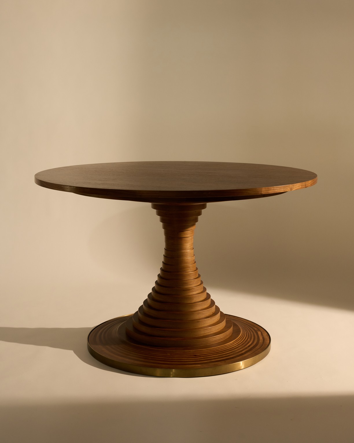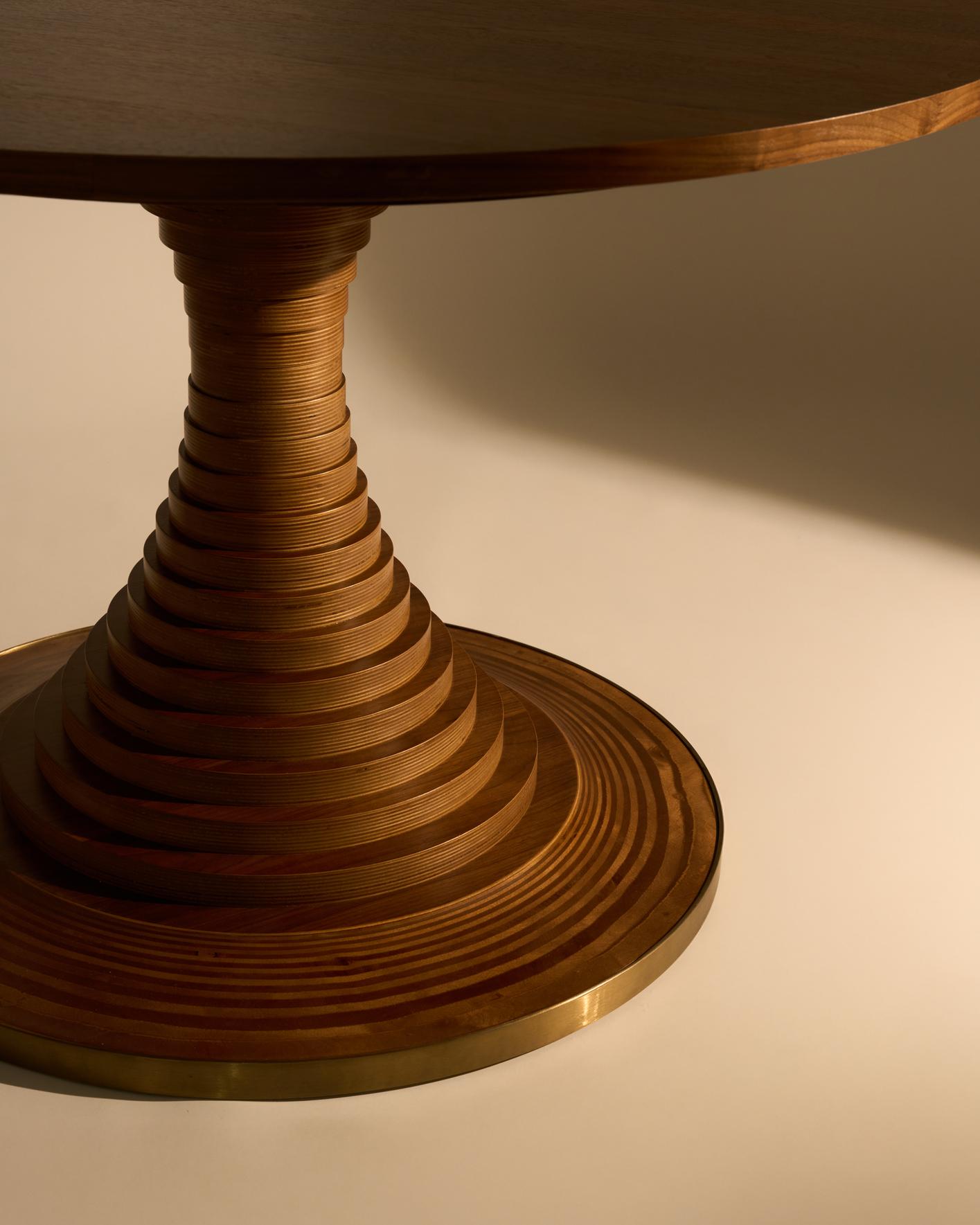 Σχεδιασμένο το 1963 από τον επιδραστικό Ιταλό αρχιτέκτονα Carlo De Carli, το τραπέζι φαγητού Tavolo a Dischi δεν είναι μόνο ένα έργο αρχιτεκτονικής αλλά και ένα αυθεντικό design icon. Μια κομψή ένωση λειτουργικότητας και σχήματος, που συνδυάζει κατασκευαστική καινοτομία, εκφραστική υλικότητα και πρακτική αριστεία. Είναι έξυπνα κατασκευασμένο από ομόκεντρους ξύλινους δίσκους διαφορετικών διαμέτρων, στοιβαγμένους γύρω από έναν κρυφό μεταλλικό πυρήνα για να σχηματίσουν μια κομψή καμπύλη που υποστηρίζει μια γενναιόδωρη επιφάνεια από ξύλο καρυδιάς. Μια μεταλλική ορειχάλκινη ταινία στη βάση προσδίδει μια αισθητική αντίθεση υλικού, παρέχοντας παράλληλα προστασία. Εξίσου κατάλληλο για δείπνο, συναντήσεις ή συγκεντρώσεις, το Tavolo a Dischi είναι ένα κεντρικό κομμάτι που φέρνει τους ανθρώπους κοντά, ενθαρρύνοντας τη σύνδεση και τη συζήτηση.