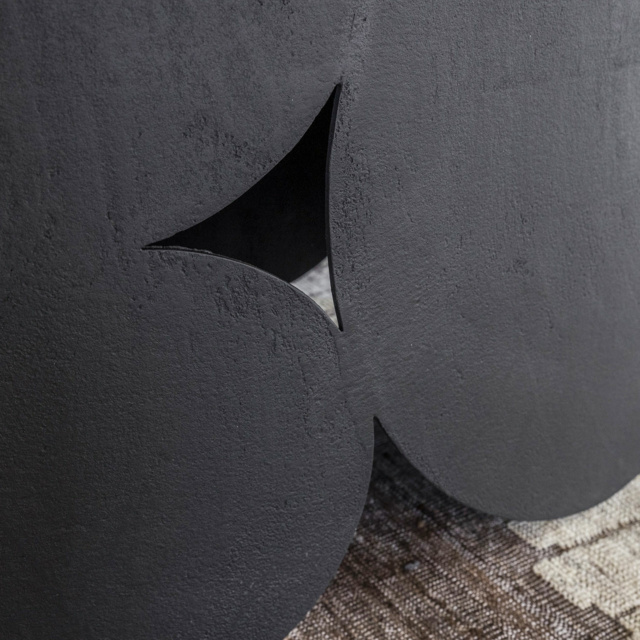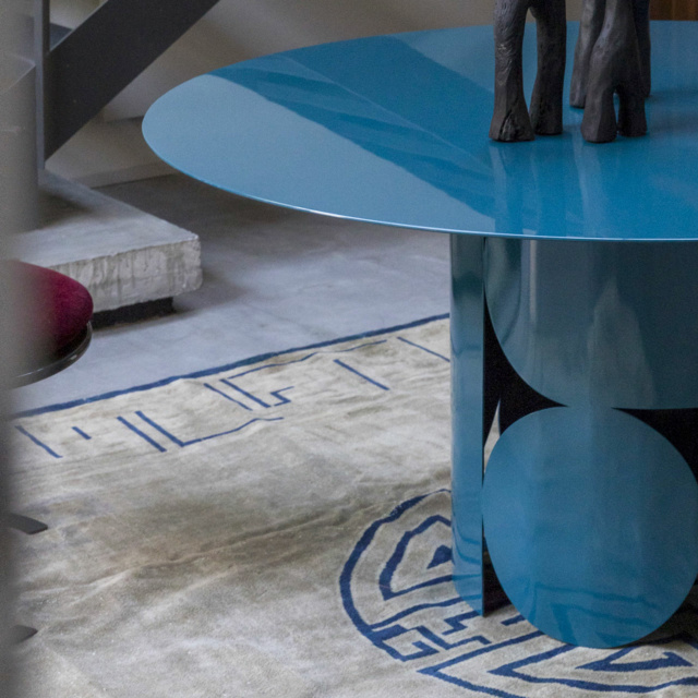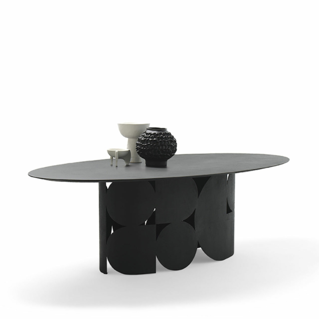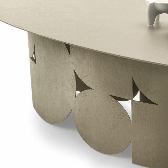 Το τραπέζι Shape χαρακτηρίζεται από ένα έντονο αρχιτεκτονικό και γλυπτικό design που εξισορροπεί μεταξύ κενών και στερεών. Ο σχεδιασμός της εντυπωσιακής διάτρητης μεταλλικής βάσης εμπνέεται από τα παιδικά παιχνίδια με χαρτί, όπου το δίπλωμα και το κόψιμο δημιουργούν γεωμετρικά μοτίβα και αλληλουχίες.