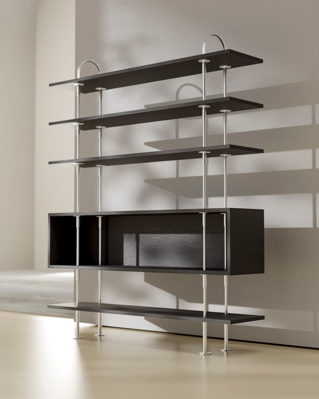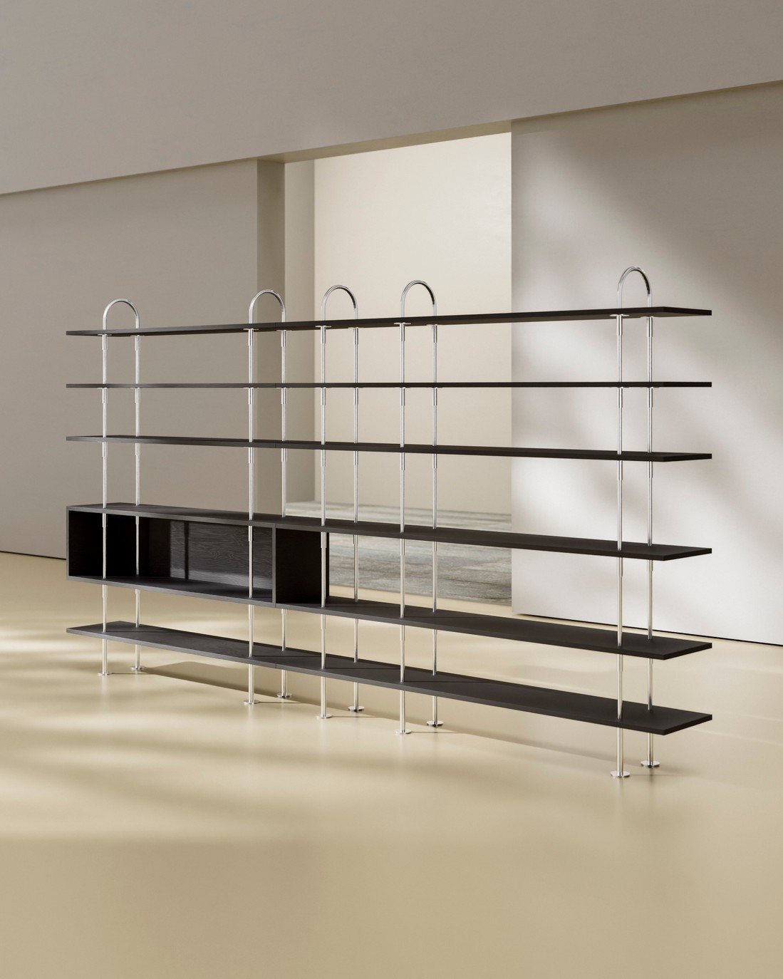 Αποτελείται από επτά βασικές μονάδες, με επιλογές σκελετού σε μαύρο ορείχαλκο ή σατινέ ανοξείδωτο ατσάλι, ράφια και box από φιμέ γυαλί σε ψυχρό γκρι, ή από ξύλο με πιστοποίηση FSC®: φλαμουριά σε μαύρο-καφέ χρώμα και ALPI Sottsass Gray.