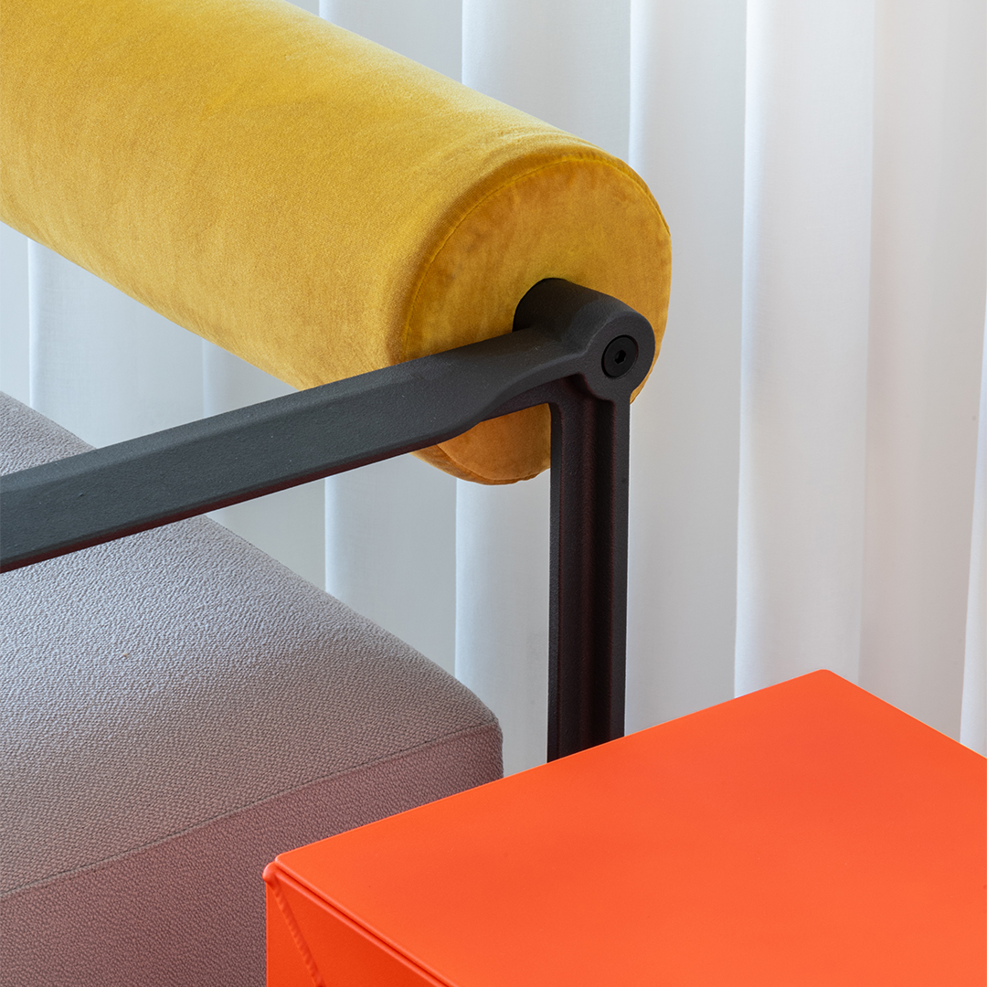 Η πολυθρόνα Brut είναι κατασκευασμένη από συμπαγές χυτοσίδηρο και συνδυάζεται με μαλακή ταπετσαρία σε επιλεγμένα υφάσματα.