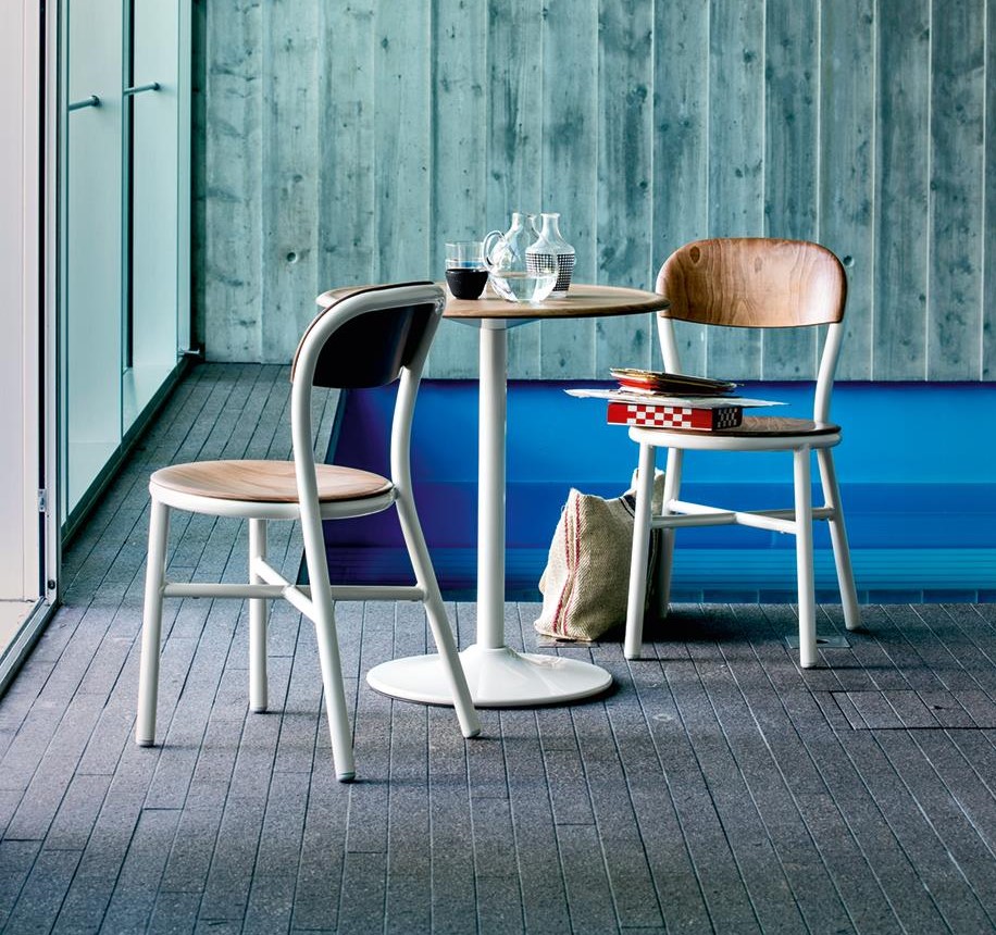 Διατίθεται σε έκδοση με μπράτσα ή χωρίς, με σκελετό αλουμινίου σε λευκό ή μαύρο χρώμα με κάθισμα και πλάτη σε ξύλο οξιάς σε ανοιχτό ή σκούρο φινίρισμα.