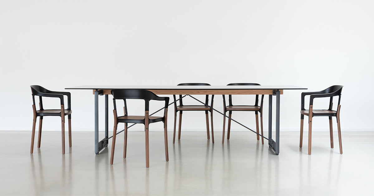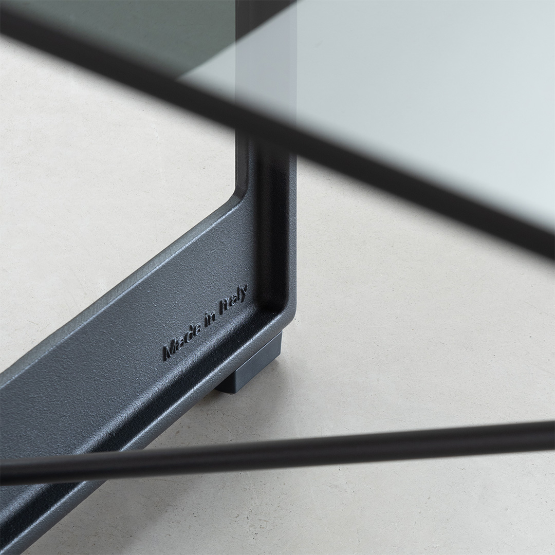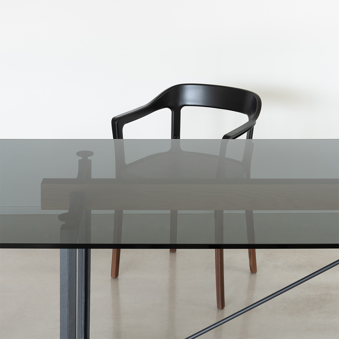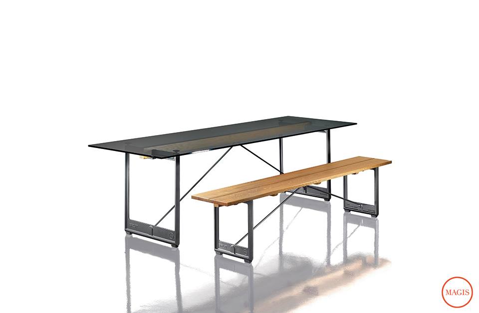Το τραπέζι της συλλογής με την στιβαρή δομή του από μασίφ χυτοσίδηρο, διαθέσιμη σε γκρι ανθρακί, πράσινο και κόκκινο χρώμα, συνδυάζεται με επιφάνεια σε φυσικό δρυ και διάφανο ή smoked γυαλί.