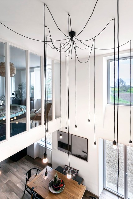 Ένας ένας μεταβαλλόμενος λαμπτήρας οροφής με ατέλειωτους συνδυασμούς. 14 καλώδια μαζί με τις λάμπες τους δημιουργούς γραμμικά σχέδια στην οροφή του χώρου και προσφέρουν άπλετο φως.