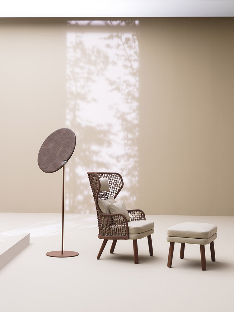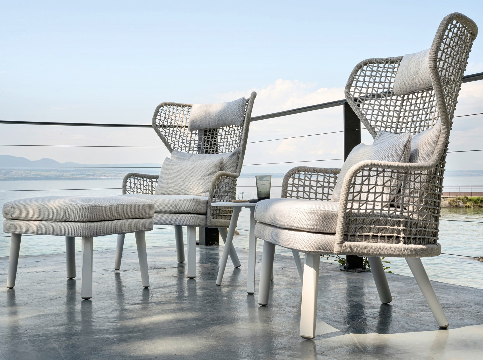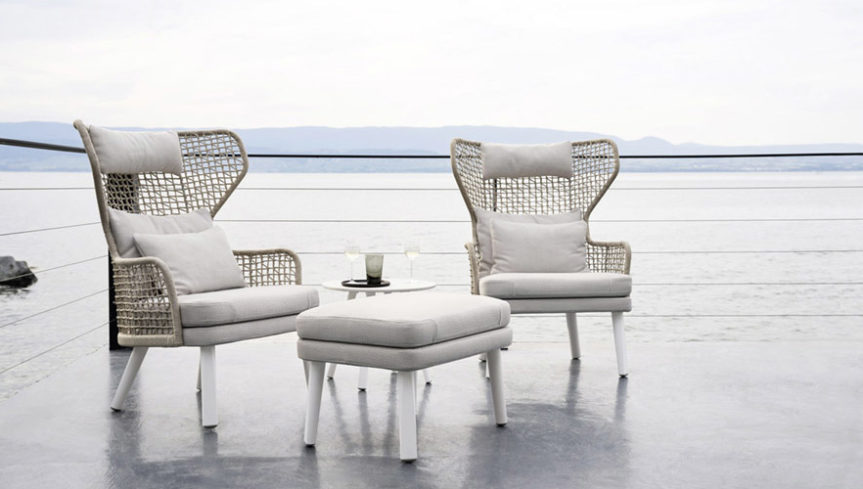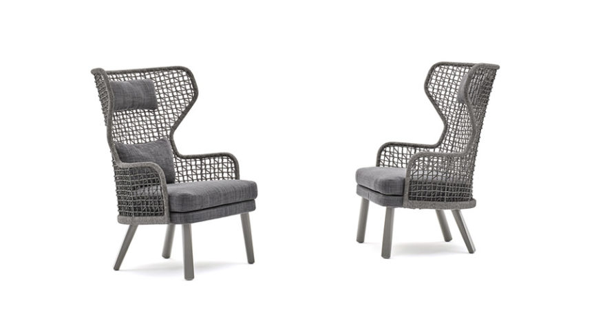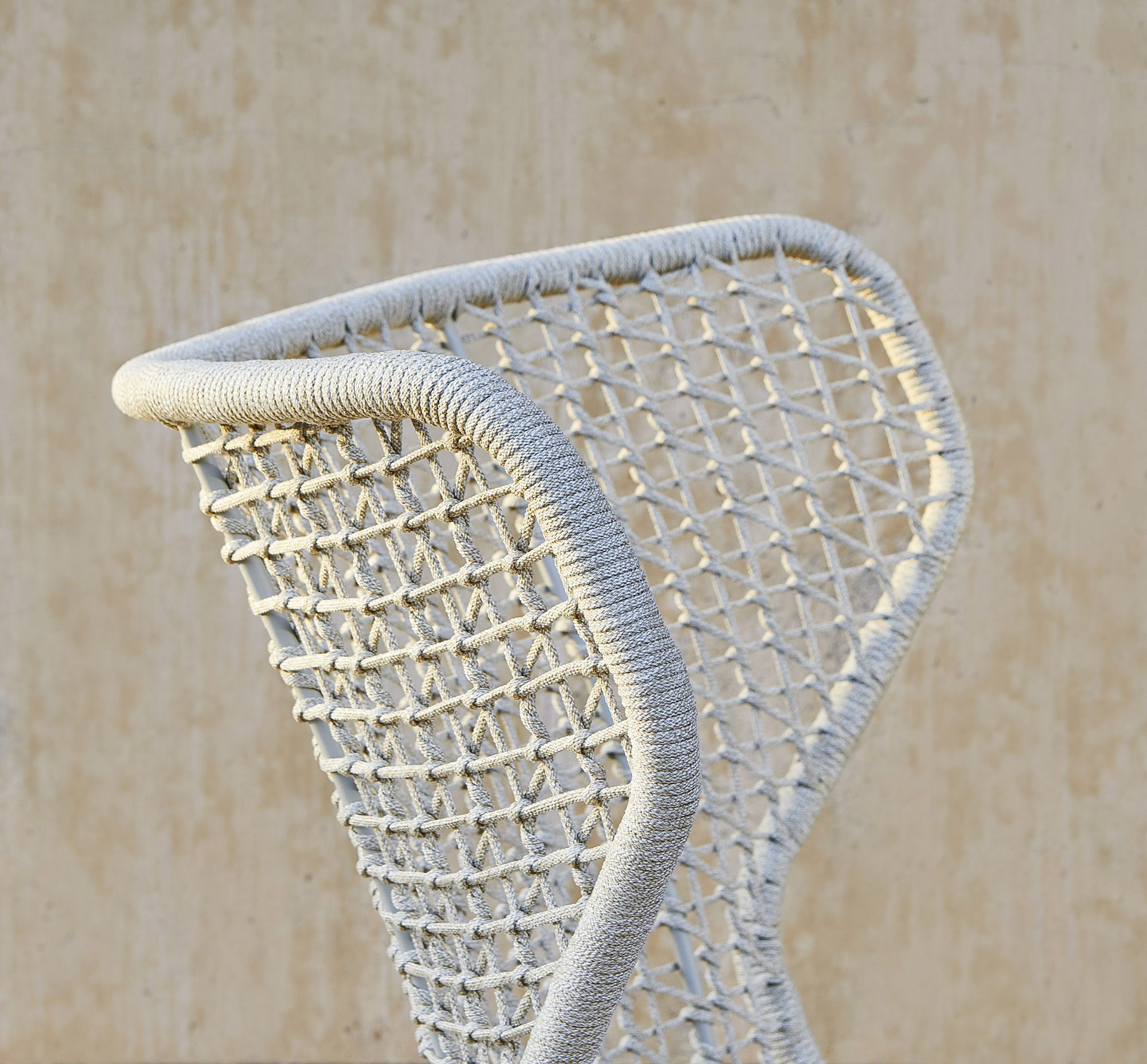 Υλικό: Σκελετός αλουμινίου, χειροποίητη πλέξη συνθετικού σχοινιού, πόδια αλουμινίου ή ξύλο Iroko.