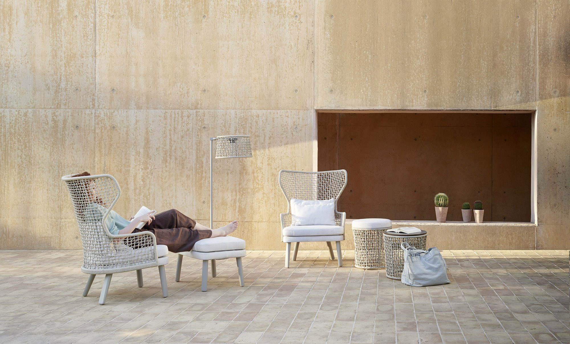 Διατίθεται κατόπιν παραγγελίας με πόδια από αλουμίνιο σε εννέα διαφορετικά φινιρίσματα ή μασίφ ξύλο iroko, πλάτη με ύφανση συνθετικού σχοινιού σε μπέζ, σκούρο γκρί ή rust και μαξιλάρι καθίσματος σε ποικιλία υφασμάτων εξωτερικού χώρου.