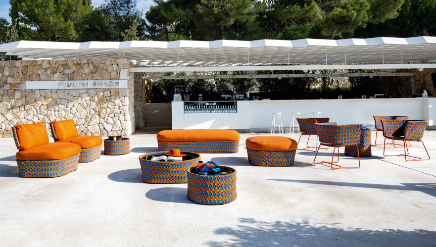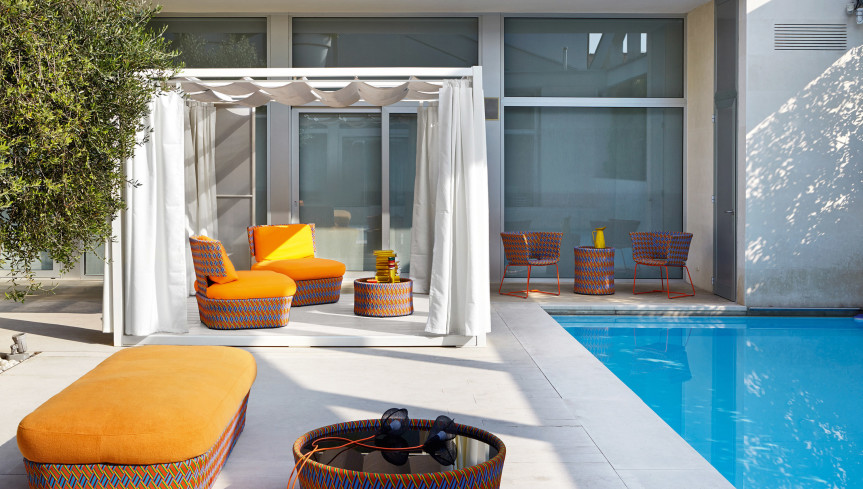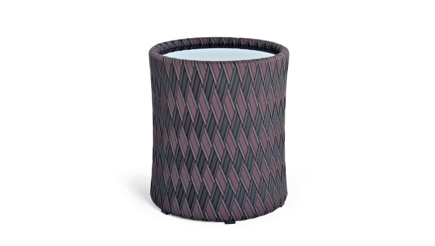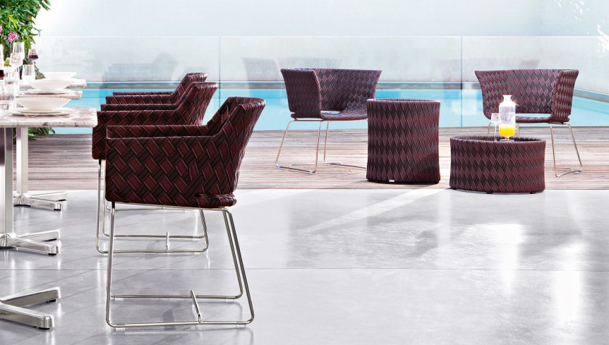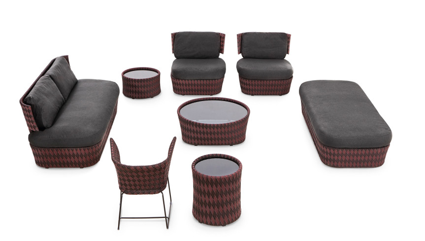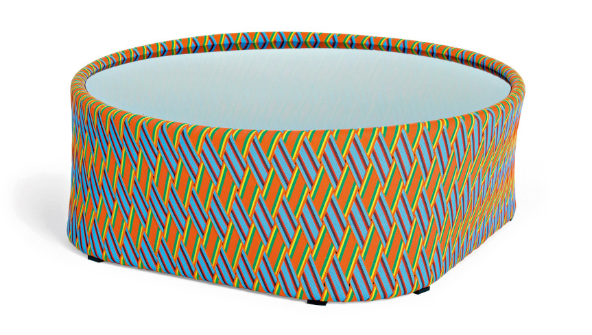 Το πολύχρωμο τραπεζάκι διατίθεται σε διάφορα ύψη και πλάτη και διαθέτει επιφάνεια από διάφανο γκρι γυαλί. Είναι το τέλειο στοιχείο για να συμπληρώσει τις καρέκλες της ίδιας συλλογής, από αλουμίνιο καλυμμένο με μία πλέξη από συνθετικές πολύχρωμες ίνες.