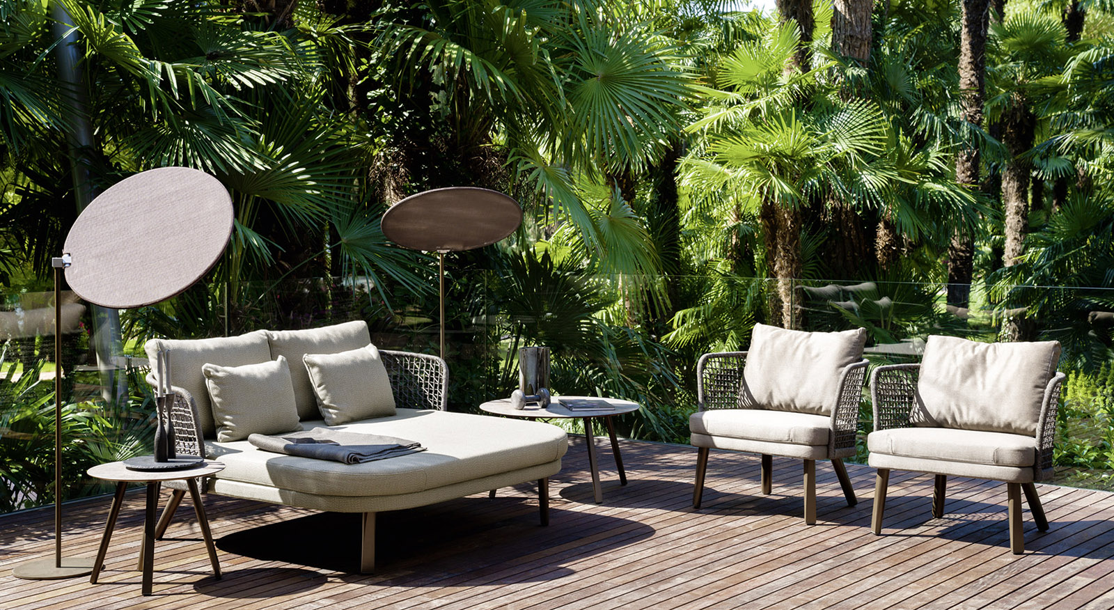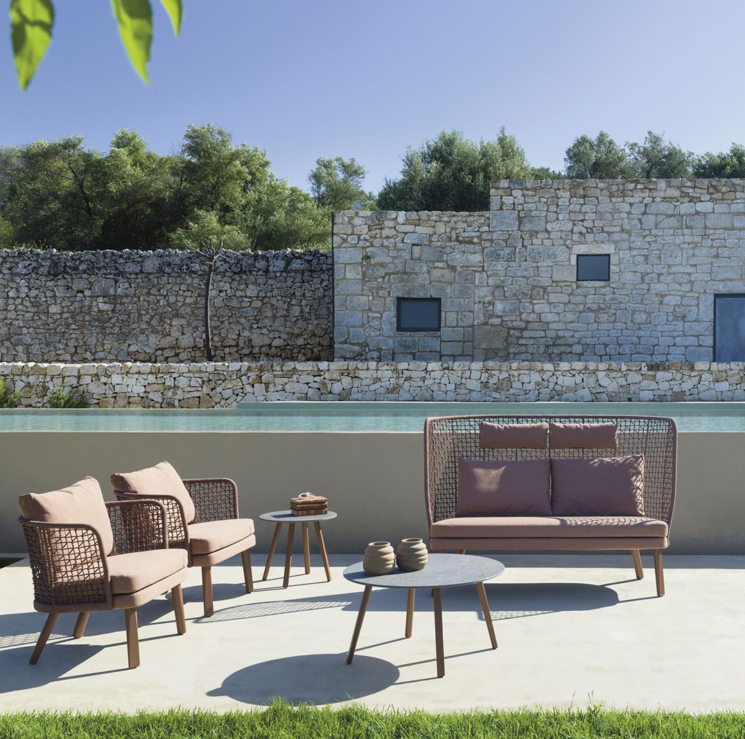 Υλικό: Σκελετός αλουμινίου, χειροποίητη πλέξη συνθετικού σχοινιού, πόδια αλουμινίου ή ξύλο Iroko.