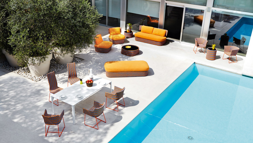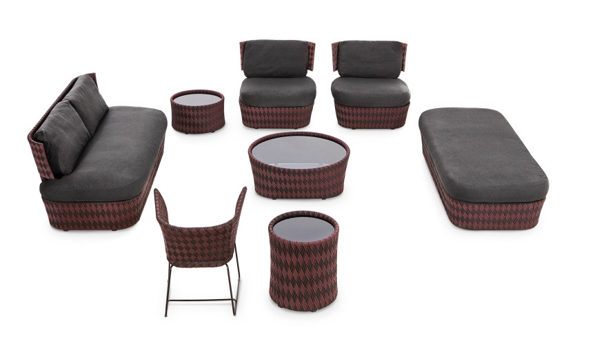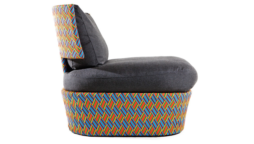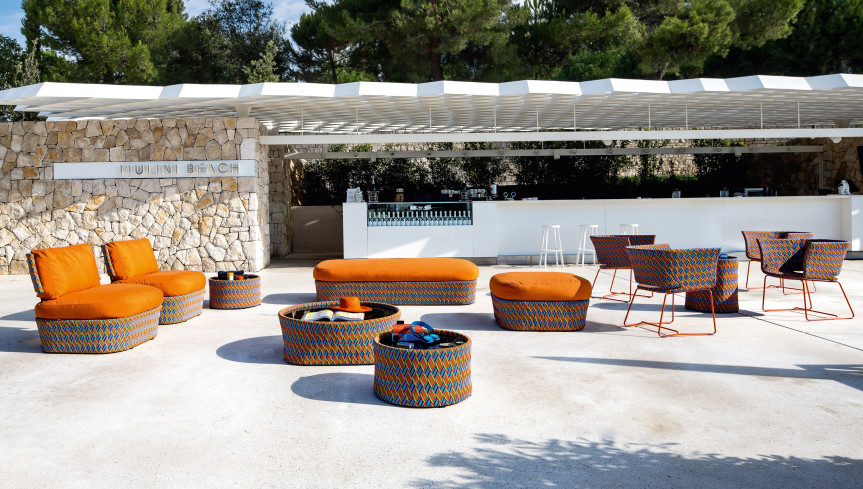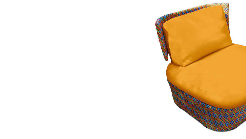 Η πολυθρόνα Kente εξωτερικού χώρου διαθέτει κάθισμα από χειροποίητες πολύχρωμες συνθετικές ίνες και, με τα 1000 χρώματα του, προσφέρει μία χαρούμενη ατμόσφαιρα σε κάθε δωμάτιο ή βιομηχανία Horeca.