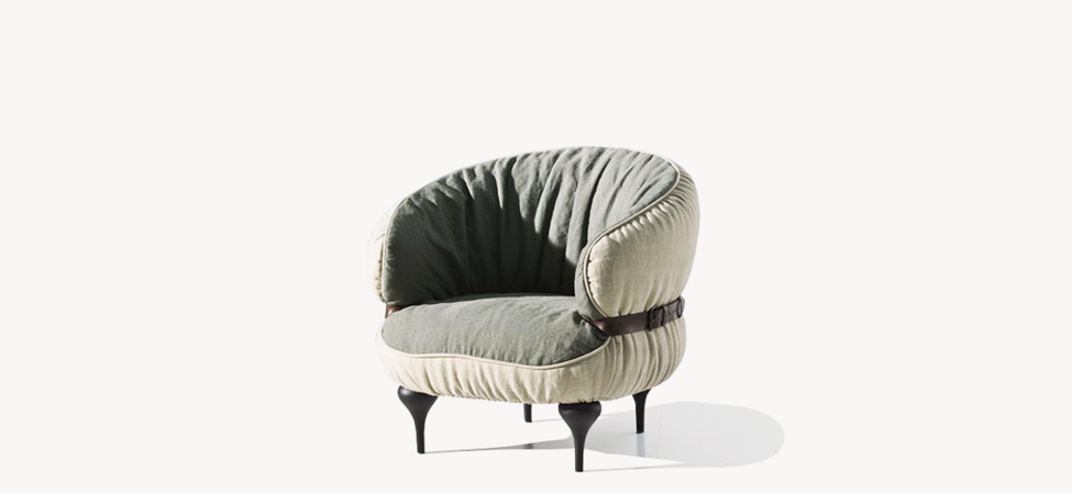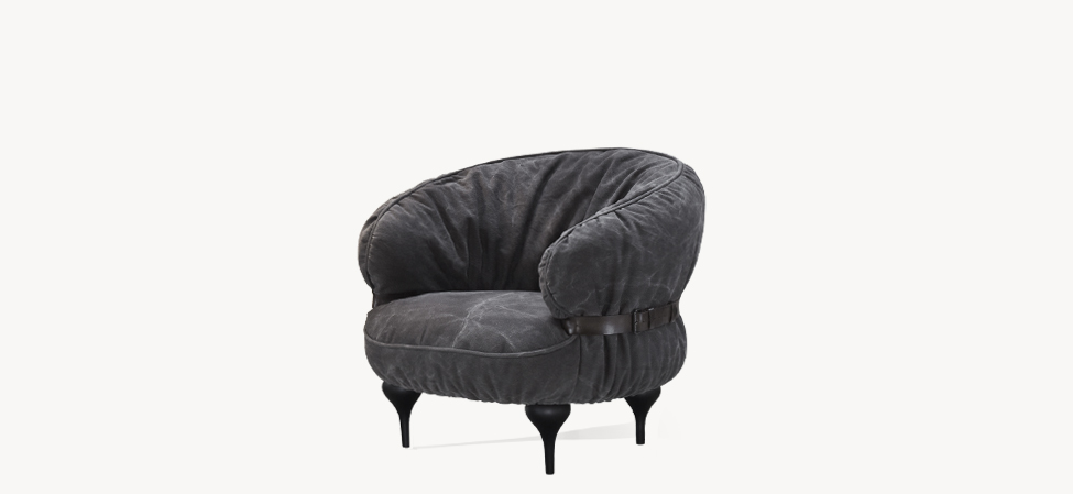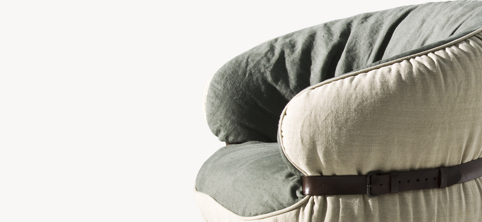 Μοναδικός casual σχεδιασμός και εξαιρετική άνεση. Οι λεπτομέρειες των δερμάτινων ζωνών και λαβών παραπέμπουν με μια διάθεση ειρωνείας στα φινιρίσματα που χρησιμοποιούνται συνήθως στα αξεσουάρ μόδας. Διατίθεται σε ποικιλία αφαιρούμενων υφασμάτων, πόδια σε ξύλο οξιάς βαμμένα raw black και δερμάτινη ζώνη σε σκούρο καφέ.