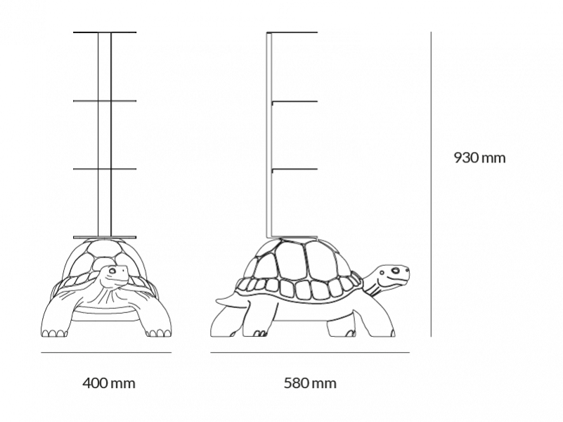 Υλικό: Χελώνα σε πολυαιθυλένιο, βιβλιοθήκη σε μέταλλο.