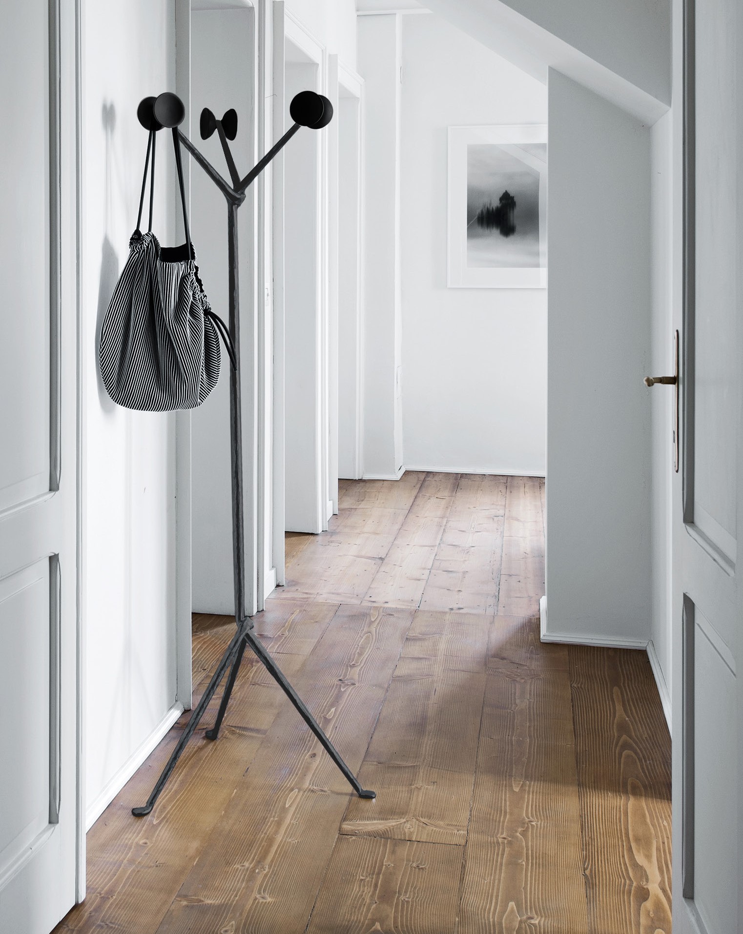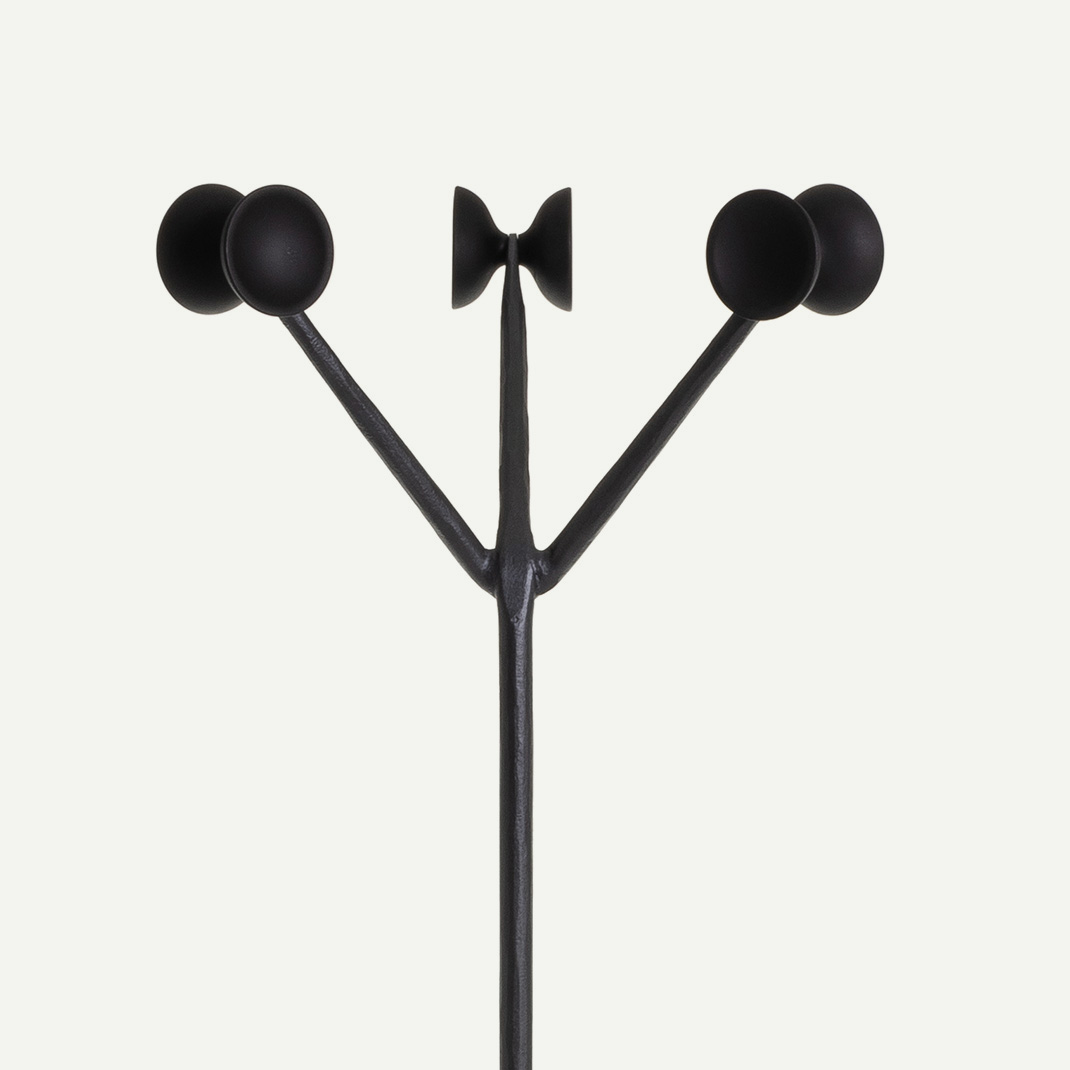 Ο καλόγερος της συλλογής, διατίθεται κατόπιν παραγγελίας με σκελετό από σφυρήλατο σίδερο σε γκρι ανθρακί φινίρισμα και κρεμάστρες από καουτσούκ σε μαύρο χρώμα.