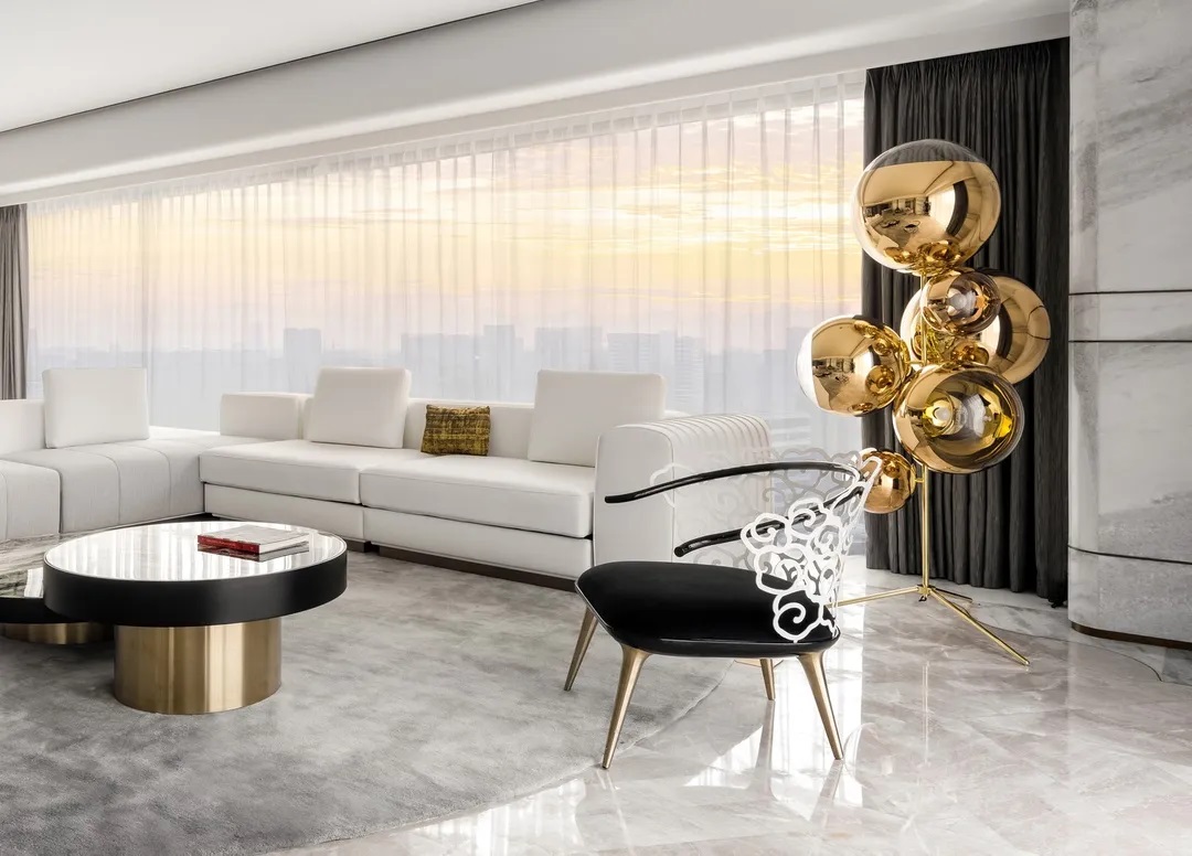 Ένας εξαιρετικός πολυέλαιος δαπέδου, με τρία Melt Mini και τέσσερα Melt σε μοντέρνο χρυσό φινίρισμα. Χάρη στην προσεγμένη κατασκευή του μοιάζει με γυαλί που λιώνει και διαθλά το φώς με ακανόνιστες επιφάνειες και μορφή που φαίνεται διαφορετική απο κάθε οπτική γωνία. Όταν είναι σβηστό, η επιφάνειά του γίνεται καθρέφτης που αντανακλά υπέροχα τον περιβάλλοντα χώρο.
