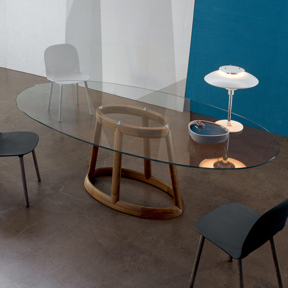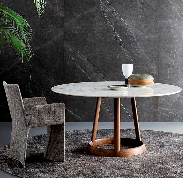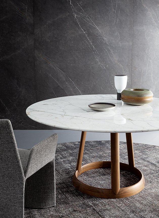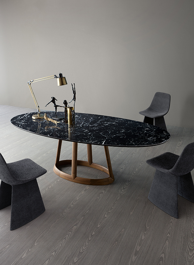 Αυτό το σταθερό τραπέζι χαρακτηρίζεται από την αρμονική κομψότητα της μασίφ ξύλινης βάσης, η οποία διατίθεται σε αμερικανική καρυδιά, με οβάλ ή στρογγυλή κορυφή φτιαγμένη με διαφορετικά φινιρίσματα σε μάρμαρο, γυαλί ή κεραμικό. Η κομψότητα της γραμμής της επιφάνειας, συνδυάζεται τέλεια με το υλικό και την κατασκευαστική λεπτομέρεια της βάσης: το αποτέλεσμα είναι ένα τραπέζι που εκφράζει την προσωπικότητα και την οπτική ελαφρότητα, με έντονο κλασσικό ύφος χωρίς, ταυτόχρονα, να απορρίπτει την σύγχρονη αισθητική.