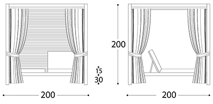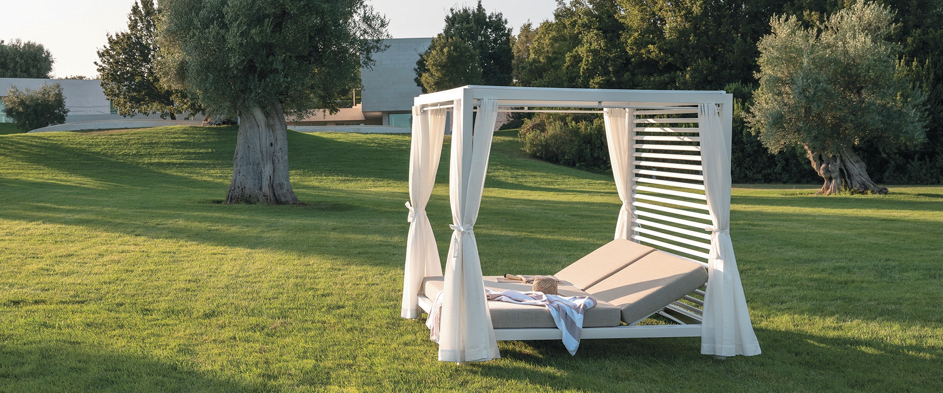 Είτε στην παραλία, στον κήπο ή στην πισίνα, το κιόσκι Bivacco σας επιτρέπει να απολαύσετε μια ολόκληρη μέρα σε εξωτερικούς χώρους, προστατευμένοι από τον ήλιο κατά τις πιο ζεστές ώρες. Ο λευκός σκελετός αλουμινίου είναι εξοπλισμένος με κουρτίνες στις τρεις πλευρές και τέντα στην οροφή. Οι πλάτες των καθισμάτων είναι ανεξάρτητες και ανακλινόμενες, για να εγγυηθούν σε όλους τη δική τους άνεση. Το κιόσκι Bivacco χρησιμοποιείται ευρέως σε επαγγελματικούς χώρους, επιλέγεται ωστόσο και σε ιδωτικούς εξωτερικούς χώρους. Το στρώμα καθίσματος διατίθεται σε ποικιλία χρωμάτων.