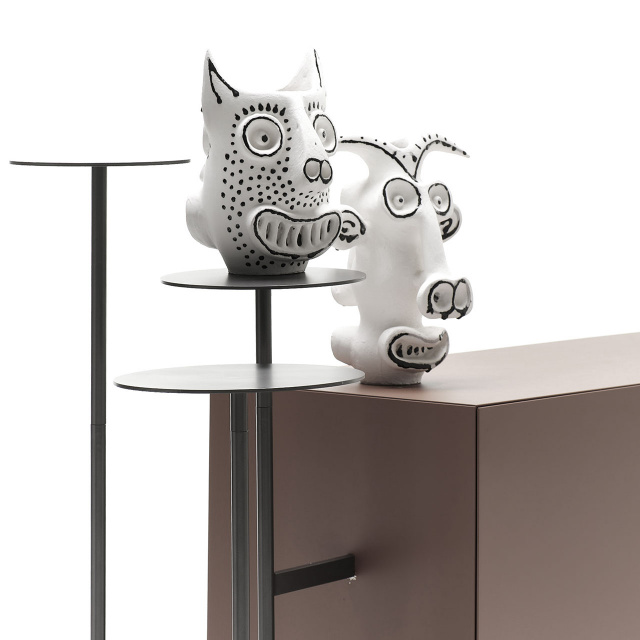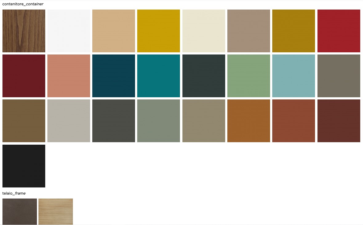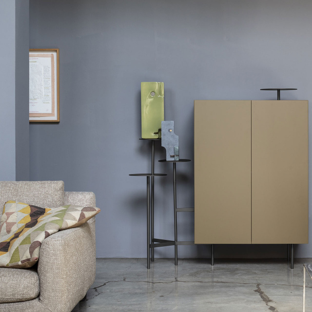 Διατίθεται σε ψηλή και χαμηλή έκδοση, με μεταλικό σκελετό σε φινίρισμα burnished ή bronze πατιναριστό και μπουφέ σε ξύλο ή σε λακαριστό ξύλο σε ποικιλία χρωμάτων.