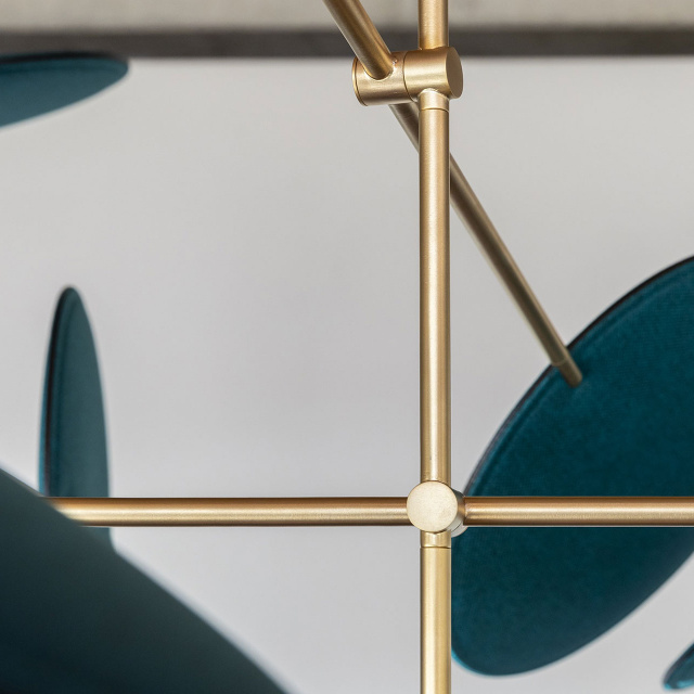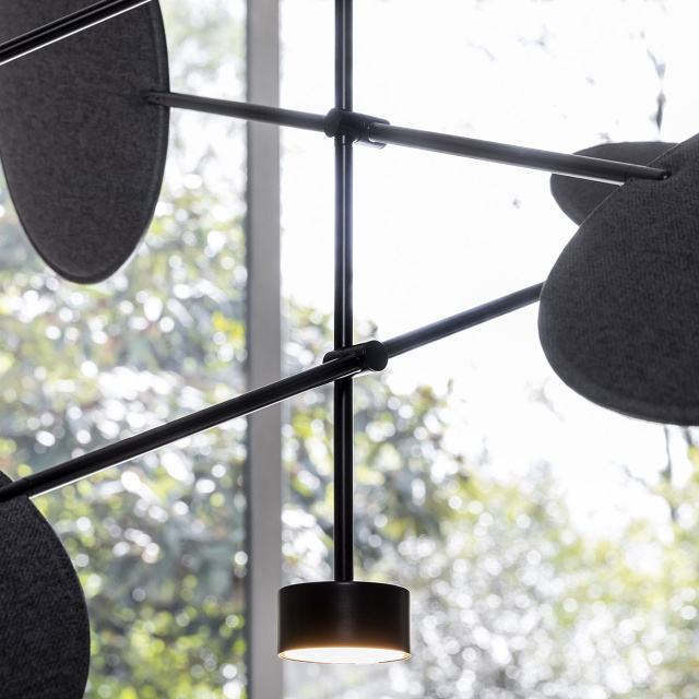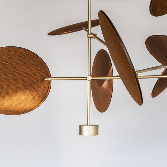 Το φωτιστικό οροφής Diva, χάρη στη λεπτή μεταλλική του δομή και τους ρυθμιζόμενους δίσκους, αιχμαλωτίζει την προσοχή και διακοσμεί κάθε χώρο με έντονο στύλ. Ο μεταλλικός σκελετός διατίθεται σε μαύρο ή χρυσό φινίρισμα. Οι ρυθμιζόμενοι δίσκοι διαθέτουν ηχοαπορροφητικές ιδιότητες και είναι καλυμμένοι με ύφασμα μελανζέ, σε 7 διαφορετικά χρώματα.