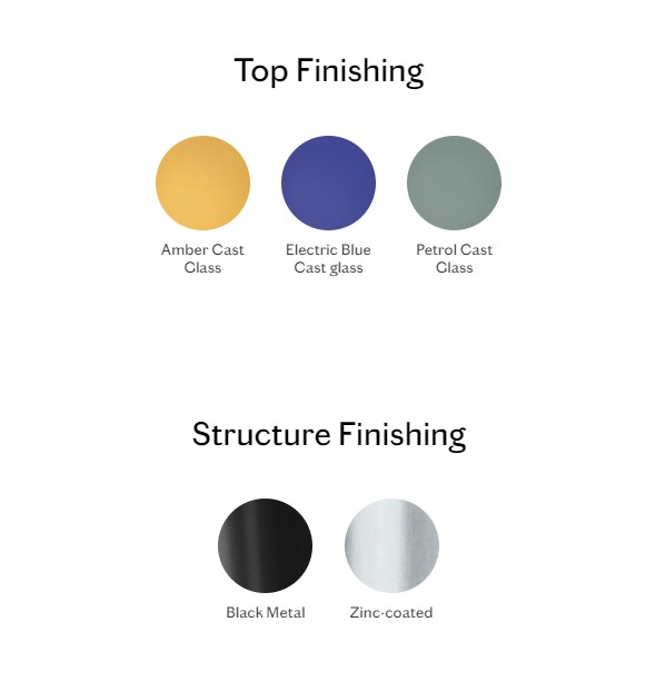 Διατίθενται κατόπιν παραγγελίας σε 2 διαφορετικές διαστάσεις, με επιφάνεια σε χρώμα amber, petrol, electric blue και μεταλλική βάση σε ψευδάργυρο ή με μαύρο φινίρισμα.