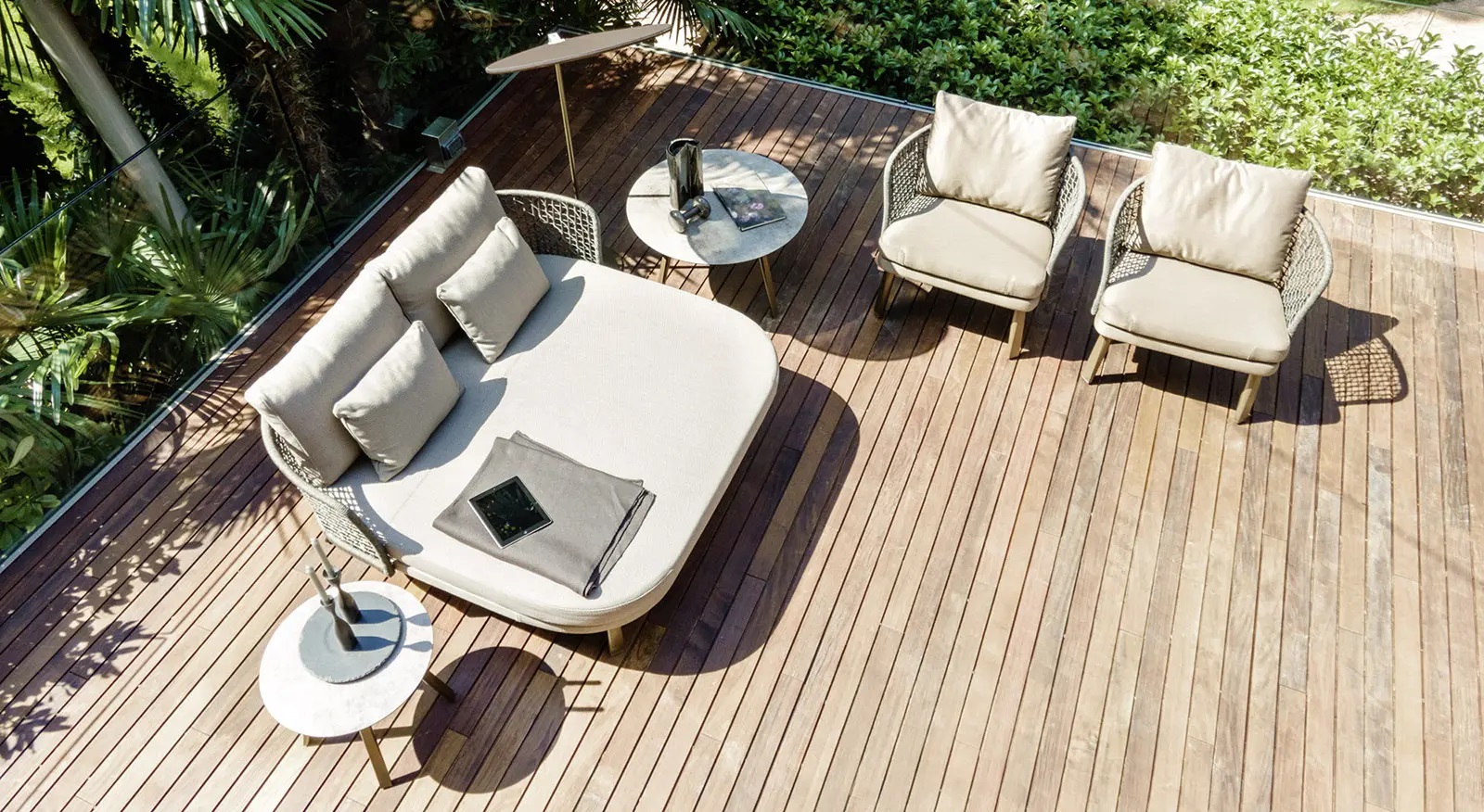 Υλικό: Σκελετός αλουμινίου, χειροποίητη πλέξη συνθετικού σχοινιού, πόδια αλουμινίου ή ξύλο Iroko.
