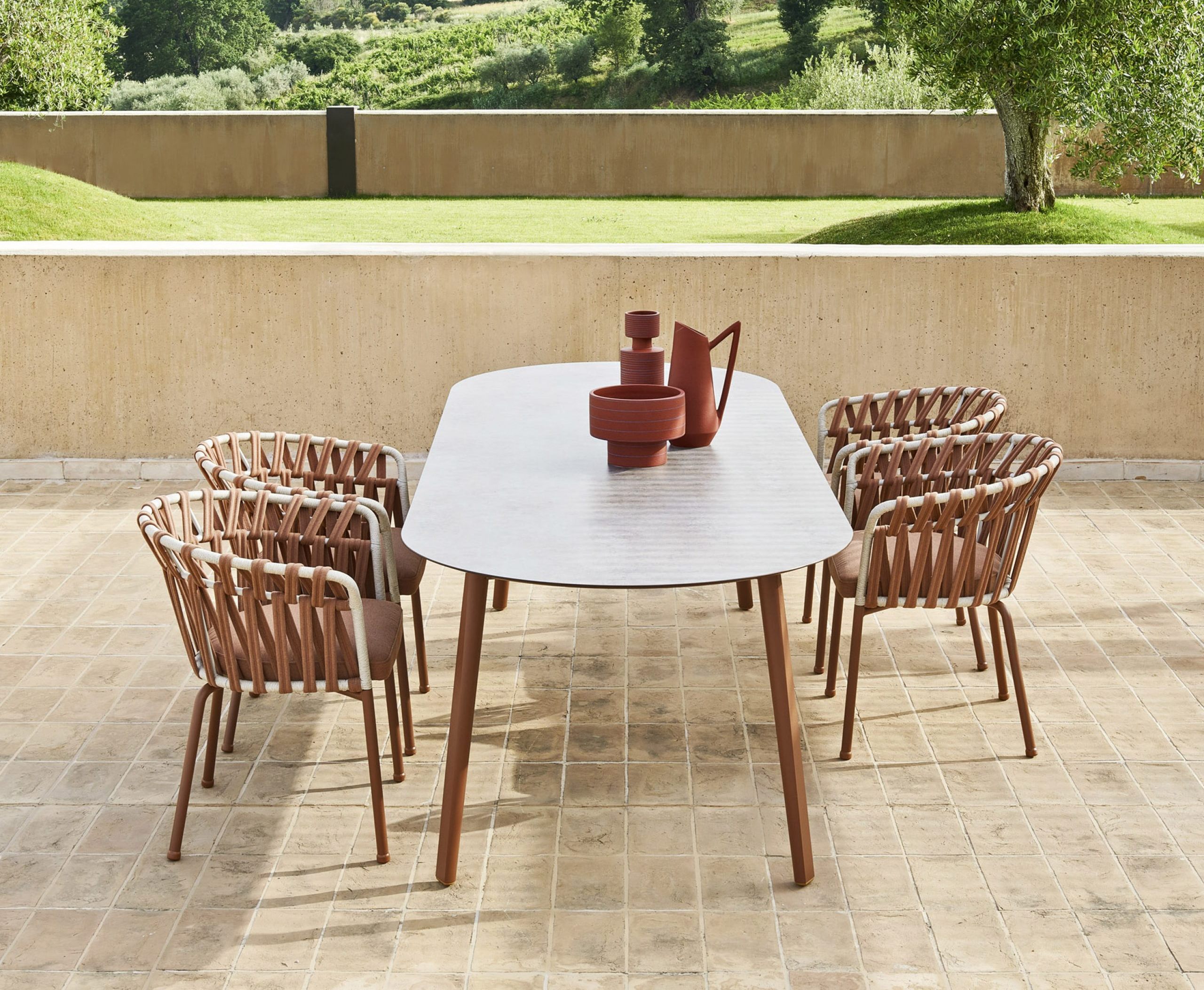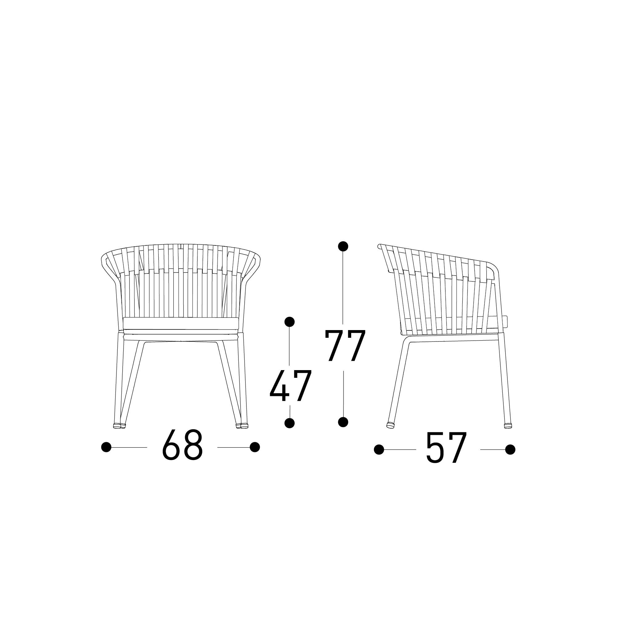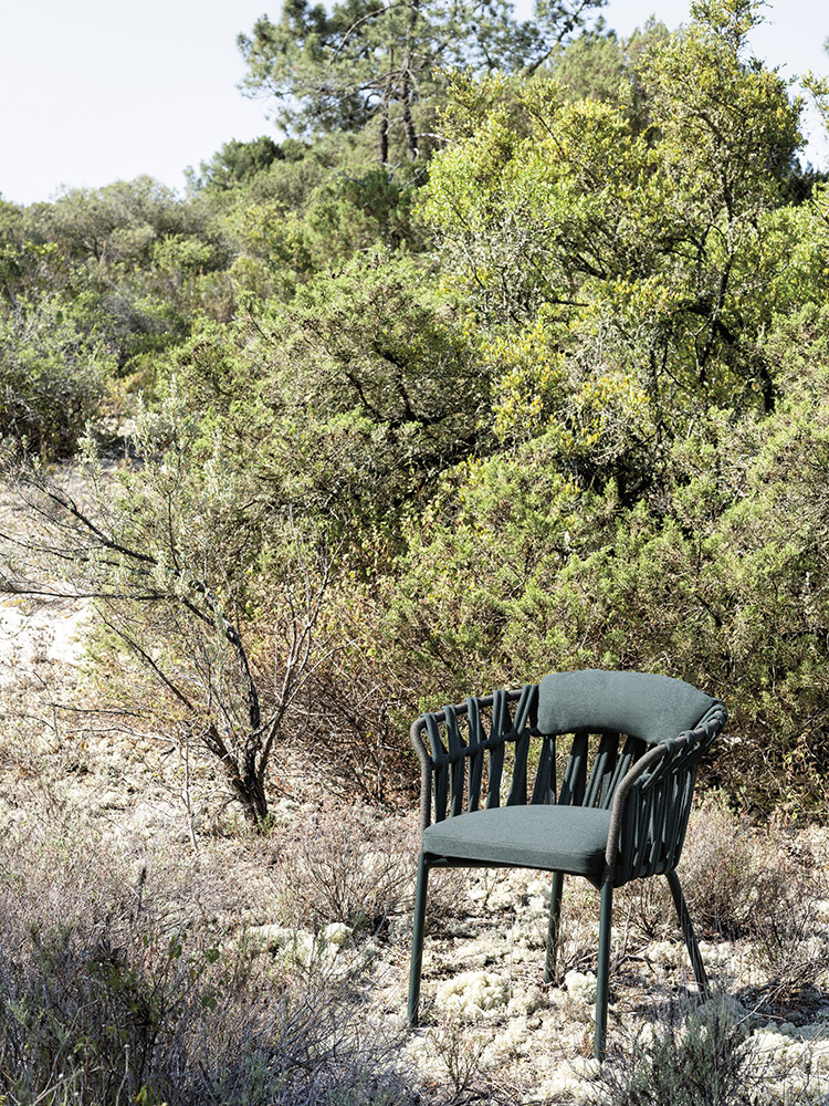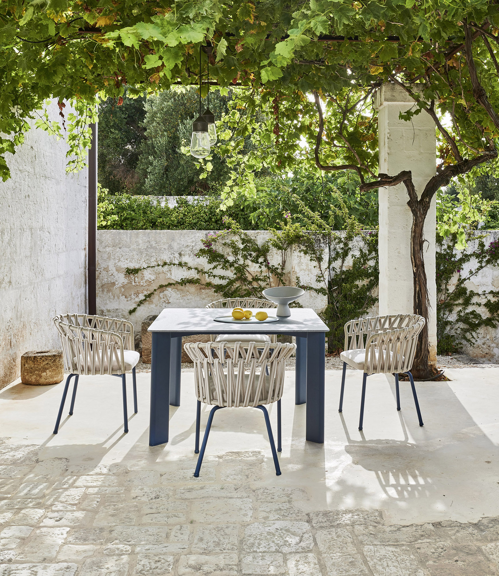 Η πολυθρόνα δείπνου Emma Cross διατίθεται κατόπιν παραγγελίας με πόδια από αλουμίνιο σε εννέα διαφορετικά φινιρίσματα, πλάτη με ύφανση συνθετικού σχοινιού και υφασμάτινες λωρίδες σε διαφορετικά χρώματα.