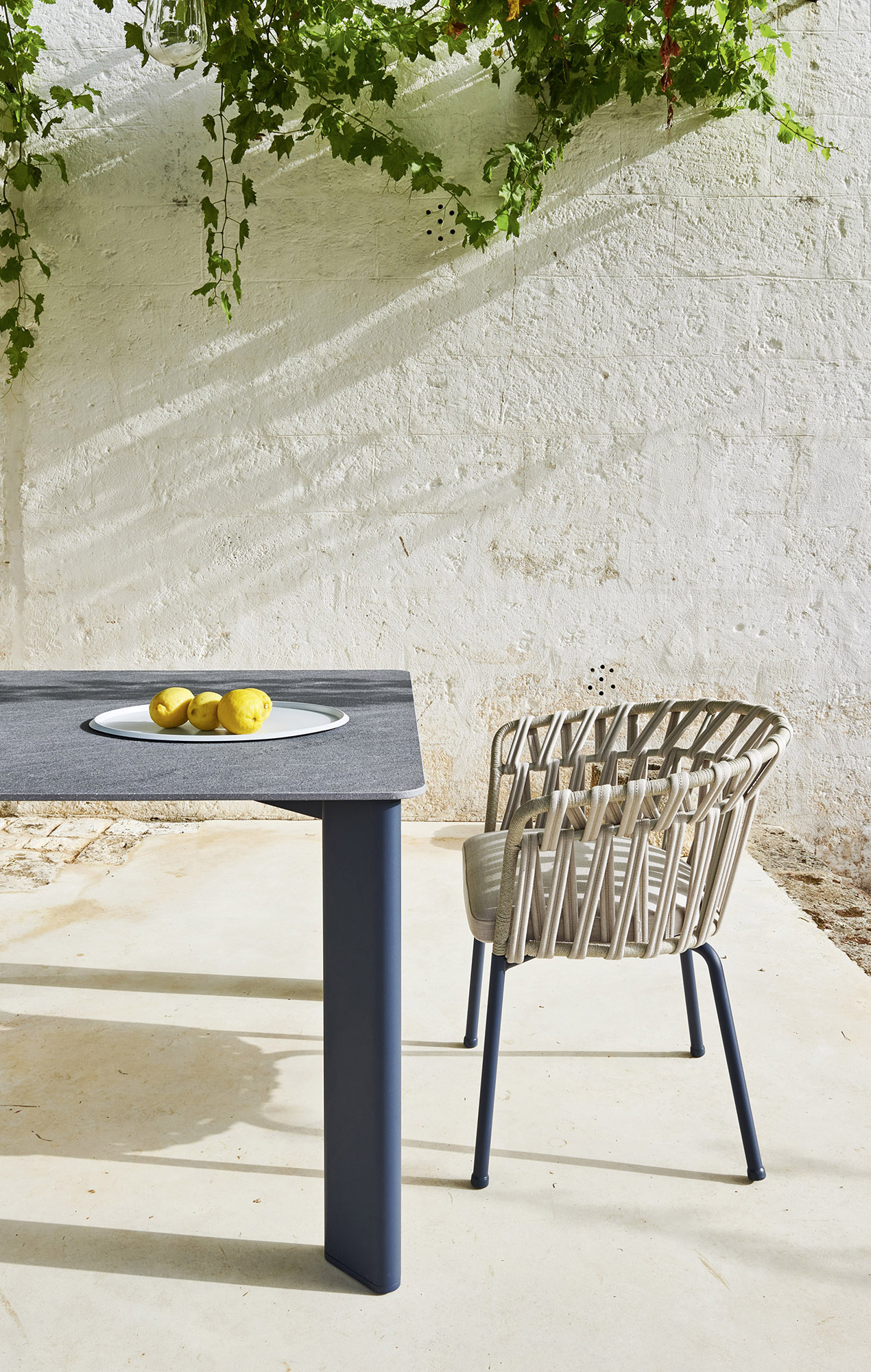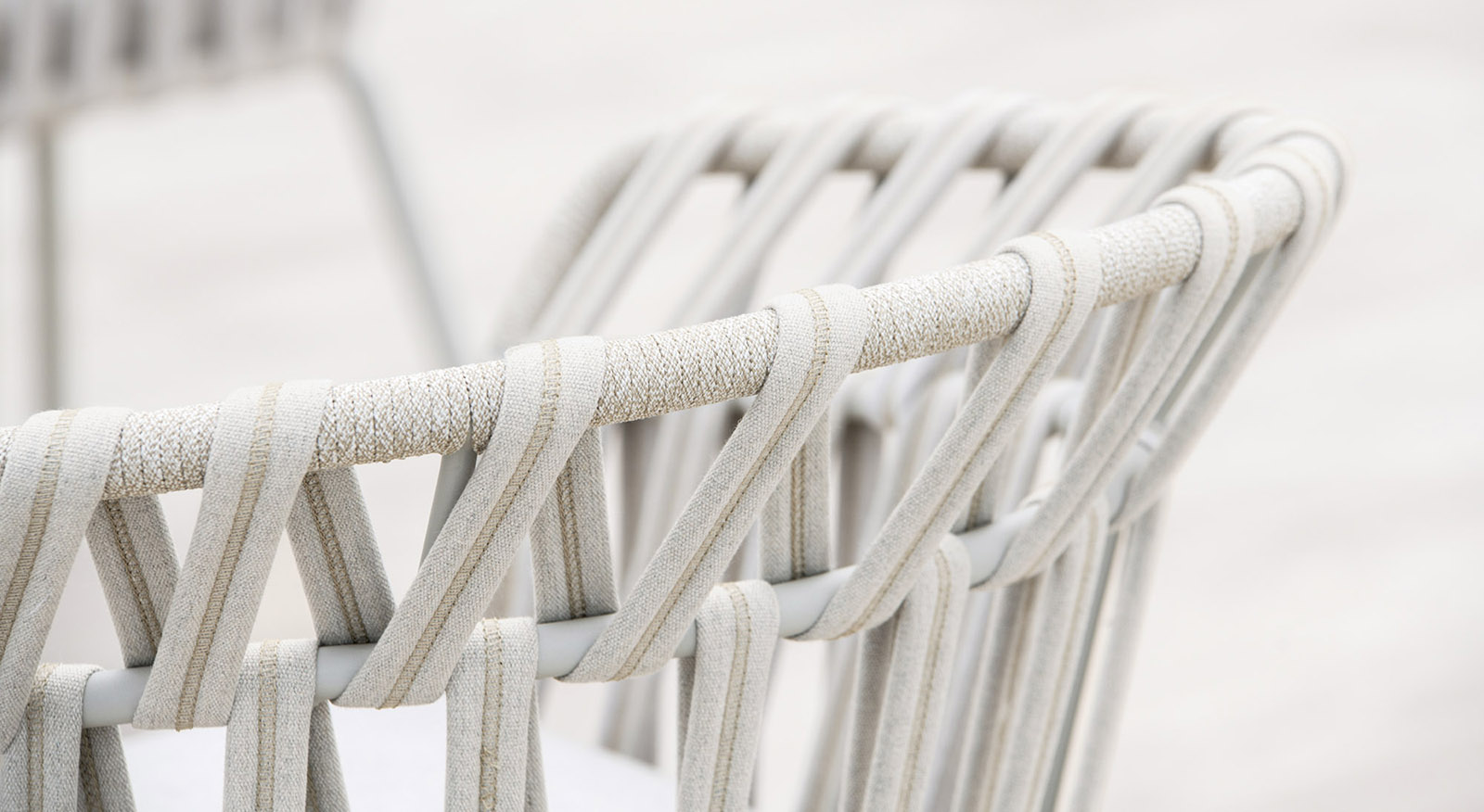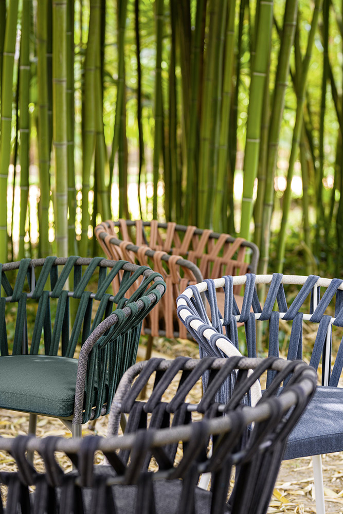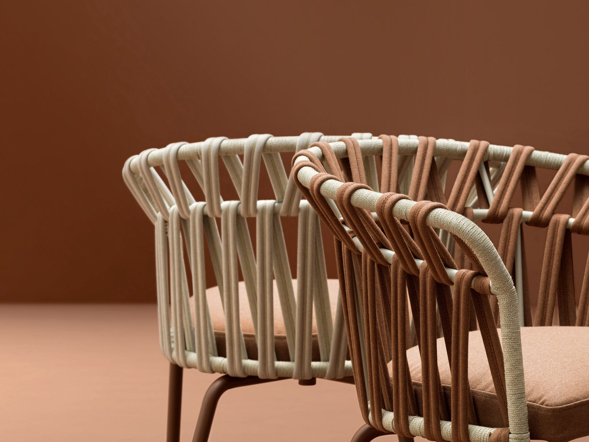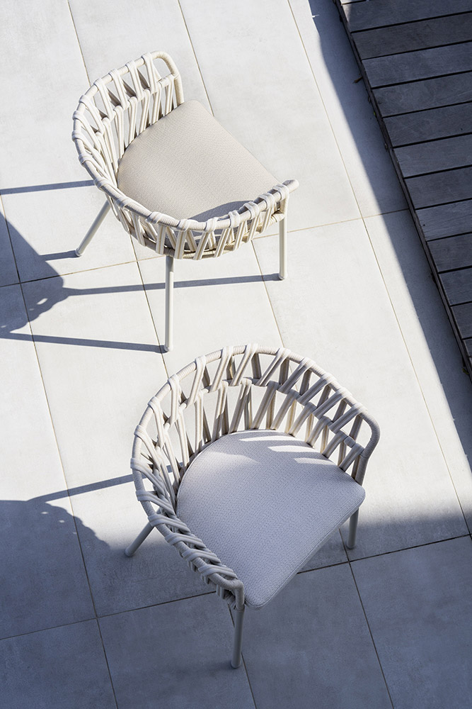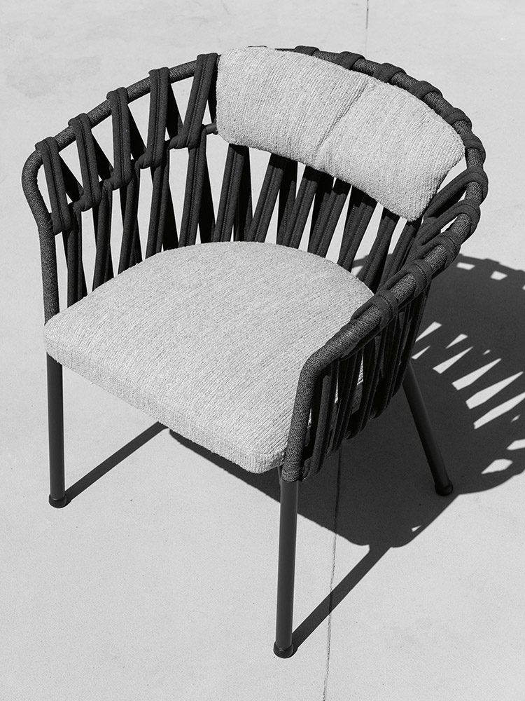 Εμπνευσμένη από τα πέταλα ενός λουλουδιού, η συλλογή Emma Cross έχει ένα design που περικλείει, καλωσορίζει και χαλαρώνει. Η λωρίδα από ακρυλικό ύφασμα, αγκαλιάζει την πλέξη του σχοινιού που καλύπτει το πλαίσιο αλουμινίου, σχεδιάζοντας την επιφάνεια της πλάτης με διαγώνιες γραμμές. Μια διπλή ύφανση που γίνεται το εμβληματικό μοτίβο αυτής της κομψής συλλογής για εξωτερικούς χώρους. Οι χρωματικές επιλογές της Emma Cross, δίνουν ζωή σε μια φρέσκια και κομψή πρόταση, ιδανική τόσο για οικιακούς όσο και για επαγγελματικούς χώρους.