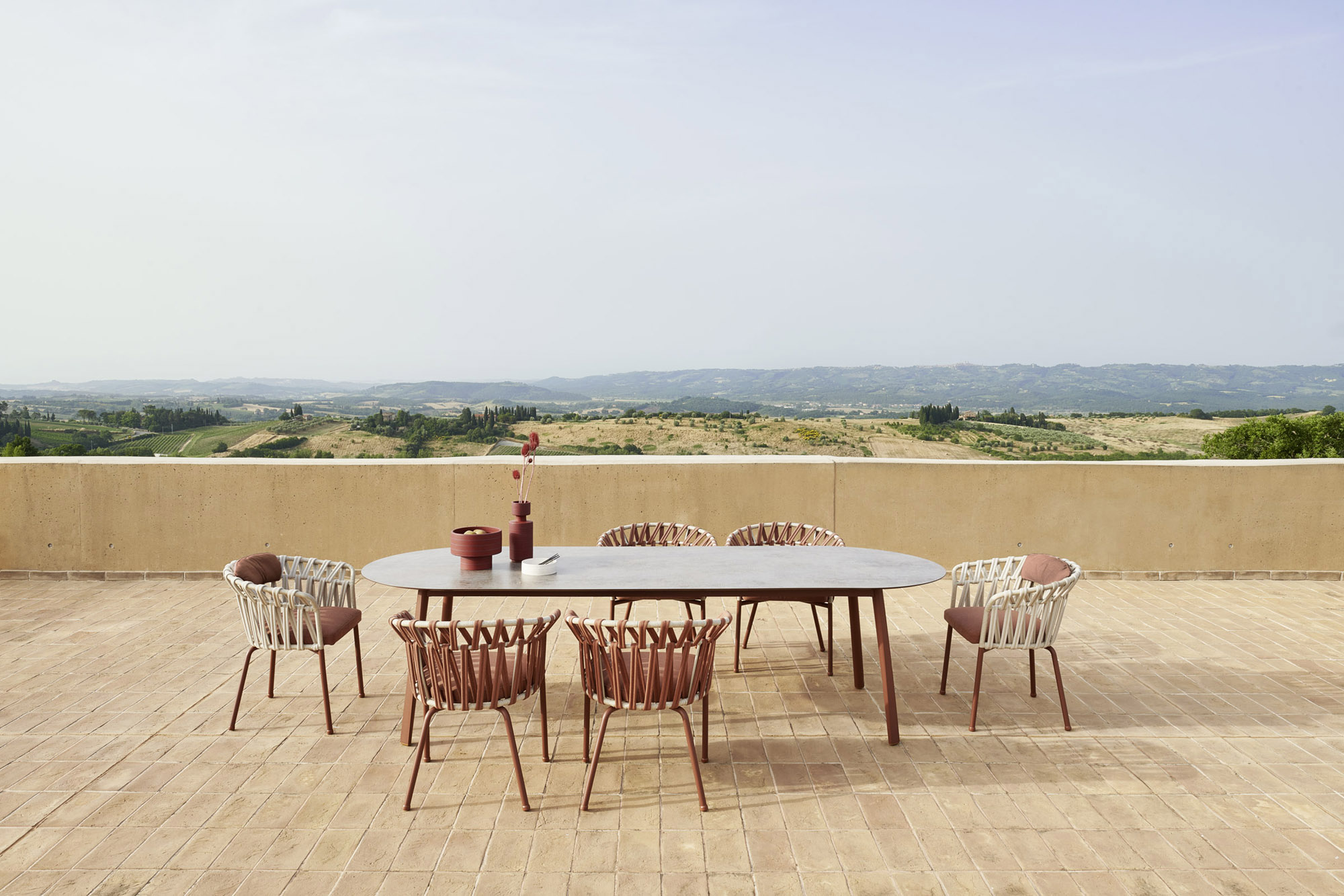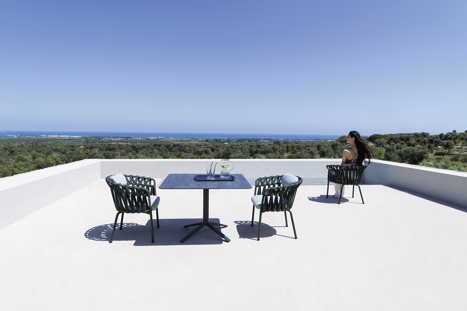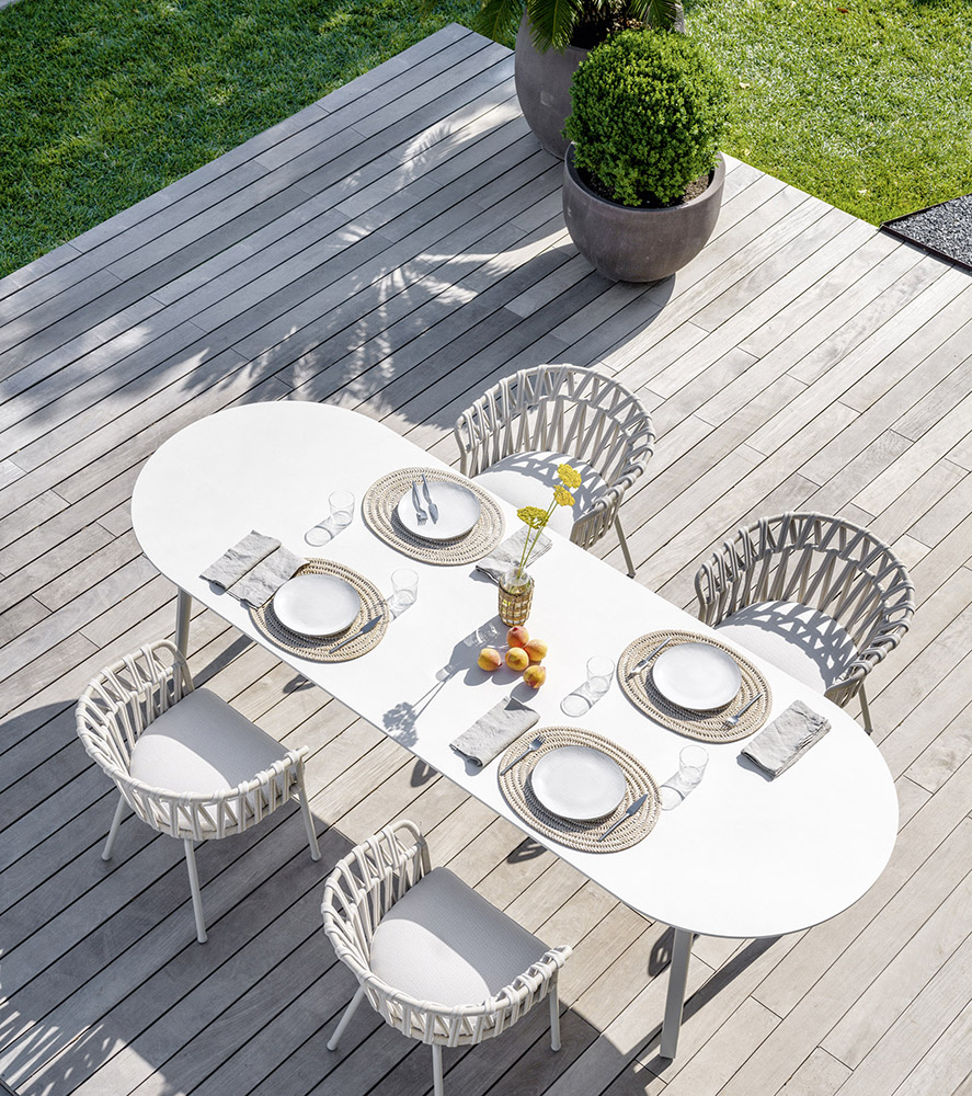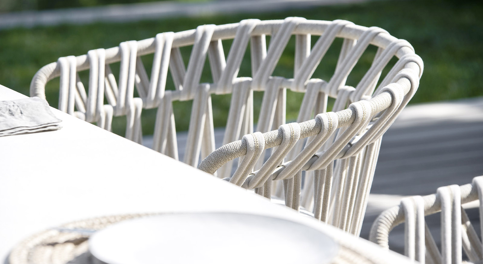 Εμπνευσμένη από τα πέταλα ενός λουλουδιού, η συλλογή Emma Cross έχει ένα design που περικλείει, καλωσορίζει και χαλαρώνει. Η λωρίδα από ακρυλικό ύφασμα, αγκαλιάζει την πλέξη του σχοινιού που καλύπτει το πλαίσιο αλουμινίου, σχεδιάζοντας την επιφάνεια της πλάτης με διαγώνιες γραμμές. Μια διπλή ύφανση που γίνεται το εμβληματικό μοτίβο αυτής της κομψής συλλογής για εξωτερικούς χώρους. Οι χρωματικές επιλογές της Emma Cross, δίνουν ζωή σε μια φρέσκια και κομψή πρόταση, ιδανική τόσο για οικιακούς όσο και για επαγγελματικούς χώρους.
