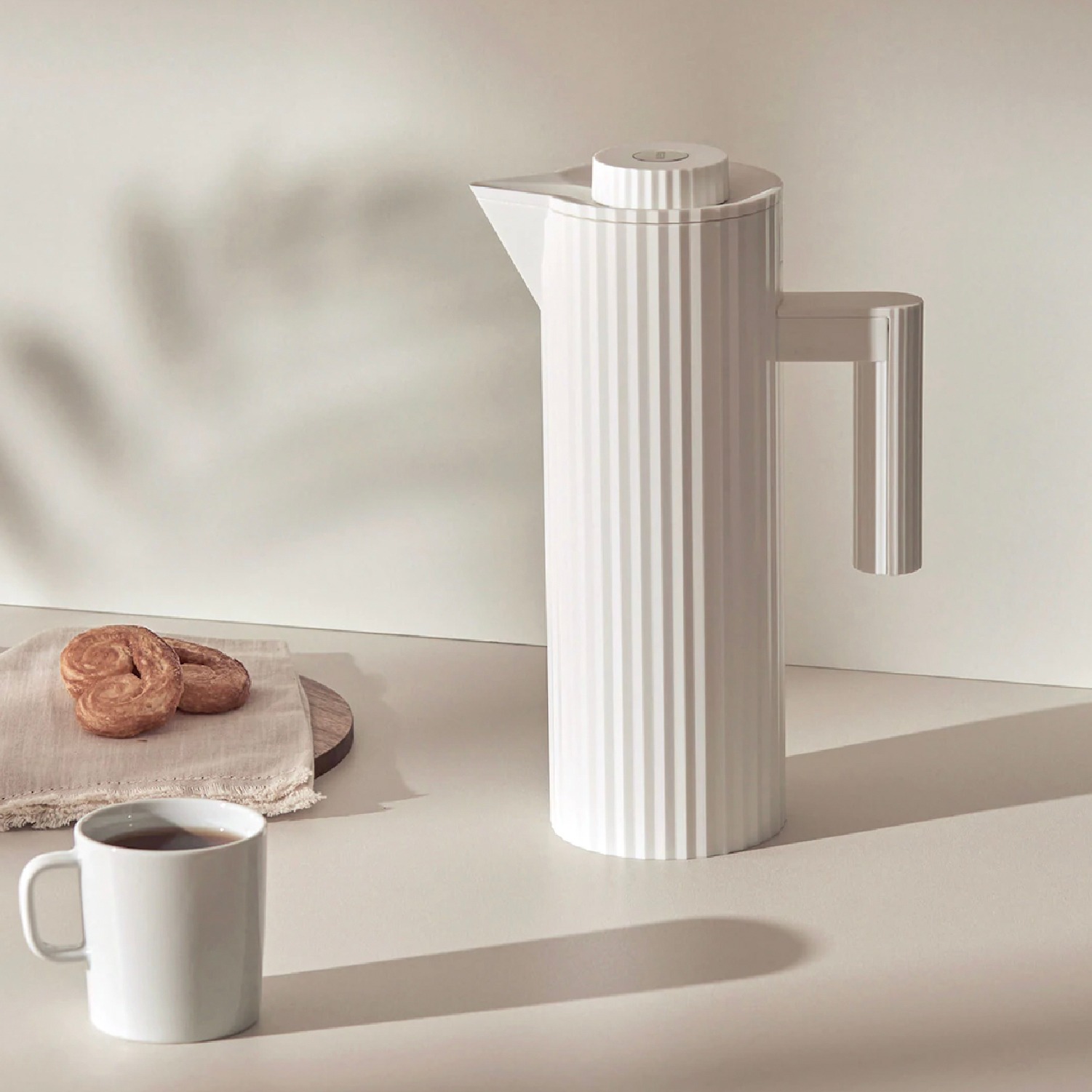 Σχεδιασμένη από τον Michele De Lucchi, η κανάτα θερμός Plissé συνδυάζει την λειτουργικότητα με ένα συναρπαστικό design που αποκαλύπτει το αρχιτεκτονικό υπόβαθρο του δημιουργού, καθώς και το πάθος του για τη χειροτεχνία και τη γλυπτική. Σαν ένα ύφασμα που οι πιέτες του προσδίδουν ένα τρισδιάστατο σχήμα, αυτή η κανάτα θερμός θυμίζει φόρεμα υψηλής ραπτικής, ένα όμορφο αντικείμενο που πρέπει να εκτίθεται σε περίοπτη θέση της κουζίνας σας.