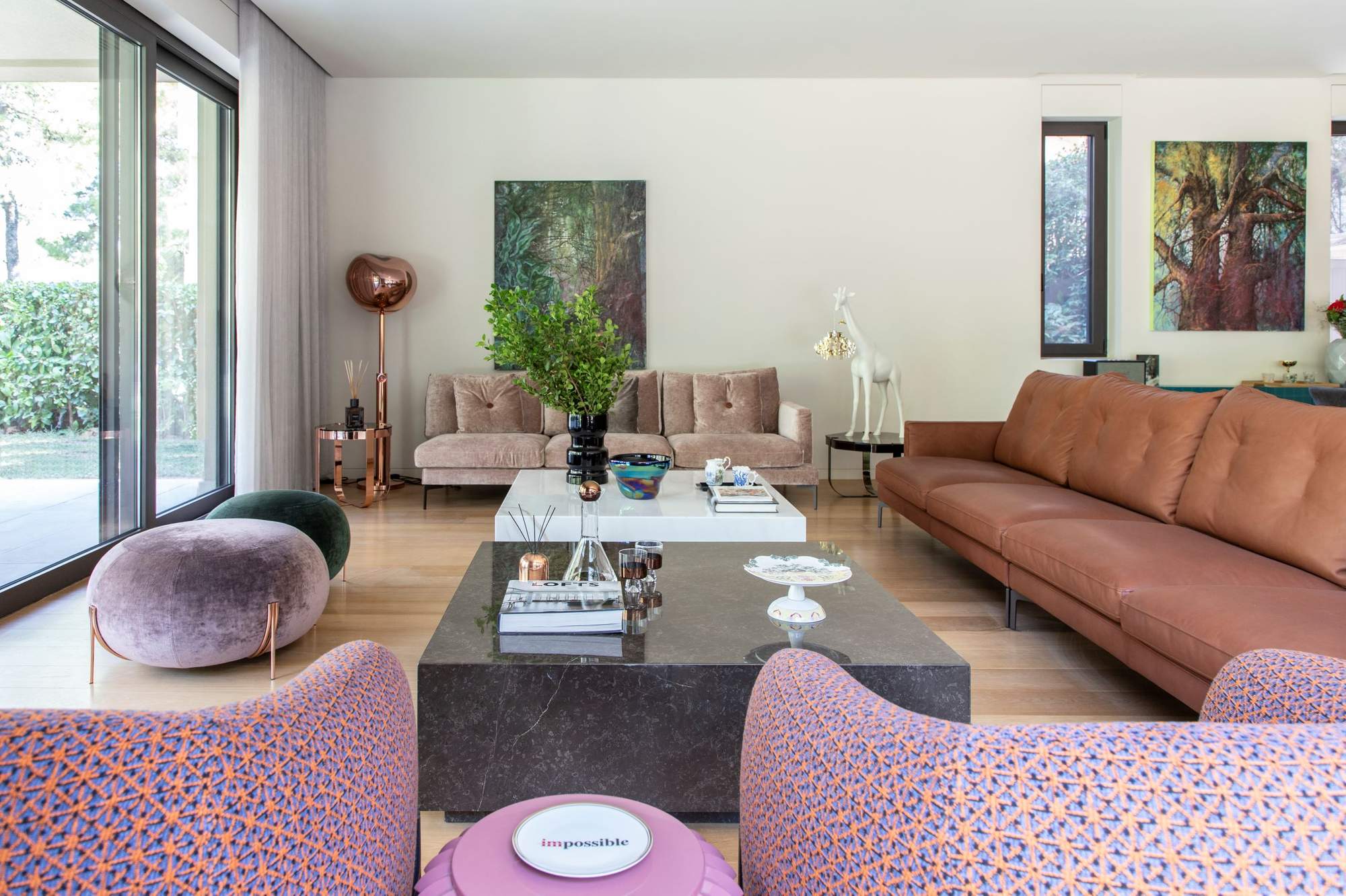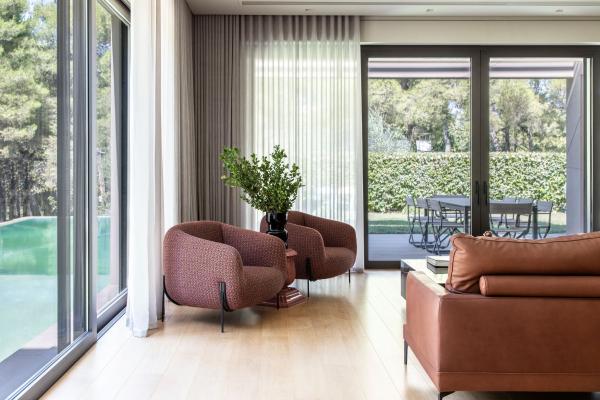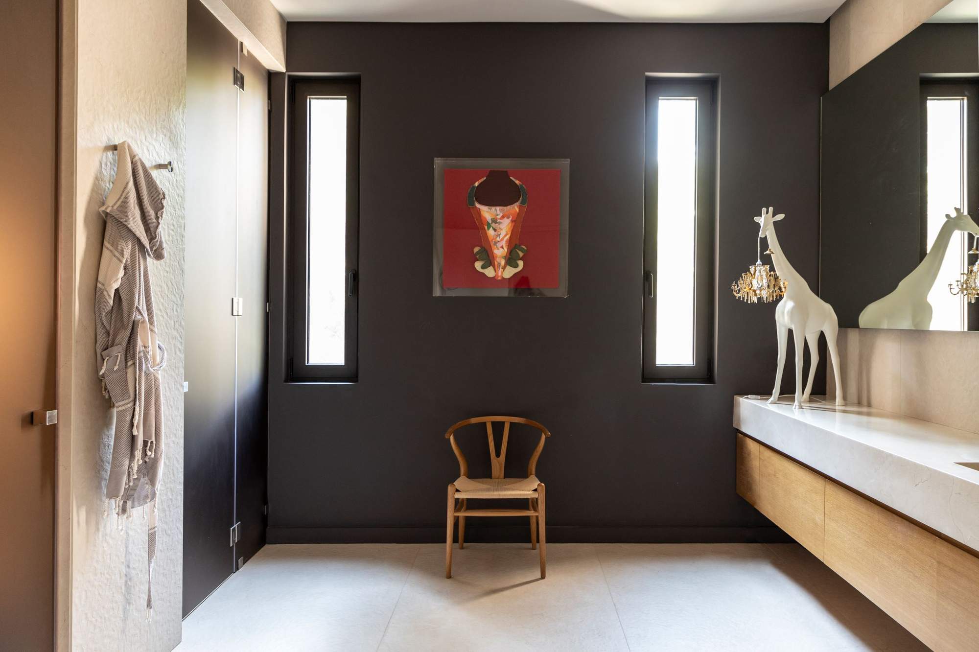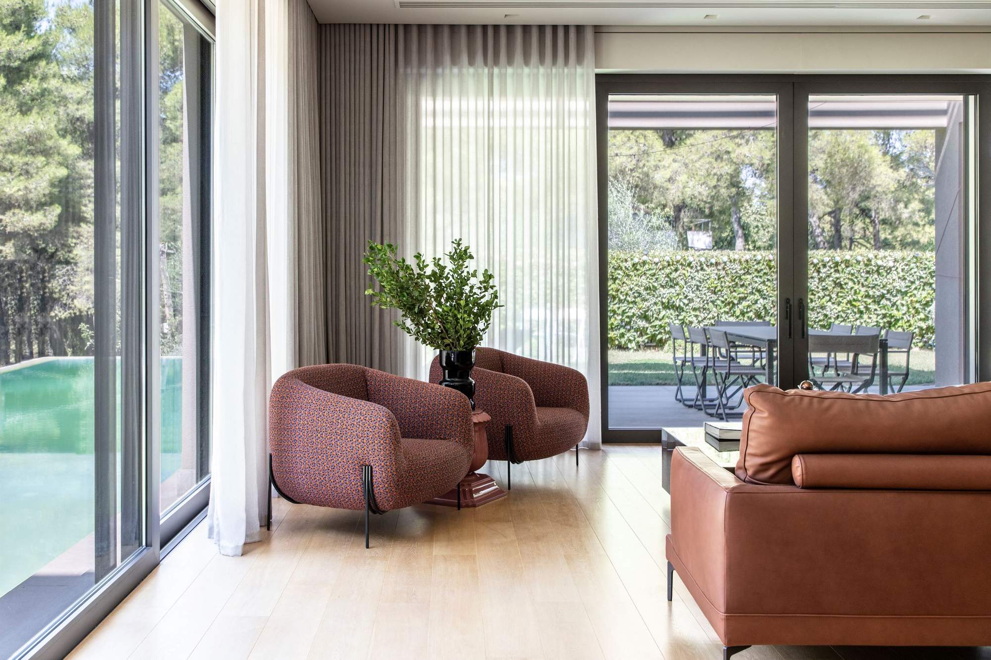 Καρυδιά, βελούδο, μάρμαρο και χρυσό τα υλικά που επιλέχθηκαν να συνδυαστούν με πίνακες, και μεγάλα ανοίγματα που περιβάλλονται από φυσικό πράσινο.
