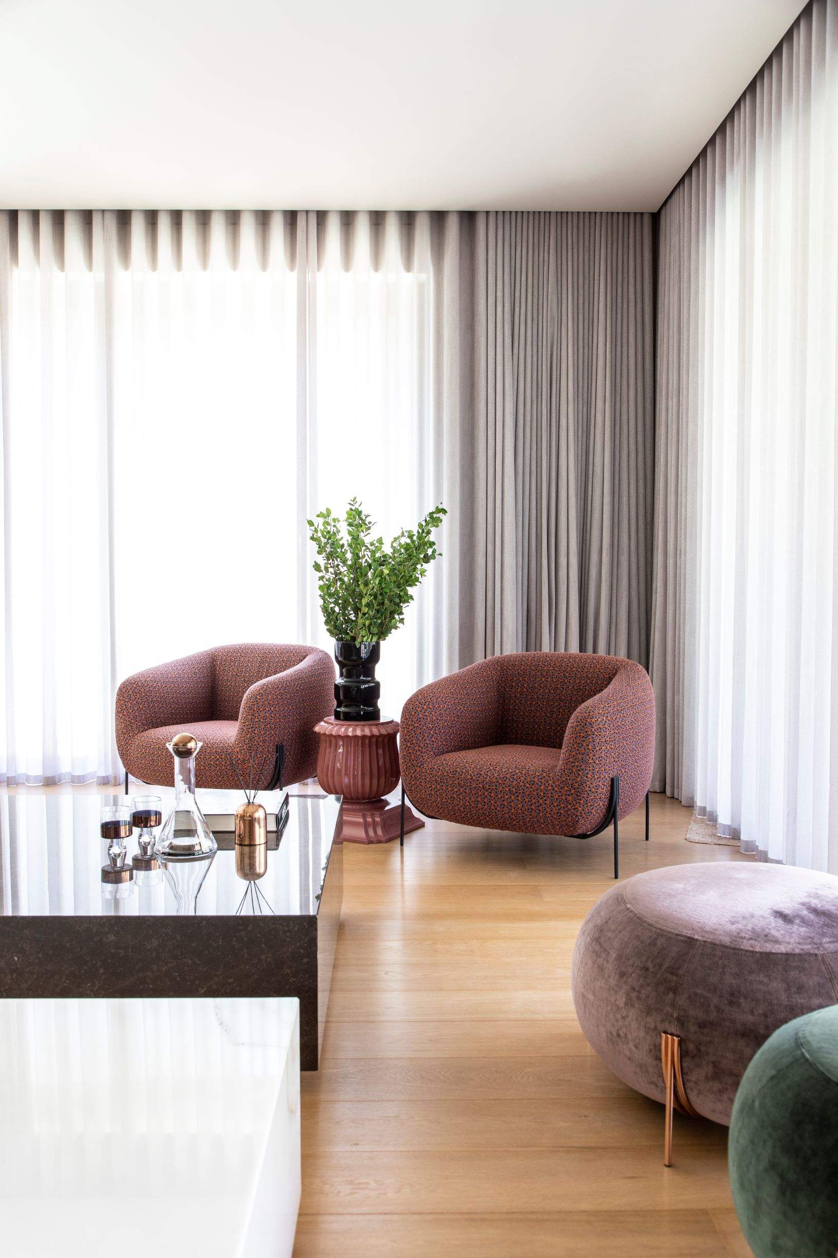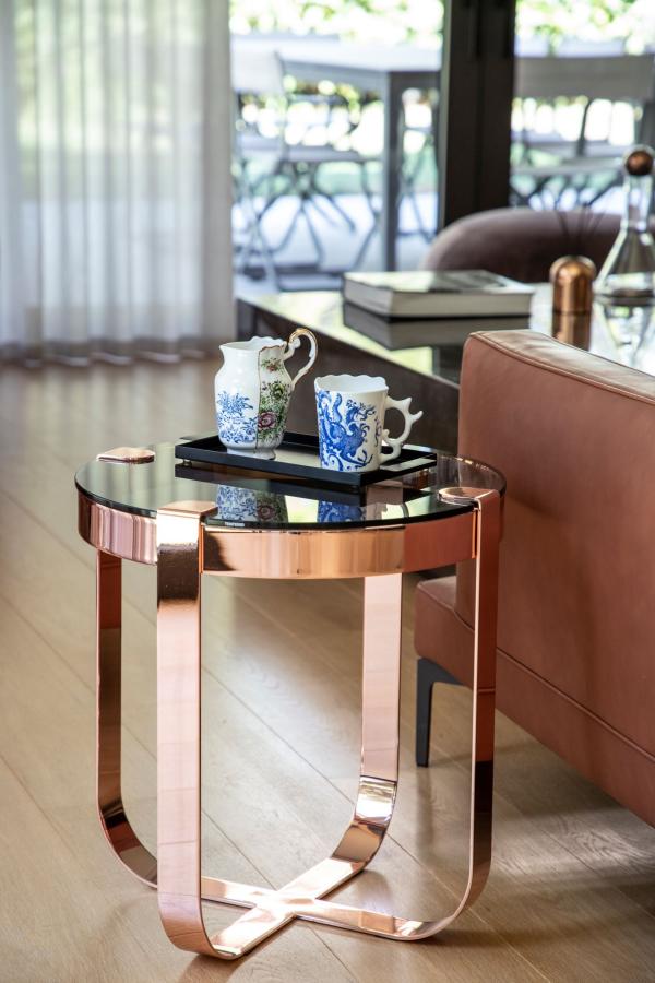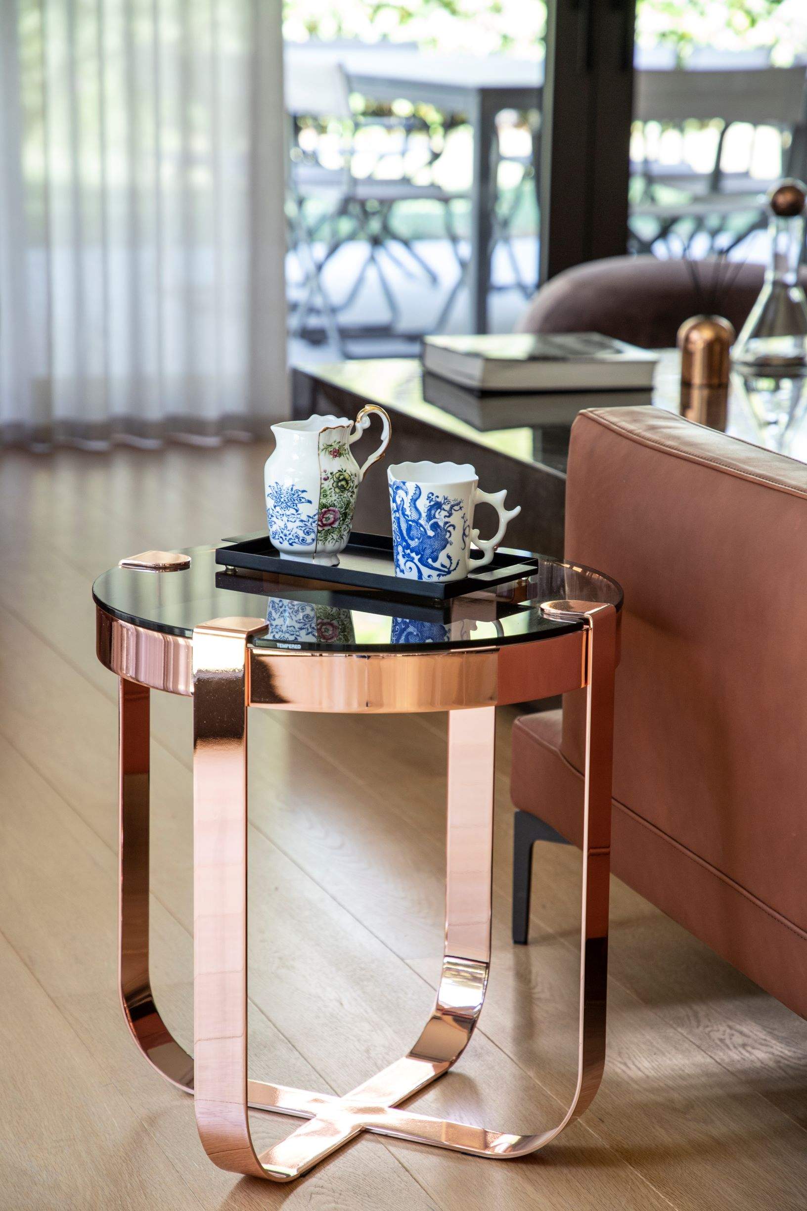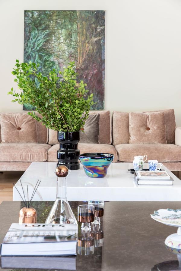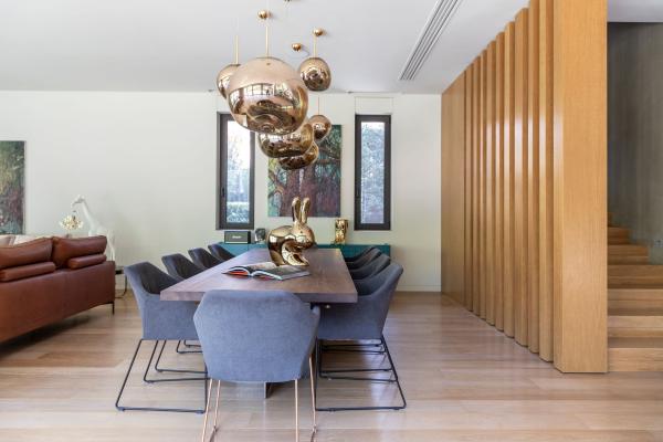 Καρυδιά, βελούδο, μάρμαρο και χρυσό τα υλικά που επιλέχθηκαν να συνδυαστούν με πίνακες, και μεγάλα ανοίγματα που περιβάλλονται από φυσικό πράσινο.