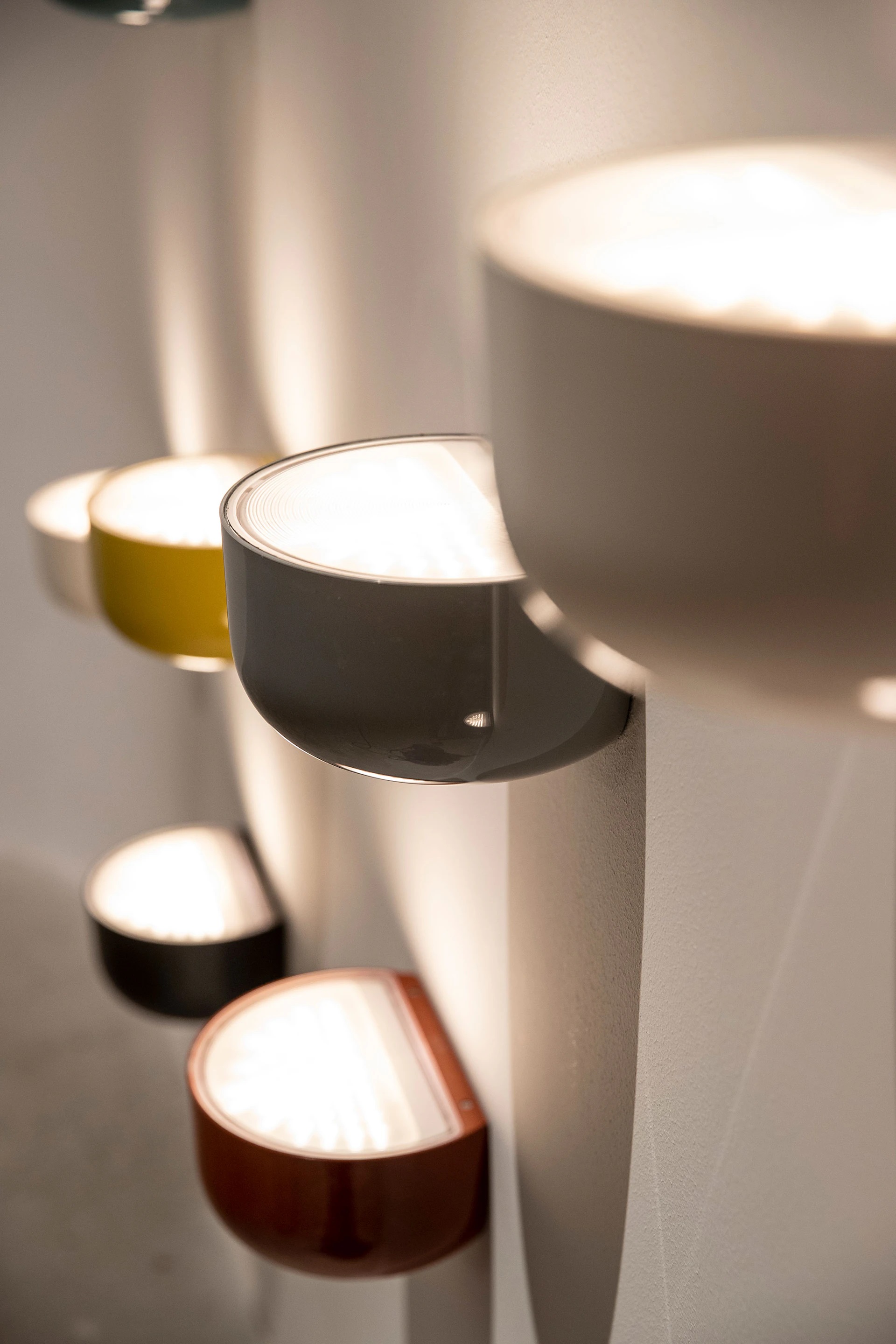 Bellhop Wall Up blends into the architecture, colorfully perching on the wall and pushing light upwards thanks to Flos’ new, high performance optic technology.