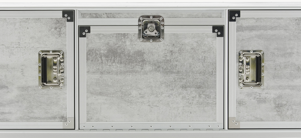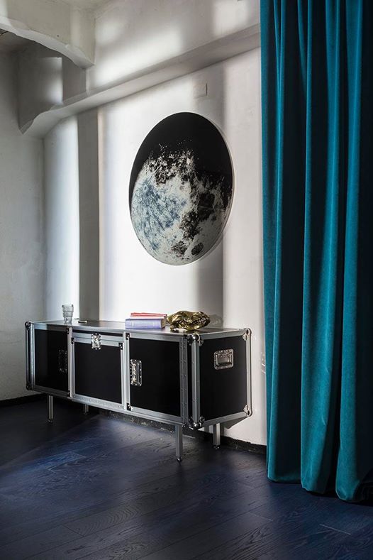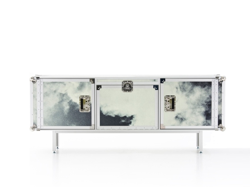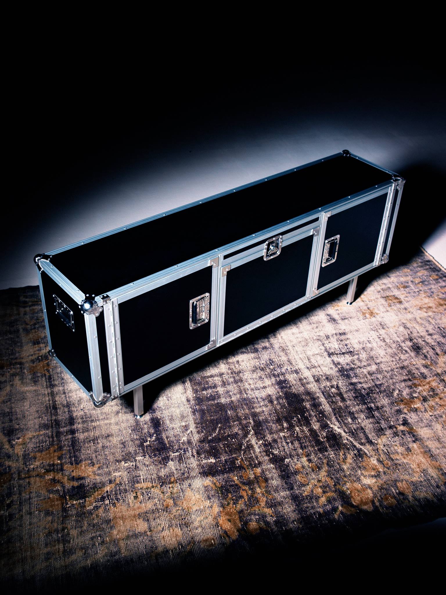 A peculiar object is the cabinet inspired by the travel case used by musicians to carry their instruments on tour.