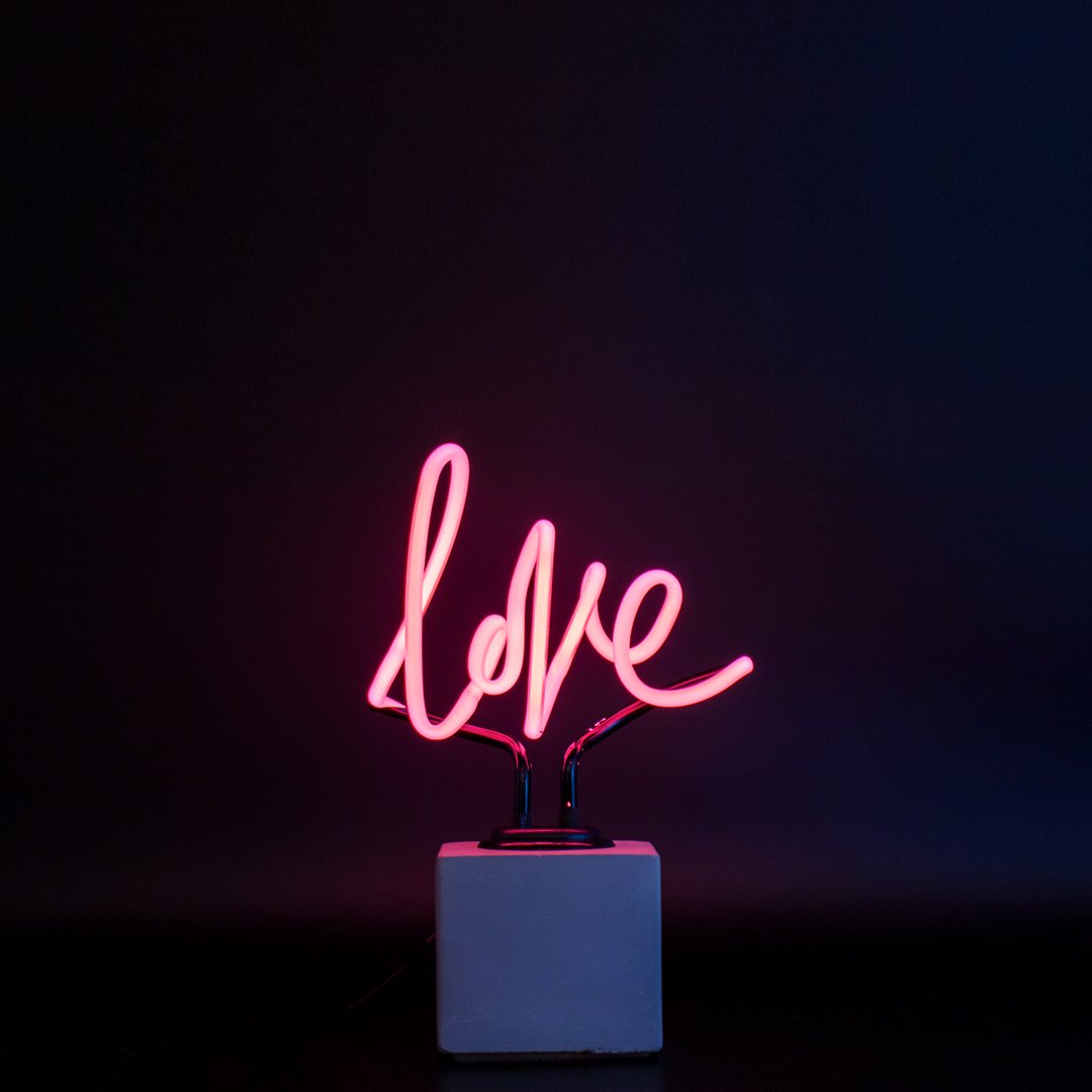 Neon Love on a cement base. Also available in heart, bar, chilly pepper